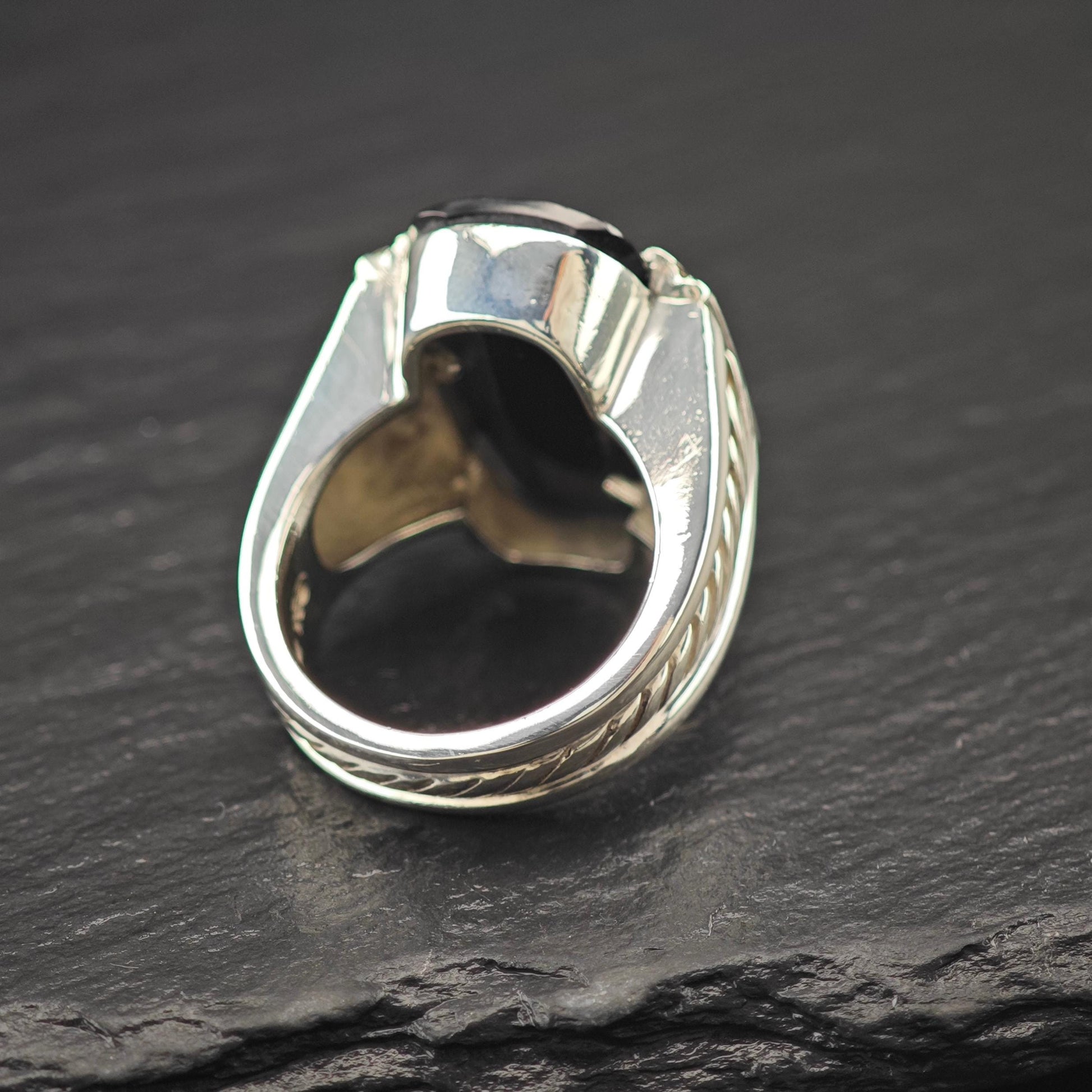 Discover the elegance of the David Yurman Diamond Black Onyx Ring, crafted in sterling silver. This exquisite piece features the signature David Yurman stamp, along with a copyright mark and "D.Y." indicating its authenticity. The ring is also marked "925," ensuring it has been tested and guaranteed to meet sterling silver standards.