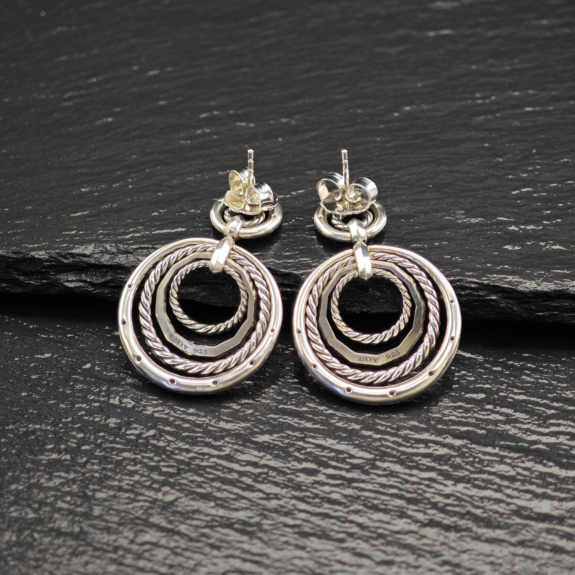 The largest stone measures 1.5 mm, and the earrings are marked with the copyright D.Y. and the numbers 925 and 585 on the posts, signifying their authenticity as 14k white gold. These earrings have been tested and are guaranteed to be sterling silver.