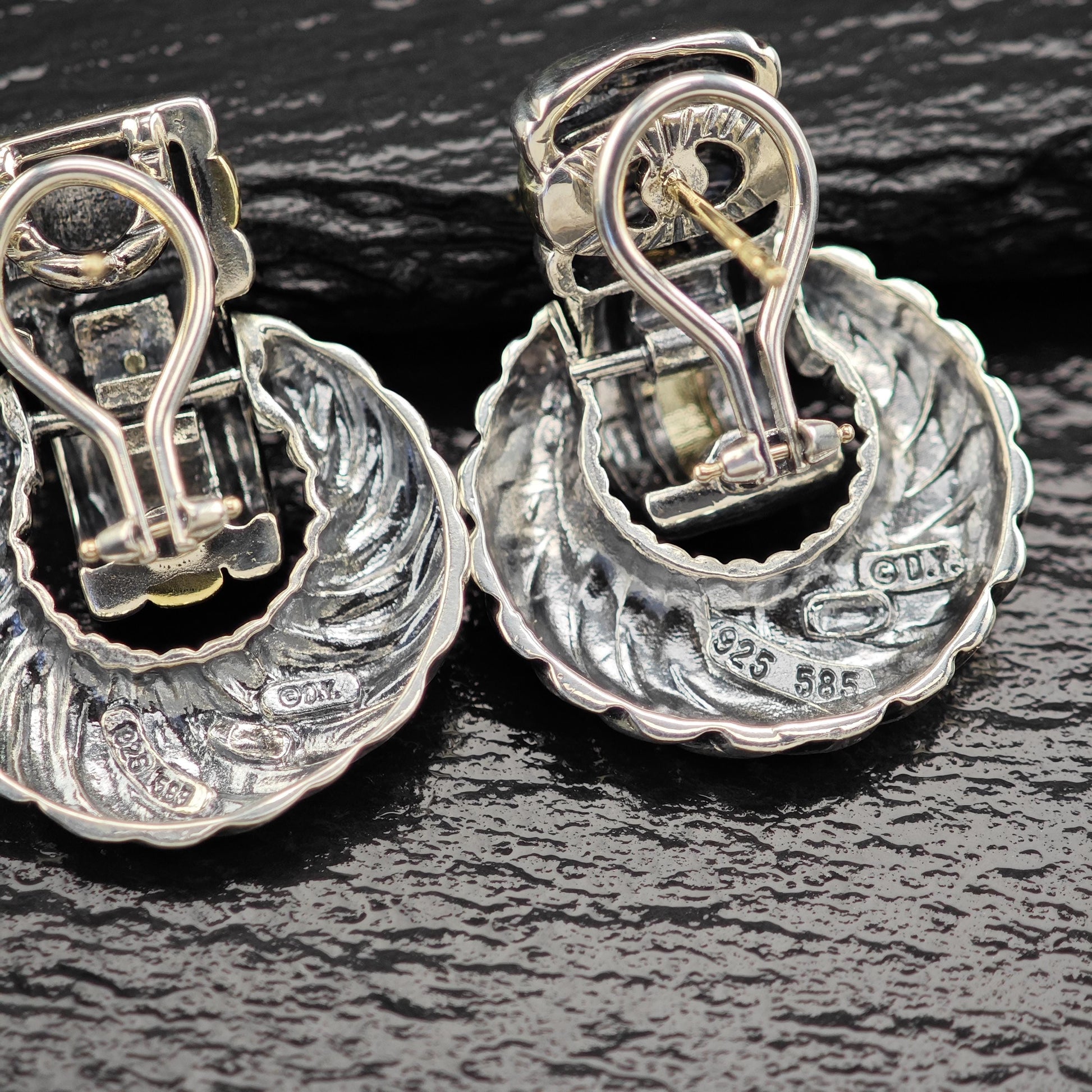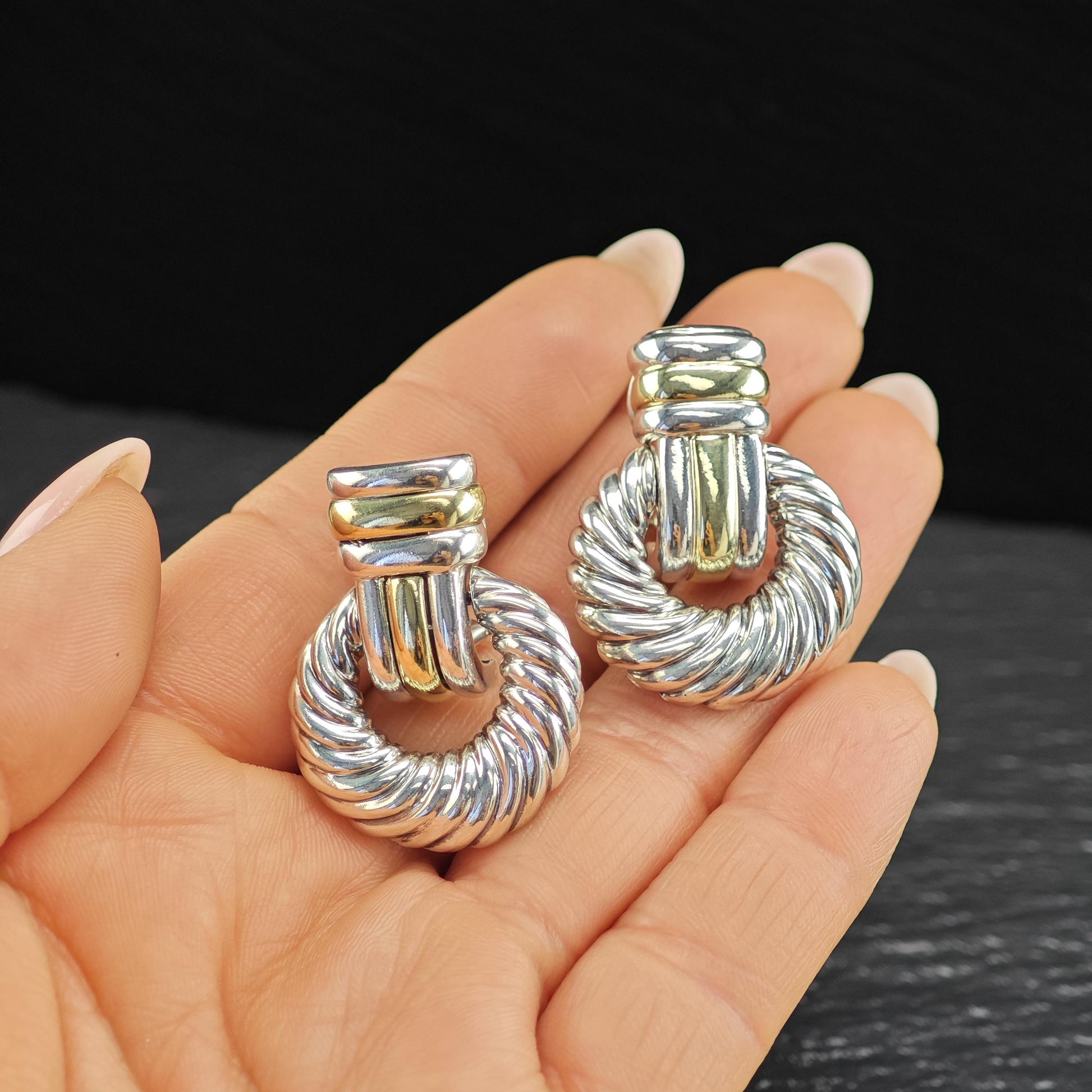 These exquisite vintage sterling silver earrings feature a stunning design with 14k gold accents, making them a perfect addition to any jewelry collection. Measuring 1 1/4 inches in length and 1 inch in width, these earrings weigh a comfortable 20.4 grams. The unique doorknocker style is enhanced by the 14k gold posts, providing both elegance and durability.