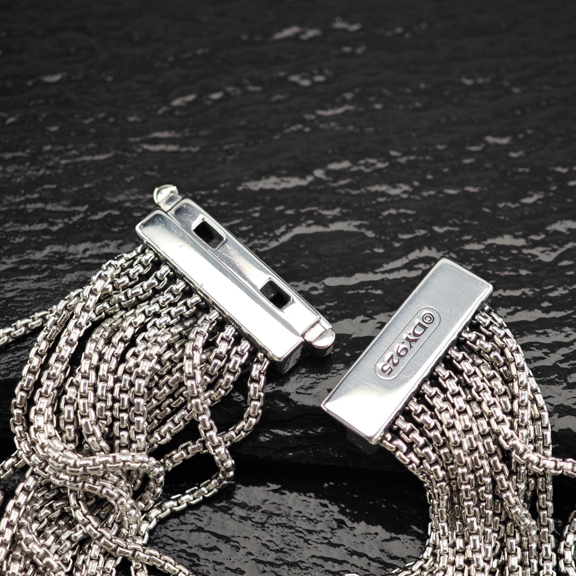 Discover the elegance of the David Yurman Pearl Bracelet, featuring a stunning multi-chain design crafted in sterling silver. This exquisite piece is stamped with the trademarks D.Y. and 925, ensuring its authenticity and quality. Designed to fit a wrist size of 7 inches, the bracelet has a lay-flat length of 7 3/8 inches and a width of 7/8 inch. Weighing 50.3 grams, this bracelet strikes the perfect balance between durability and comfort.