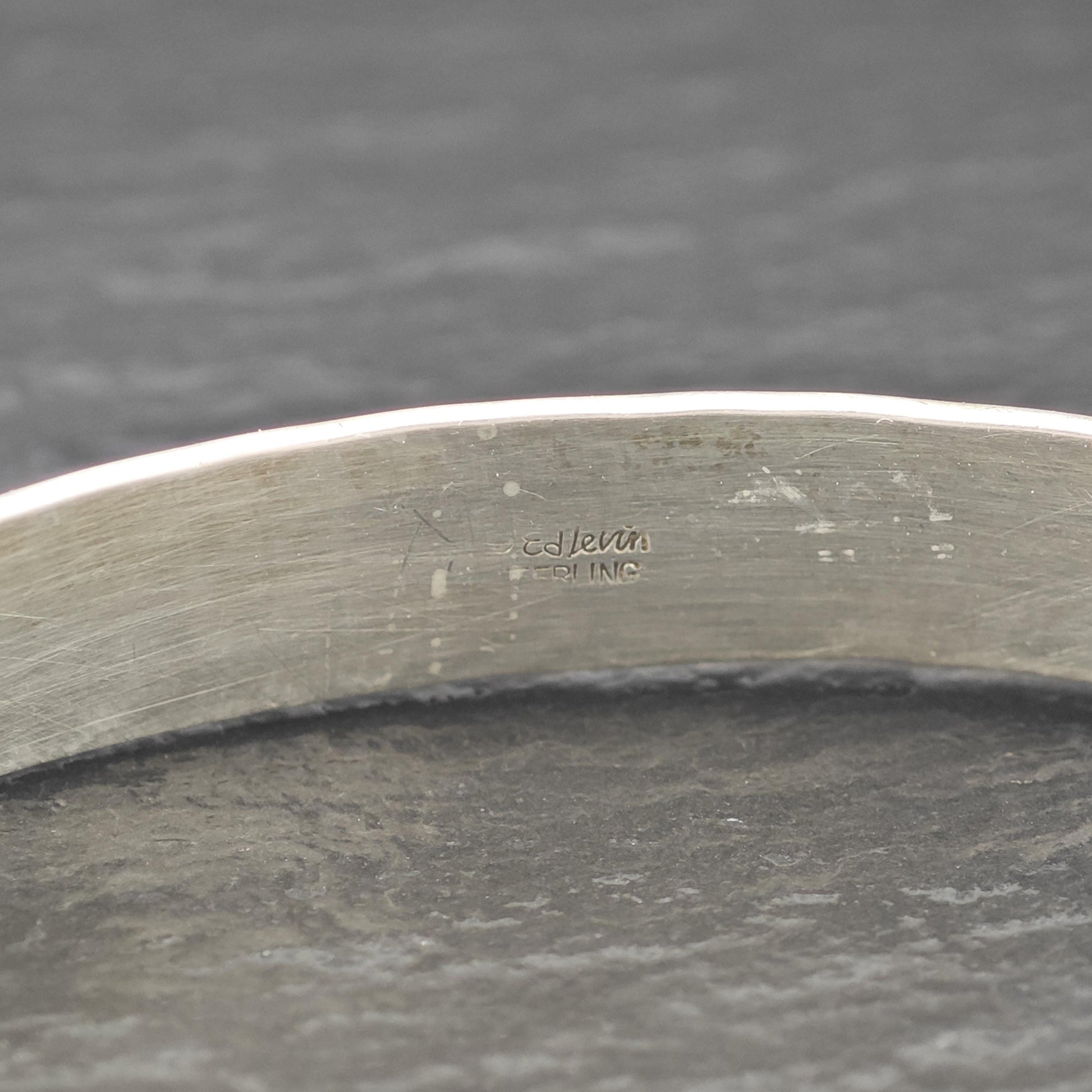 Discover the elegance of the Ed Levin Modernist Bangle Bracelet, crafted from sterling silver and designed for adjustable comfort. This stunning piece is stamped with the copyright of Ed Levin, along with "Sterling," ensuring authenticity and quality. It comfortably fits wrist sizes up to 8 inches, with a circumference length of 7 3/4 inches and a width of 3/8 inch. Weighing in at 29.9 grams, this bracelet is both substantial and stylish.