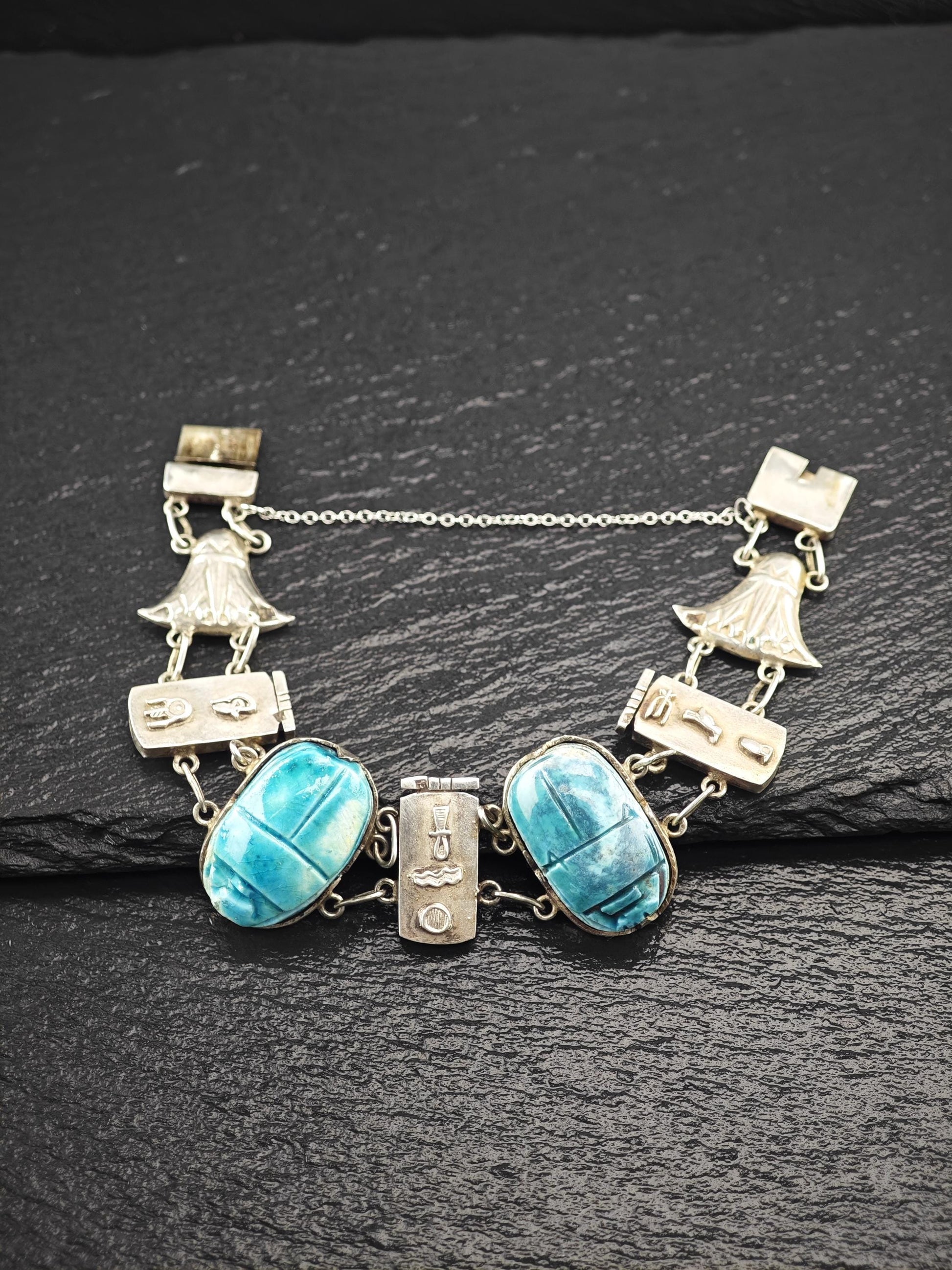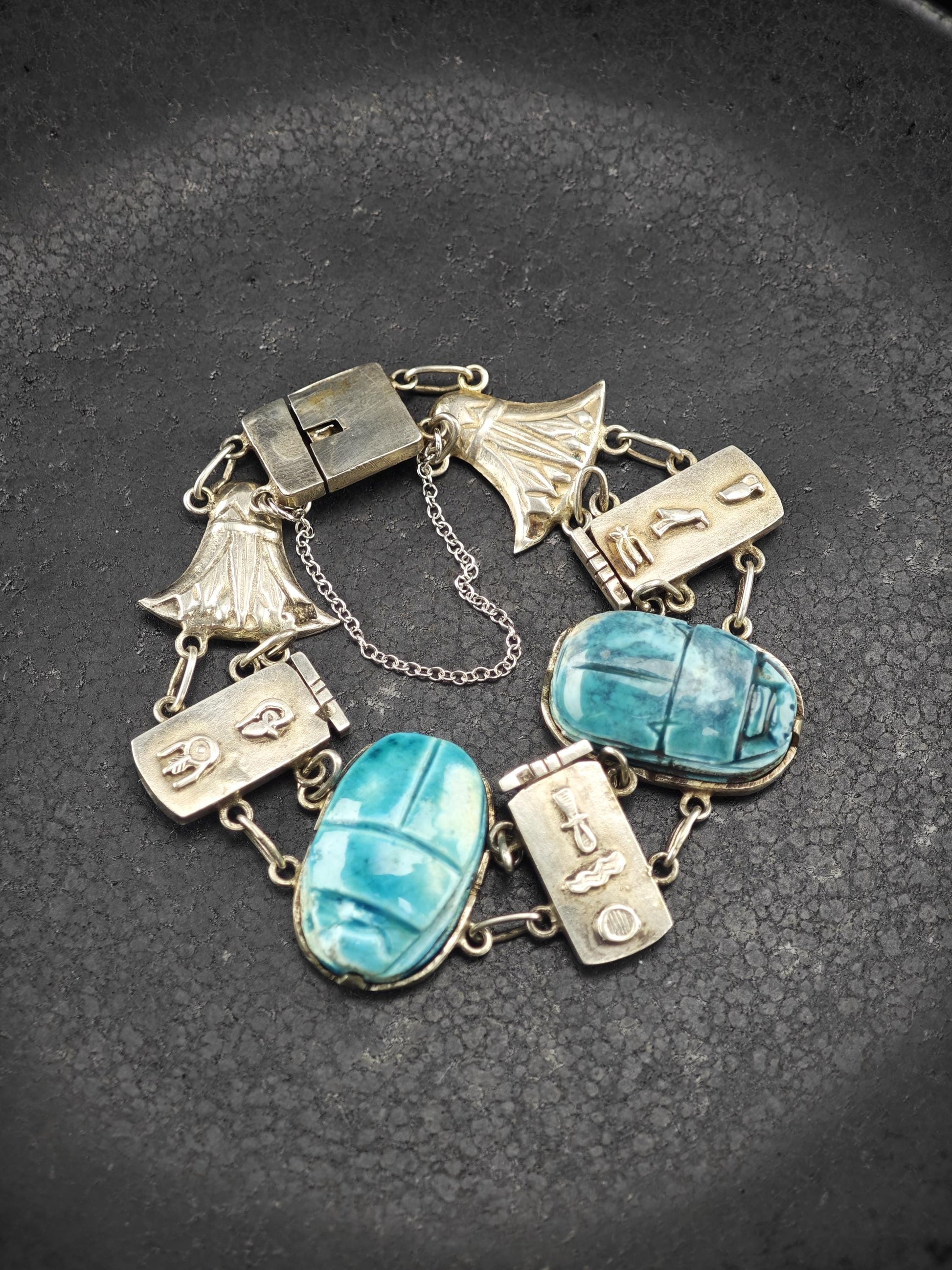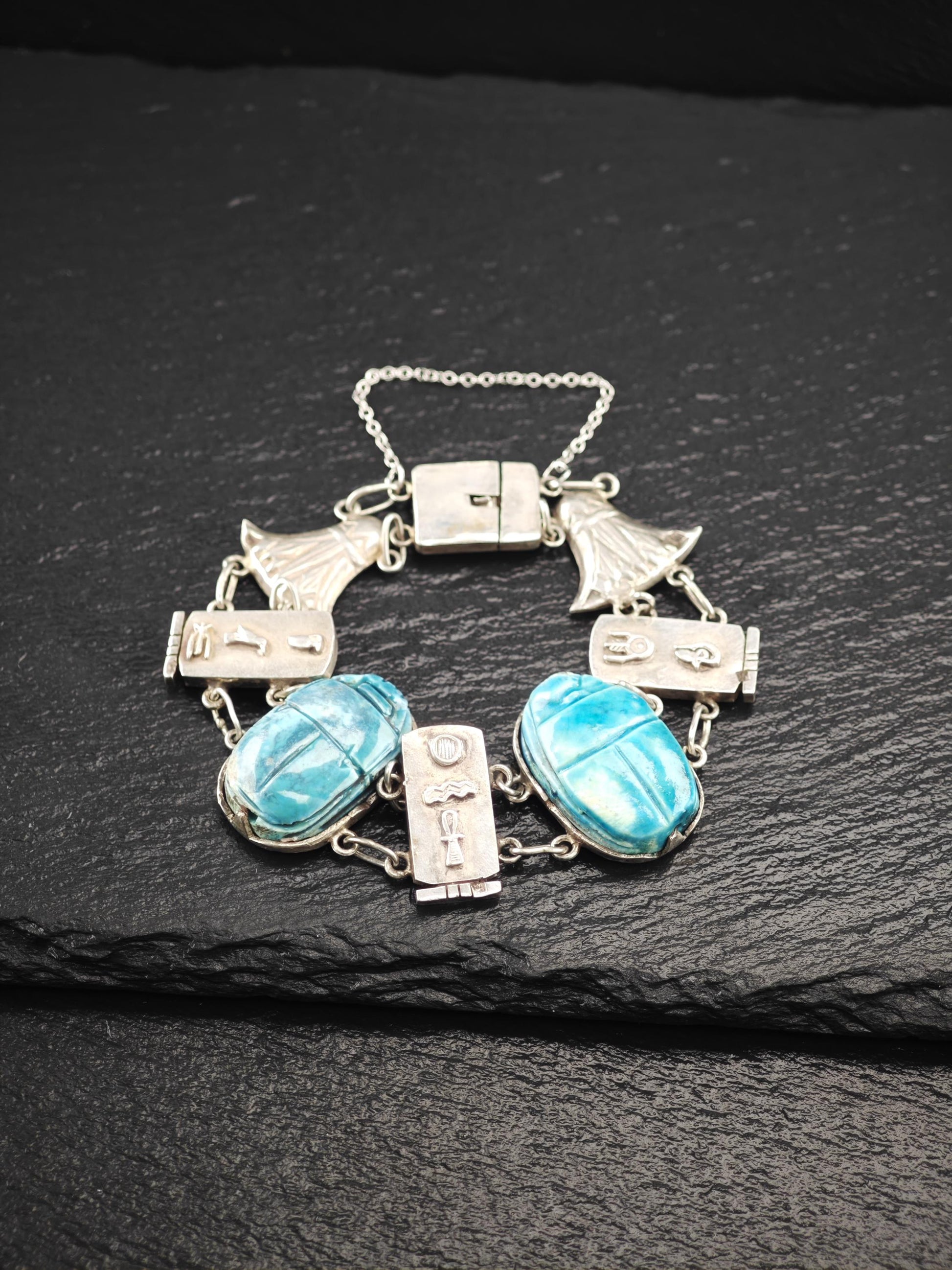 Vintage Egyptian Revival Cartouche & Carved Scarab Bracelet Sterling Silver