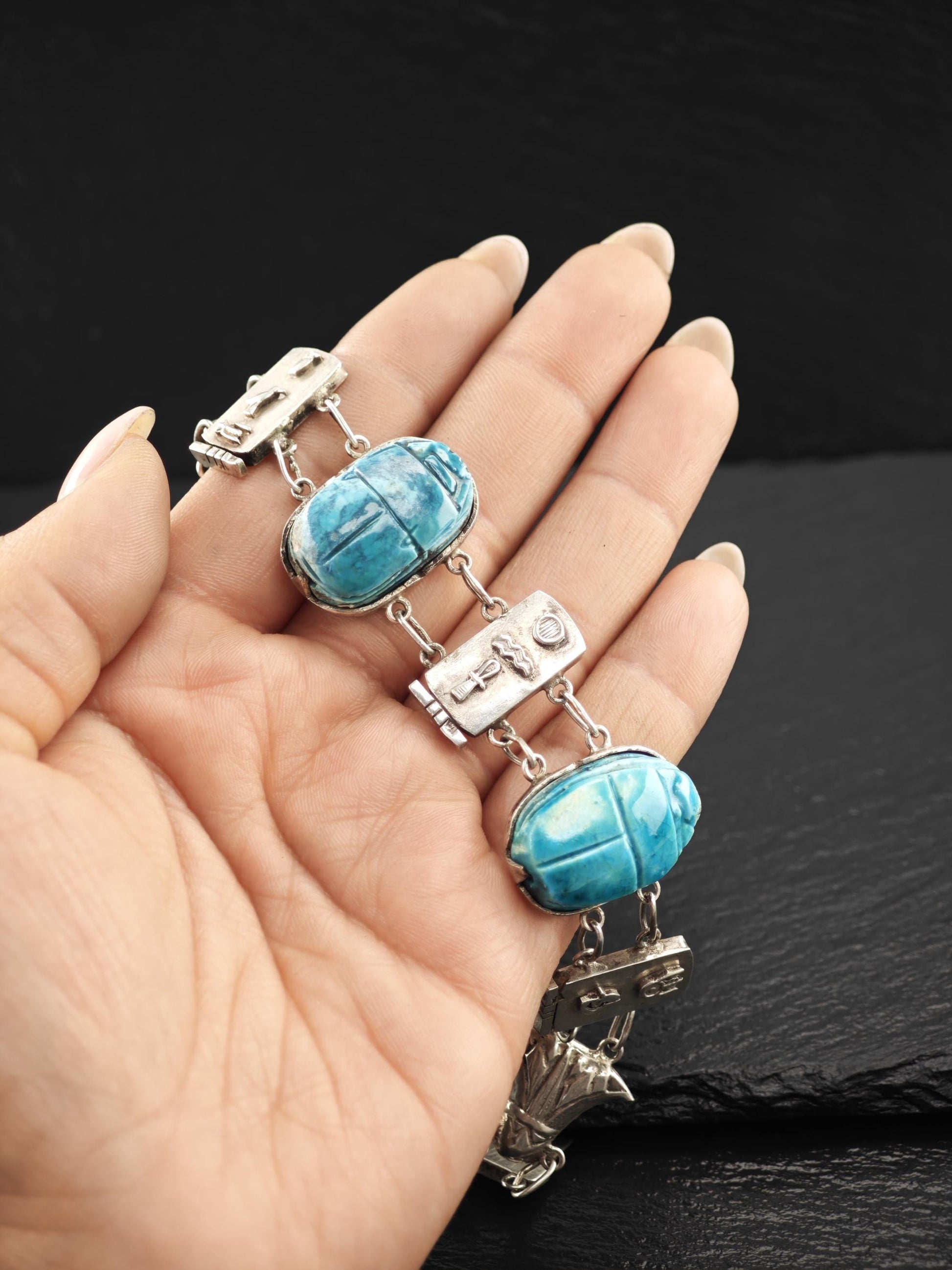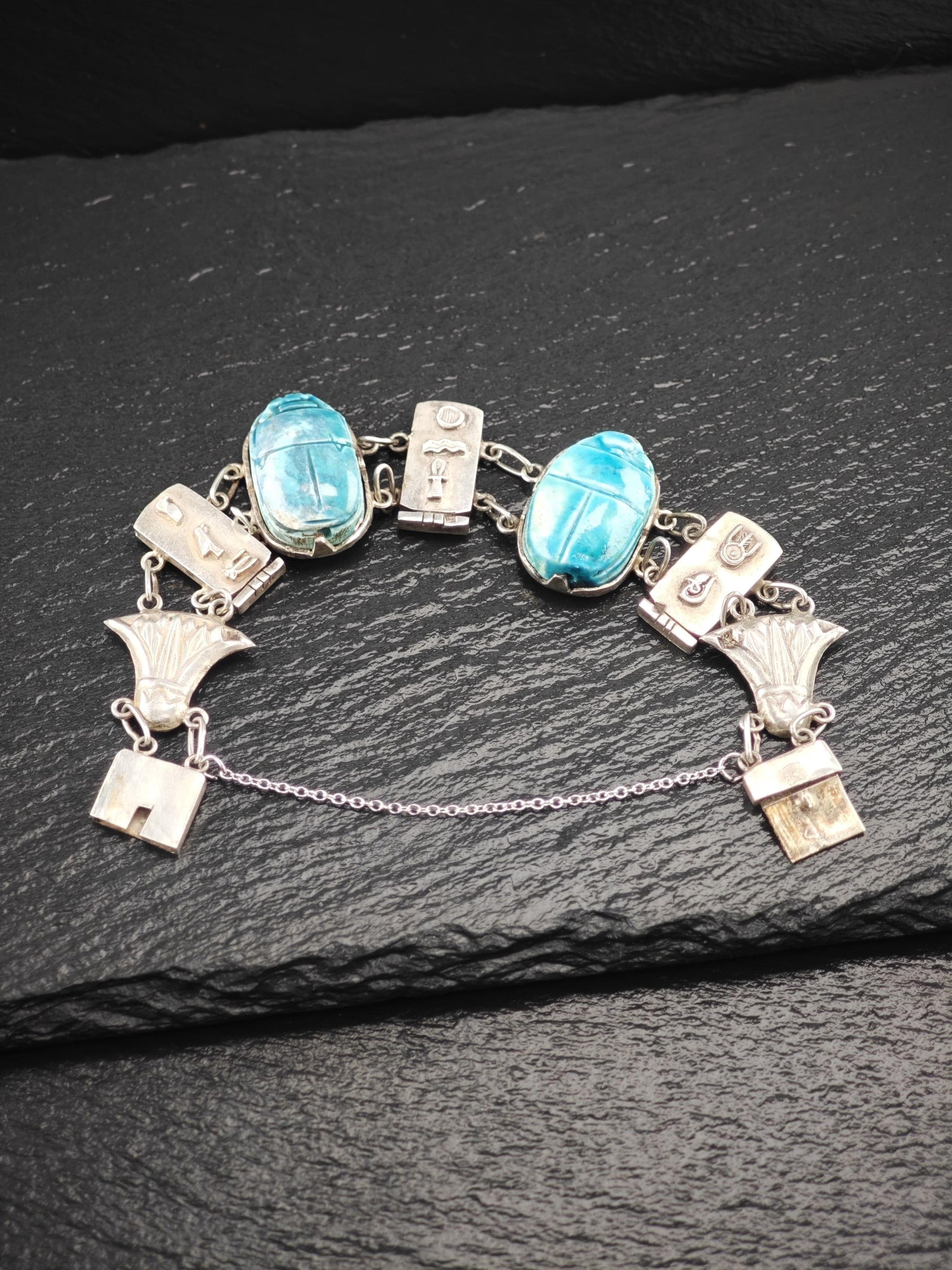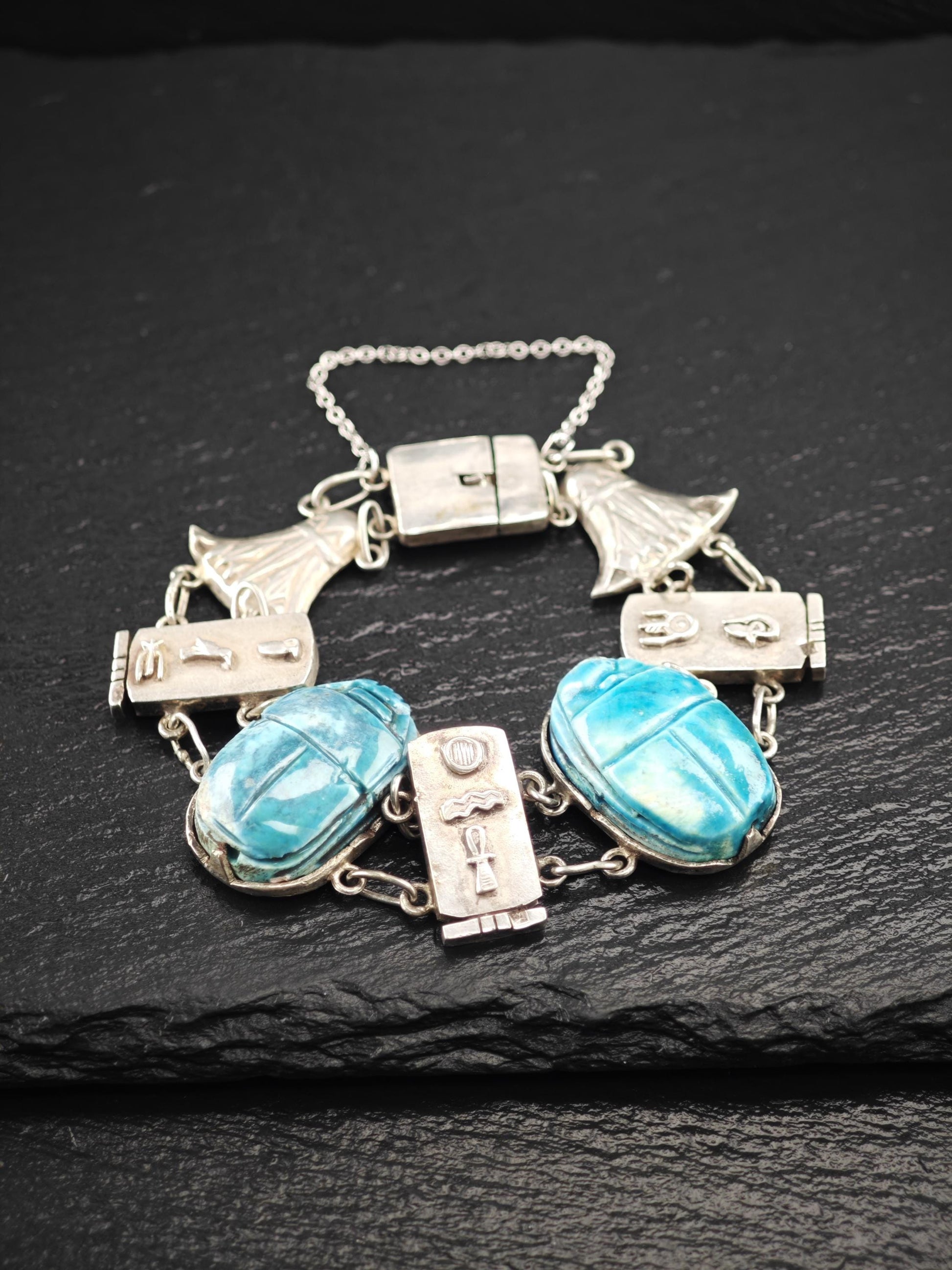 Vintage Egyptian Revival Cartouche & Carved Scarab Bracelet Sterling Silver