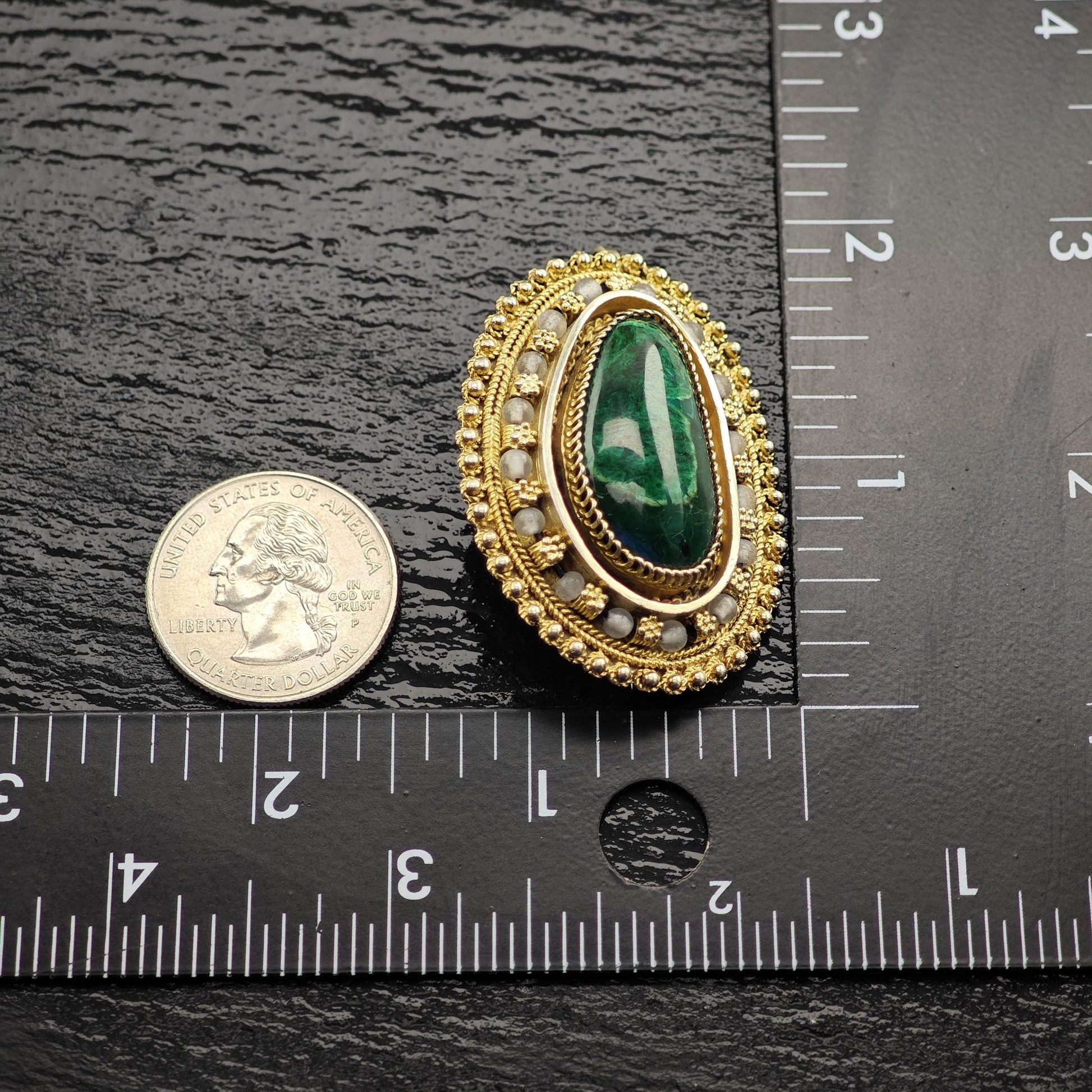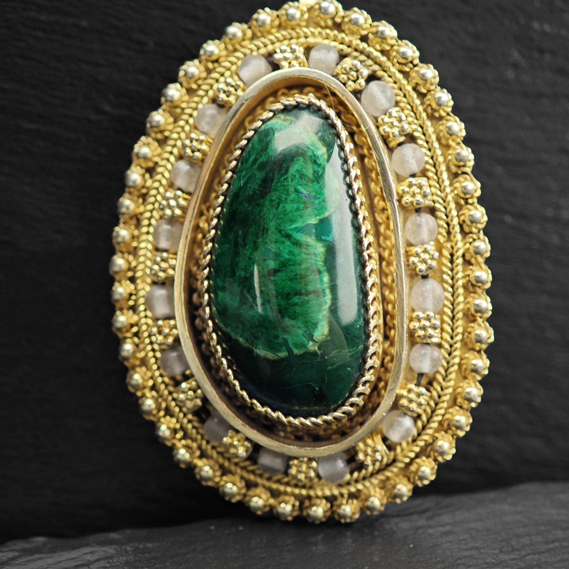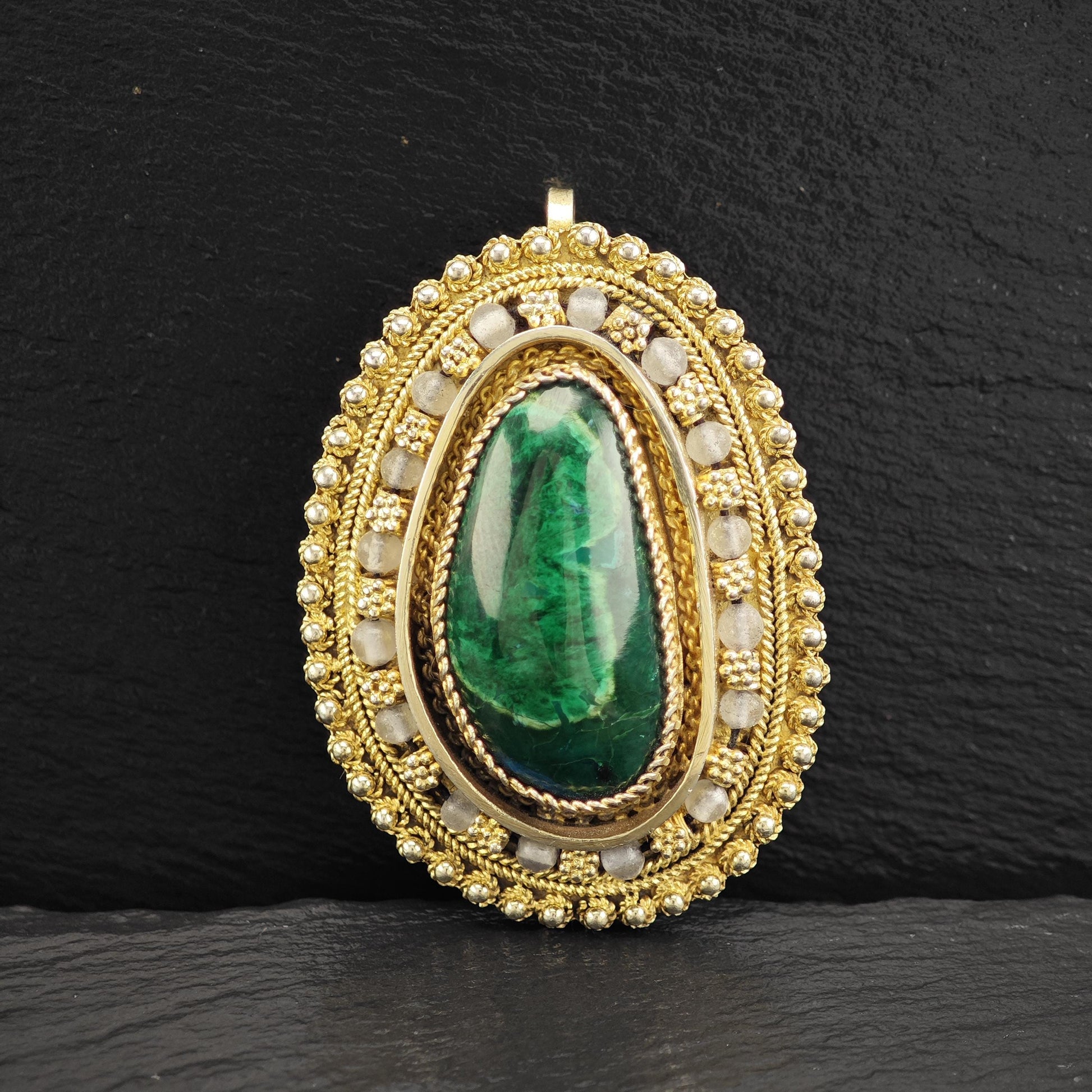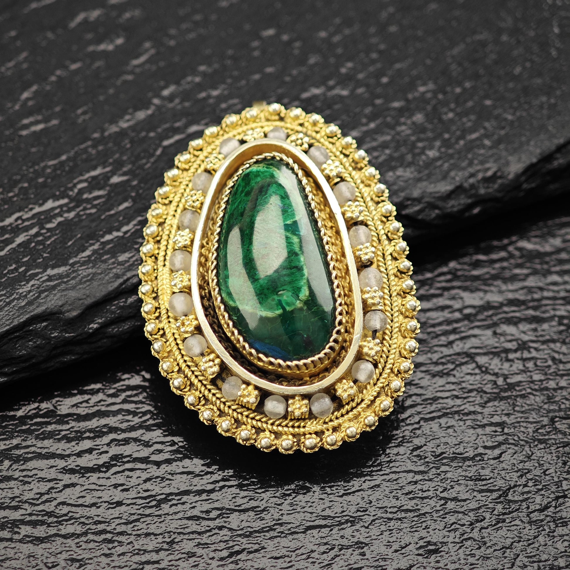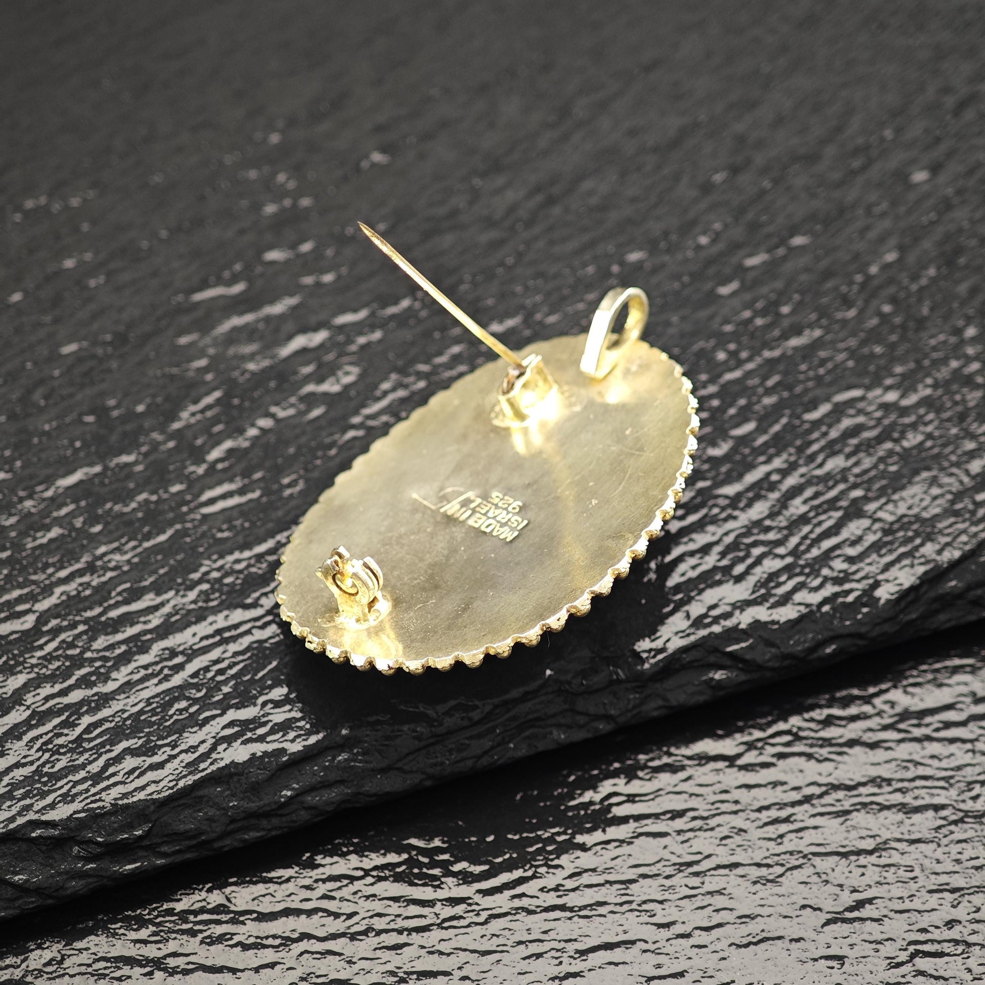 Eilat Stone Pendant/Brooch in Sterling Silver, Gold Gilded with Imitation Pearls