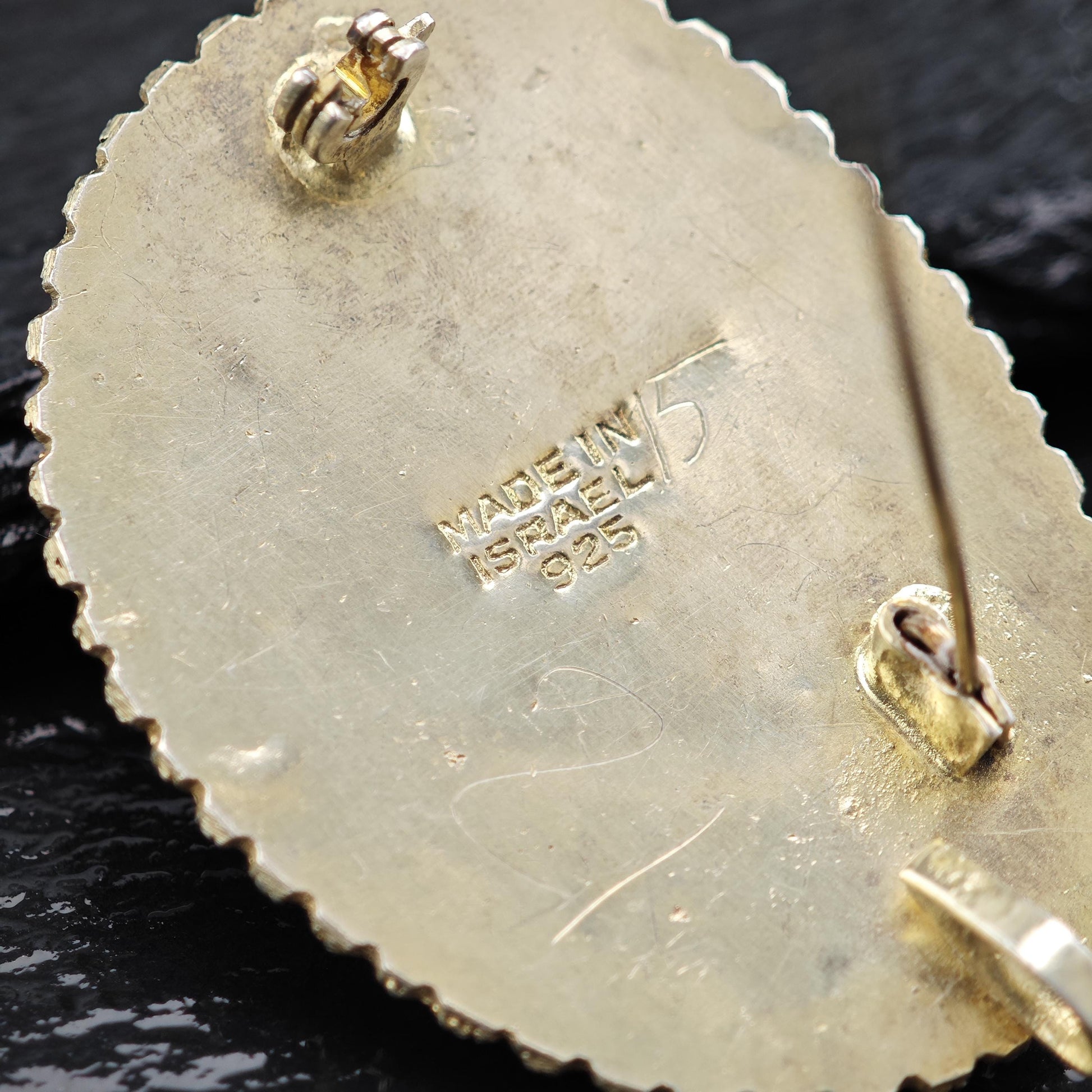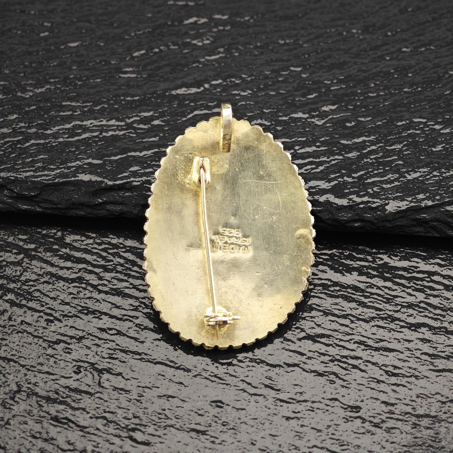 Discover this exquisite vintage pendant/brooch featuring stunning Eilat stone set in sterling silver with gold gilding, complemented by elegant imitation pearls. Crafted in Israel, this unique piece showcases the artistry of its origins, stamped with "Made in Israel" and the hallmark "925," along with hand-sketched numbers 21 and 15.