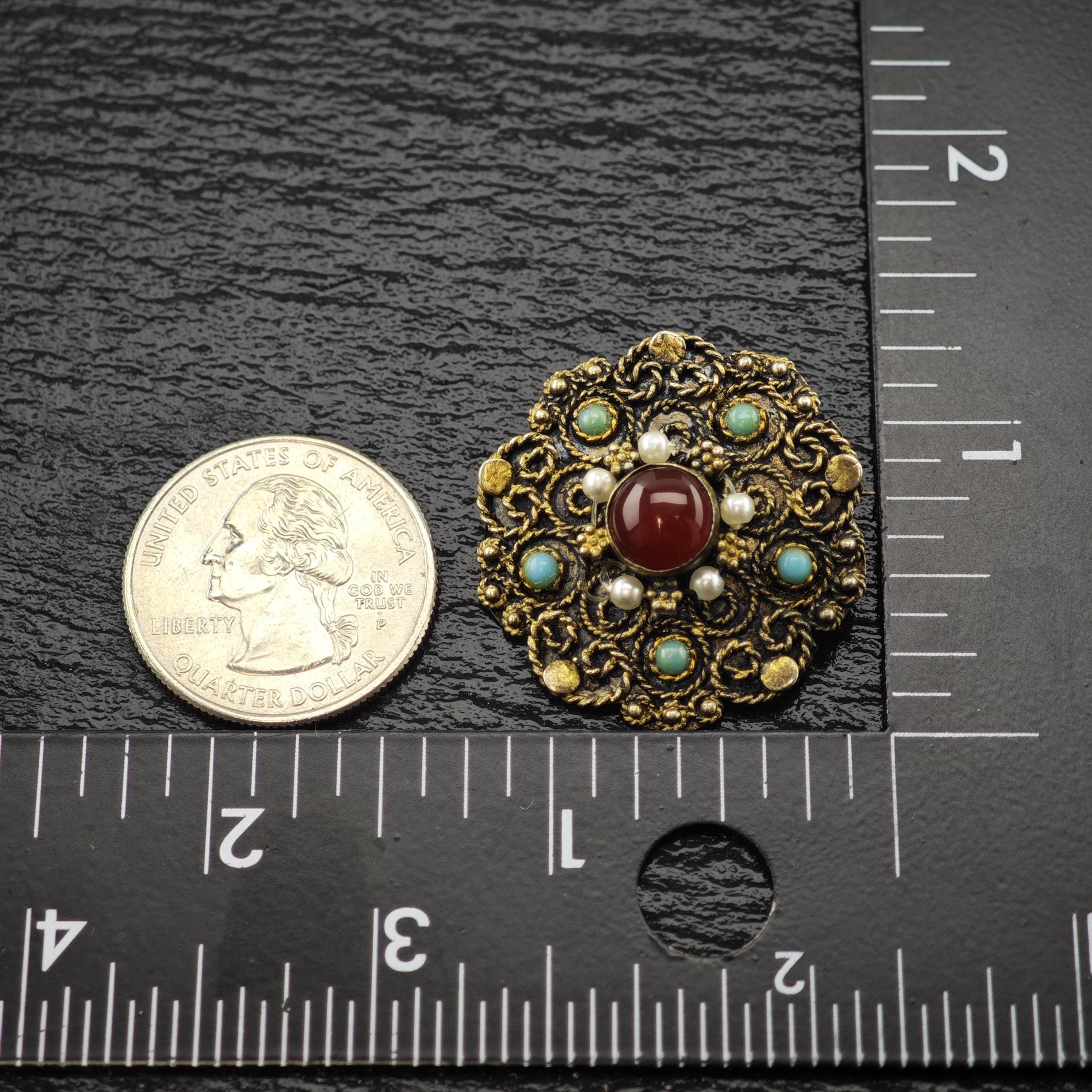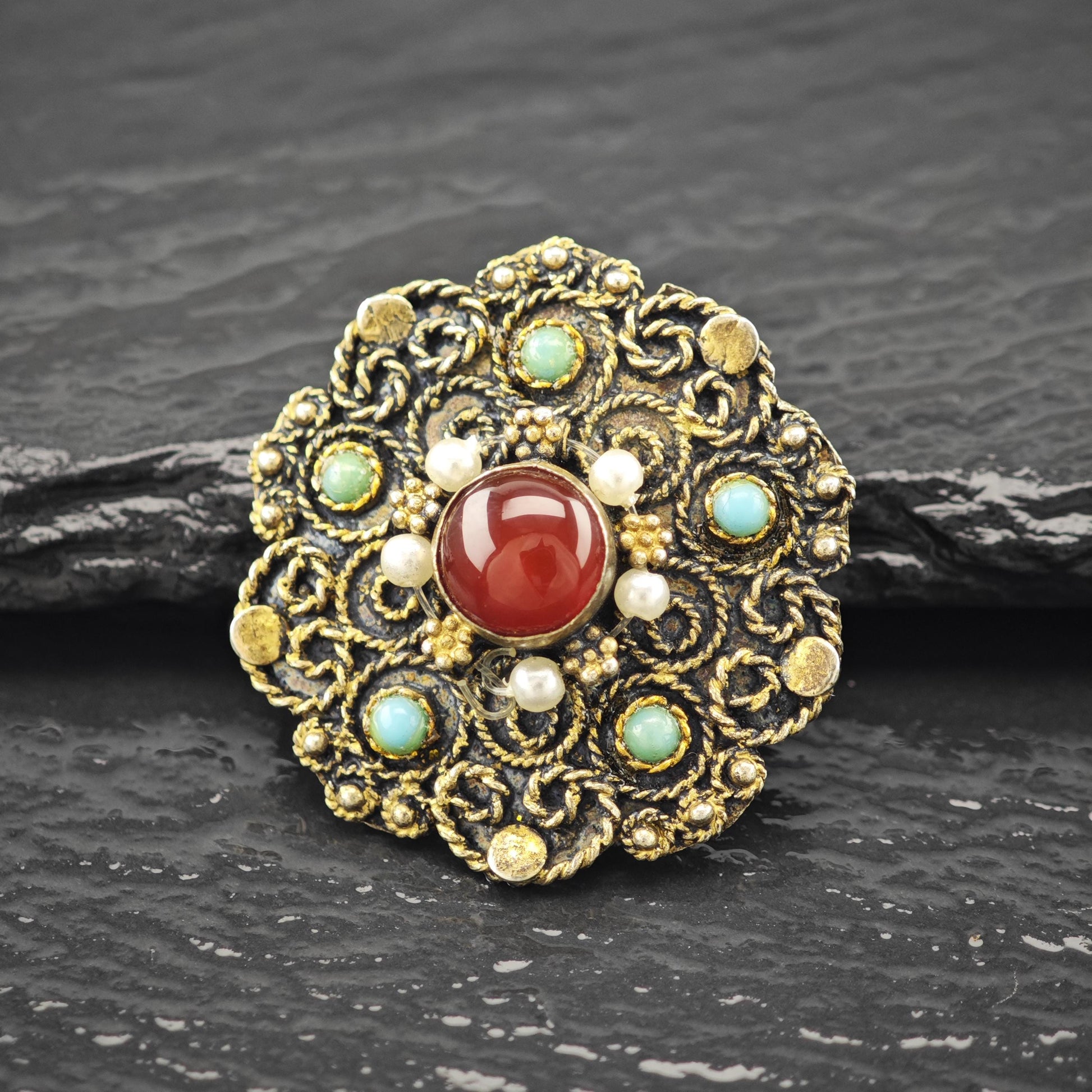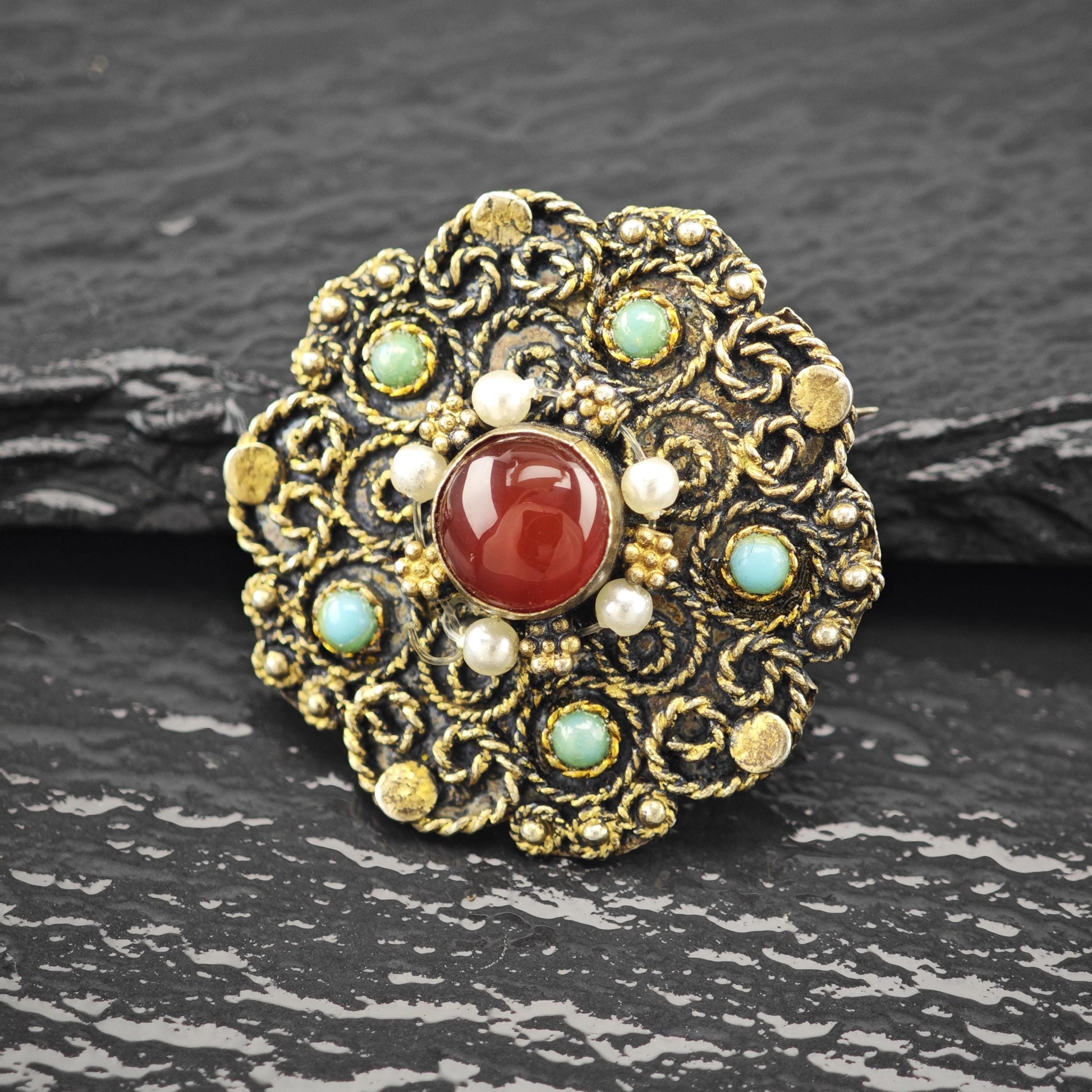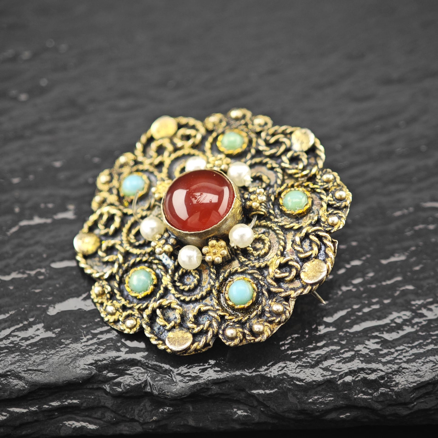 Filigree Pearl, Gemstone Gold Gilded Brooch/Pendant Sterling Silver