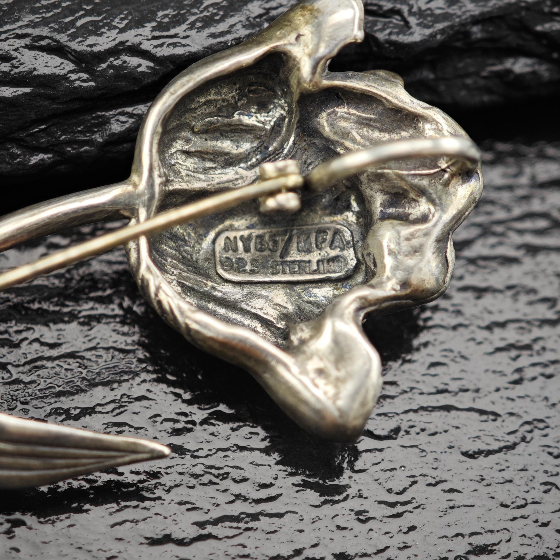 This piece bears the markings NYBG/MFA, 925, and Sterling, ensuring its authenticity as tested and guaranteed sterling silver. The condition of the brooch is good, featuring light cleaning and some patina, reflecting its age and character.