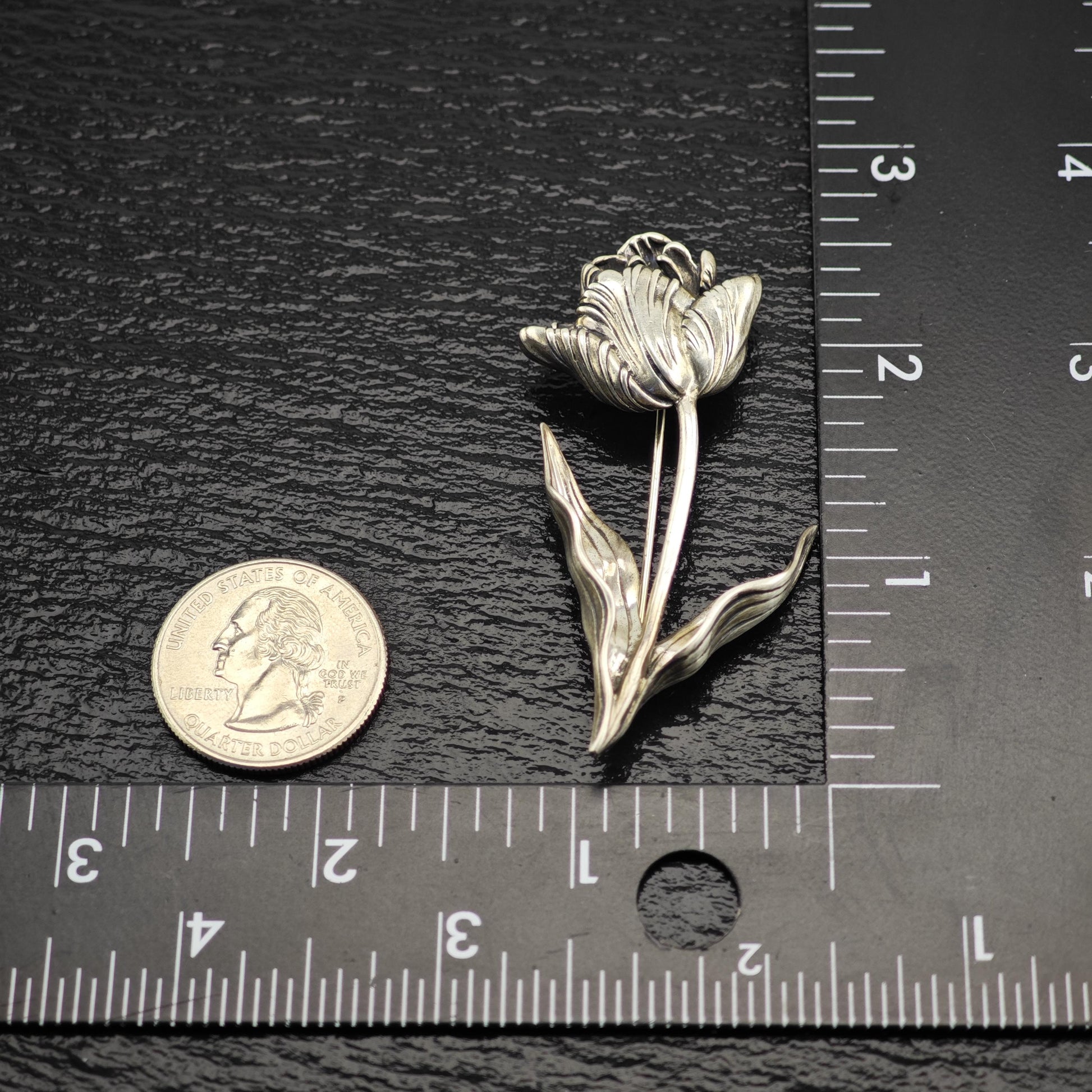 Measuring 2 1/2 inches in length and 1 1/2 inches in width, this brooch has a weight of 13.6 grams, providing a substantial yet comfortable wear. The intricate floral motif is complemented by the shimmering silver tone, which is even more striking in person.