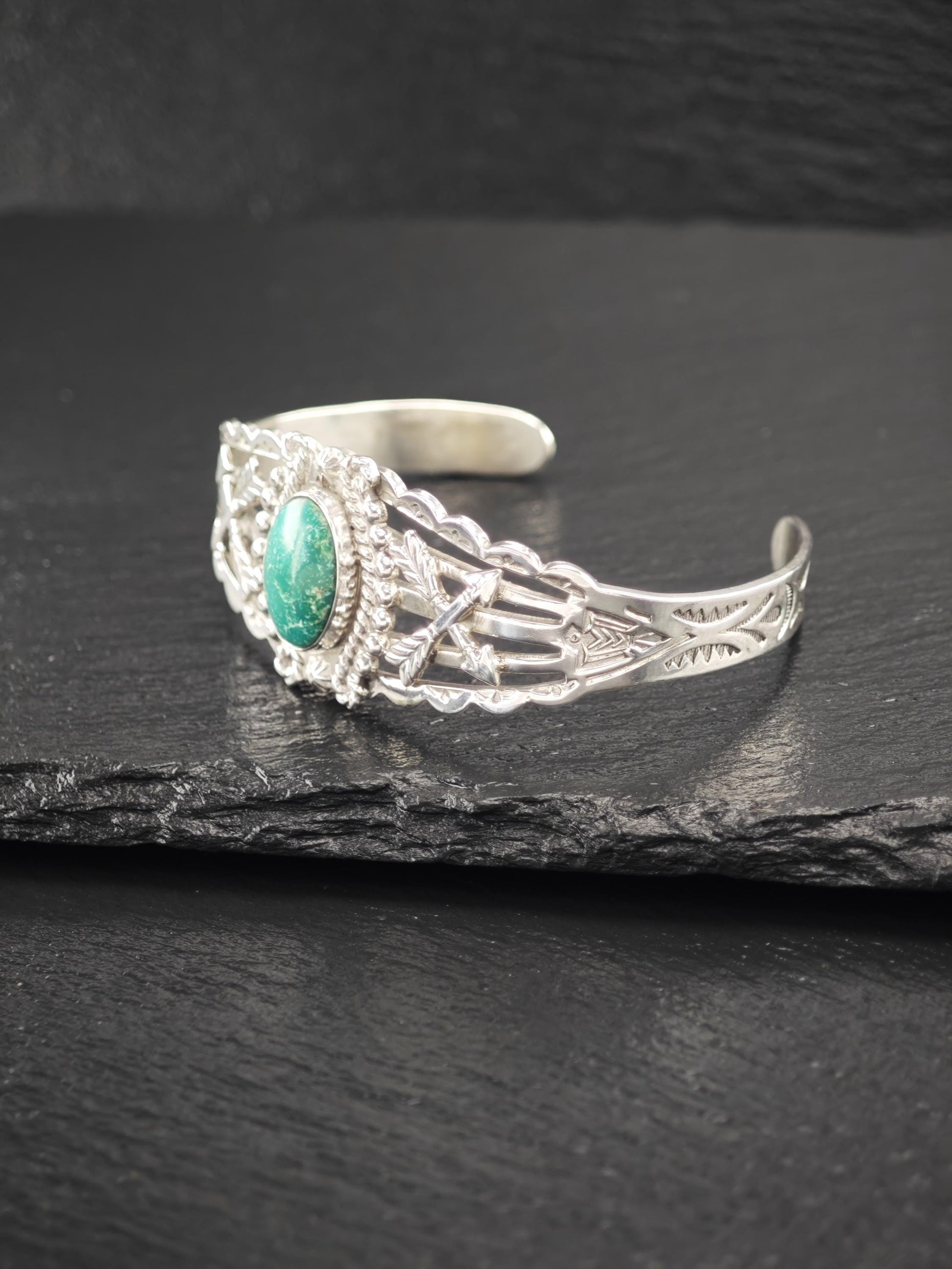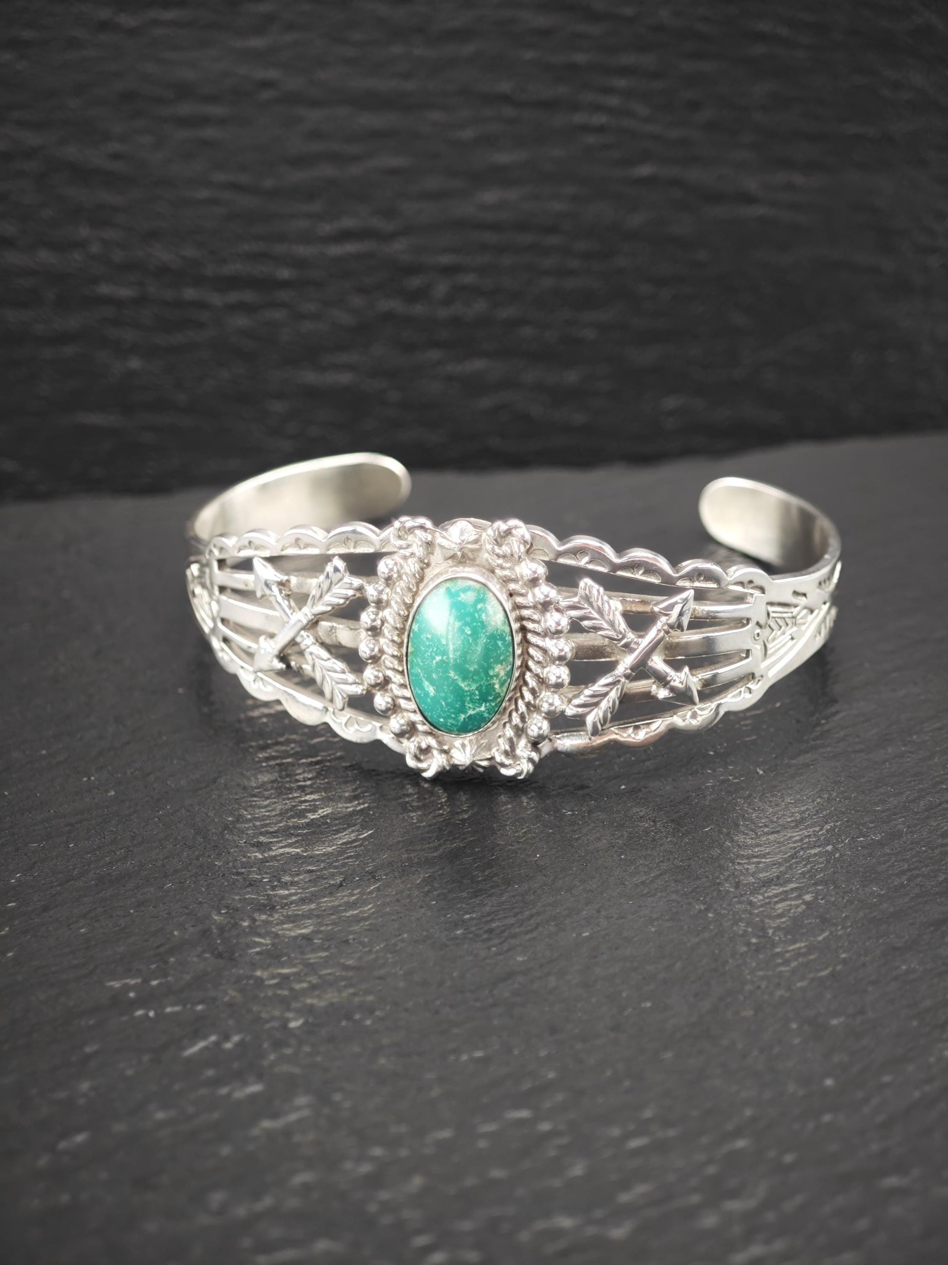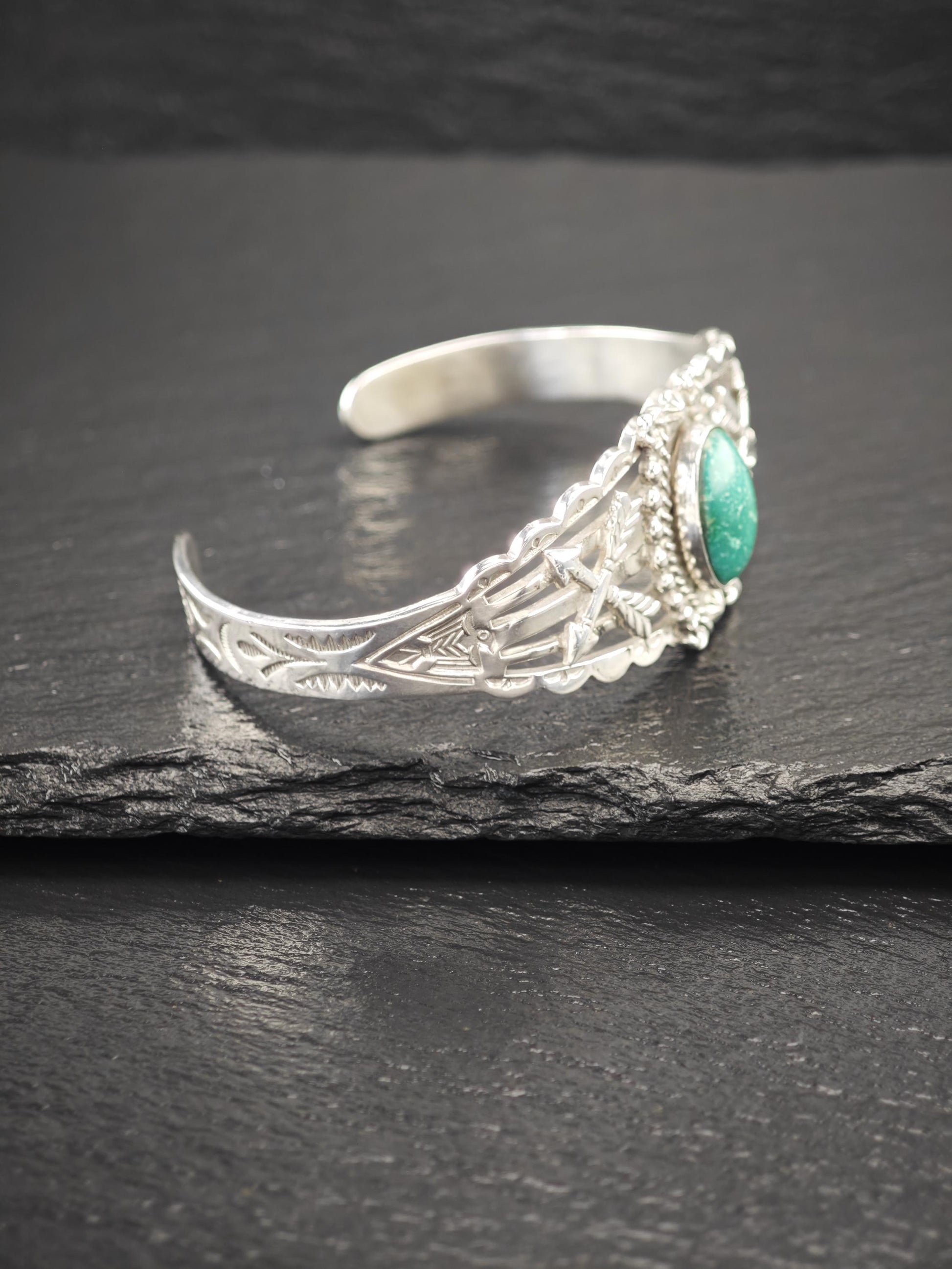 Fred Harvey Era Native American Green Turquoise, Oval Cuff Bracelet Sterling Silver