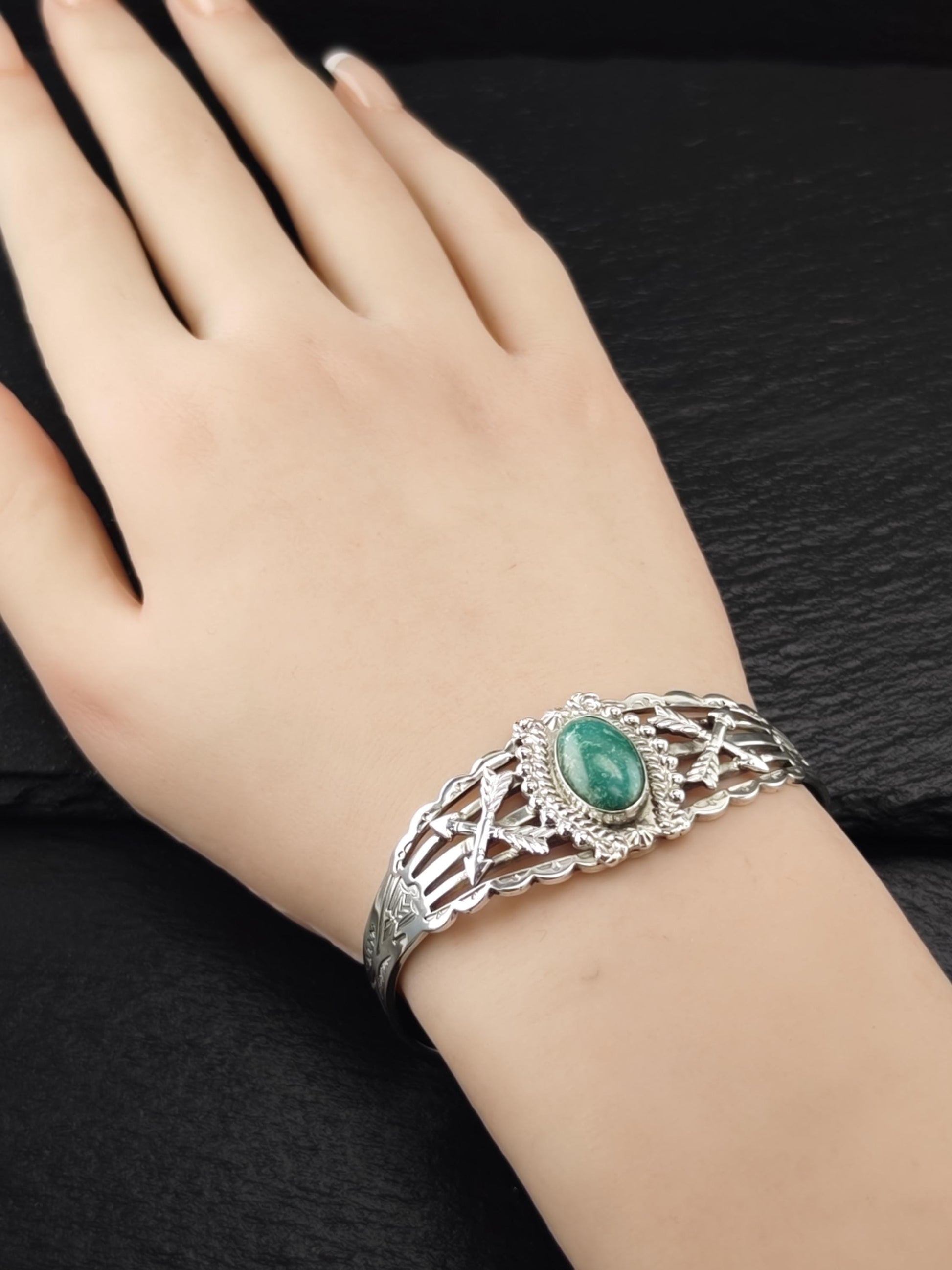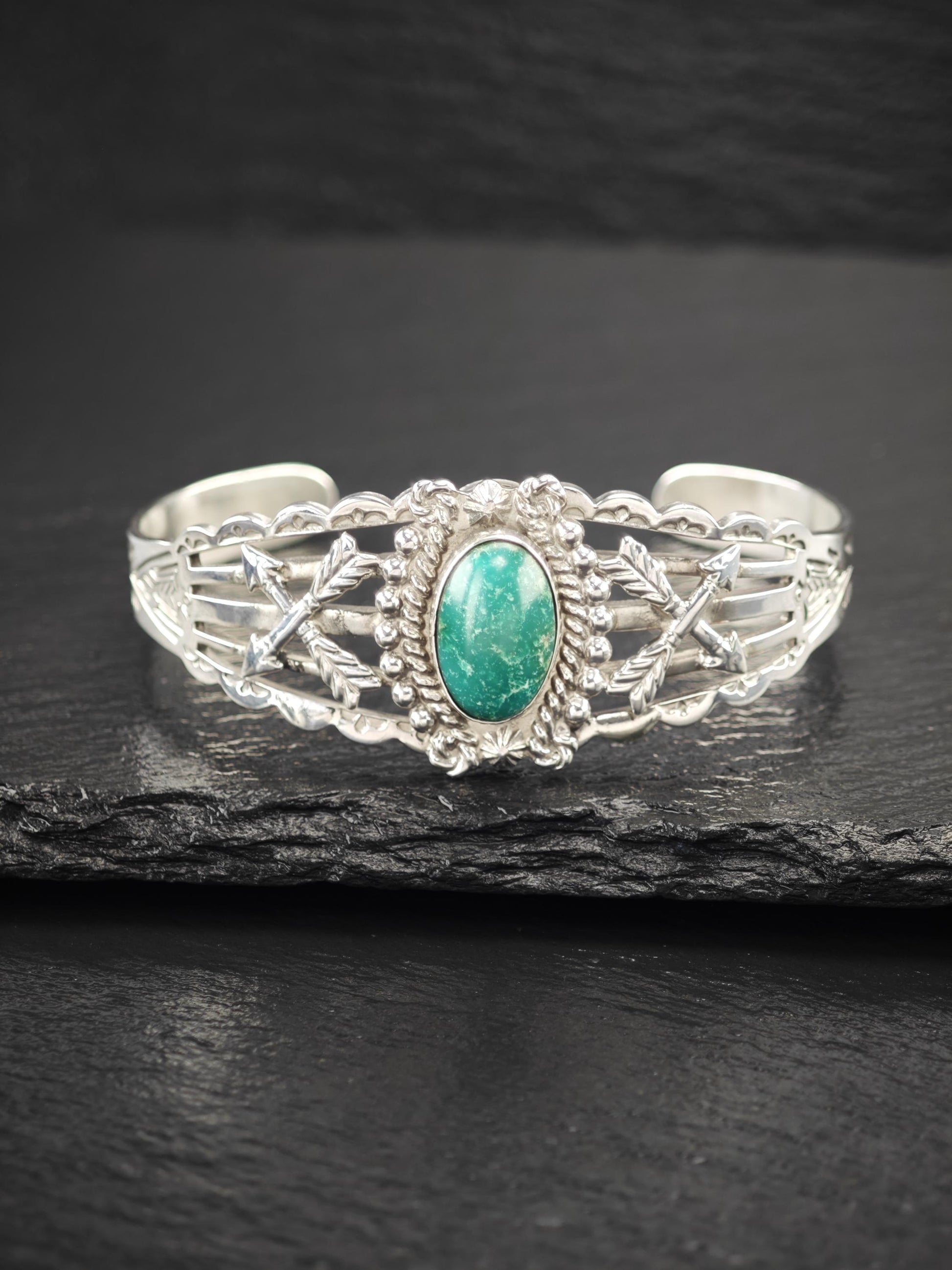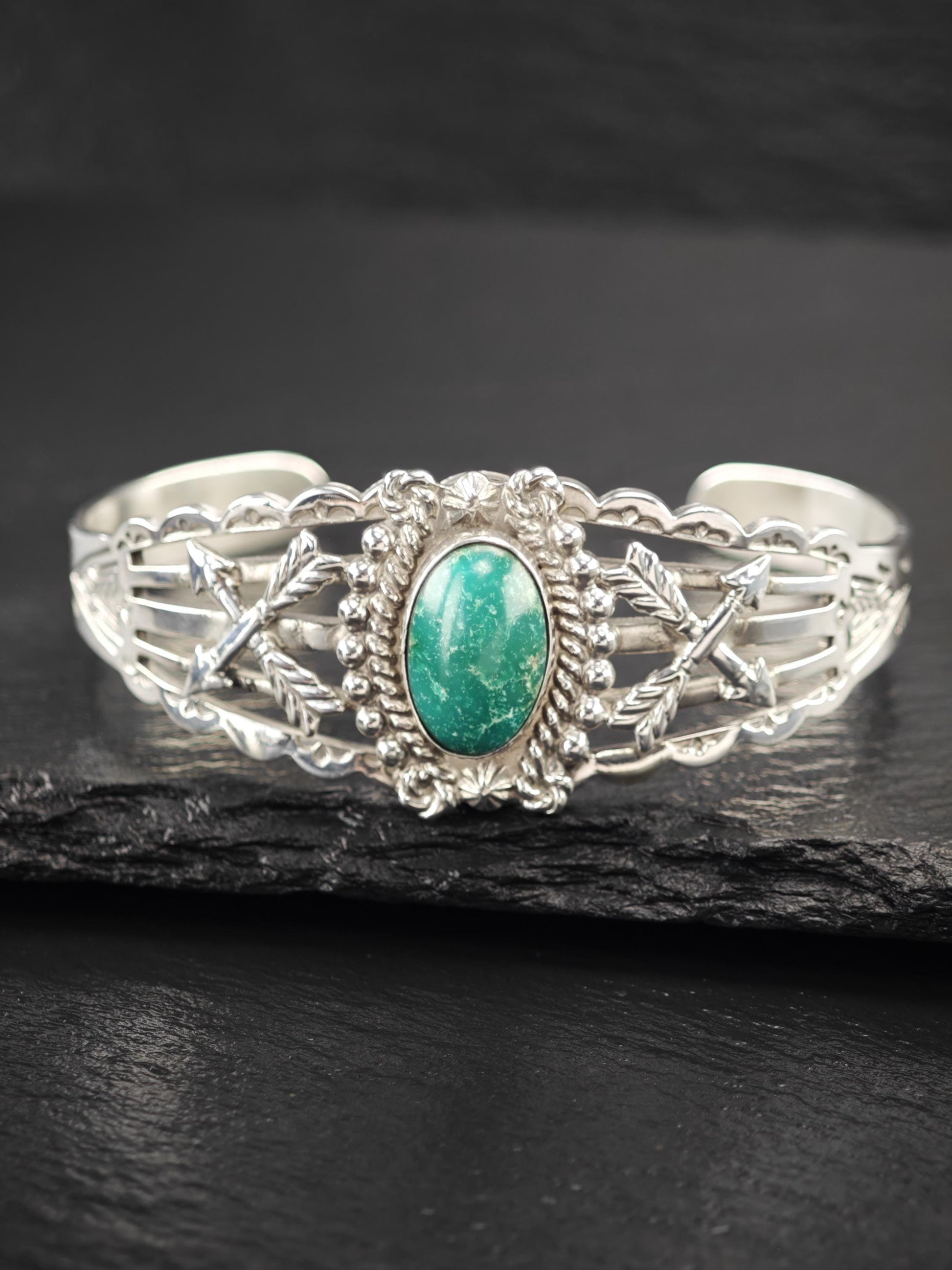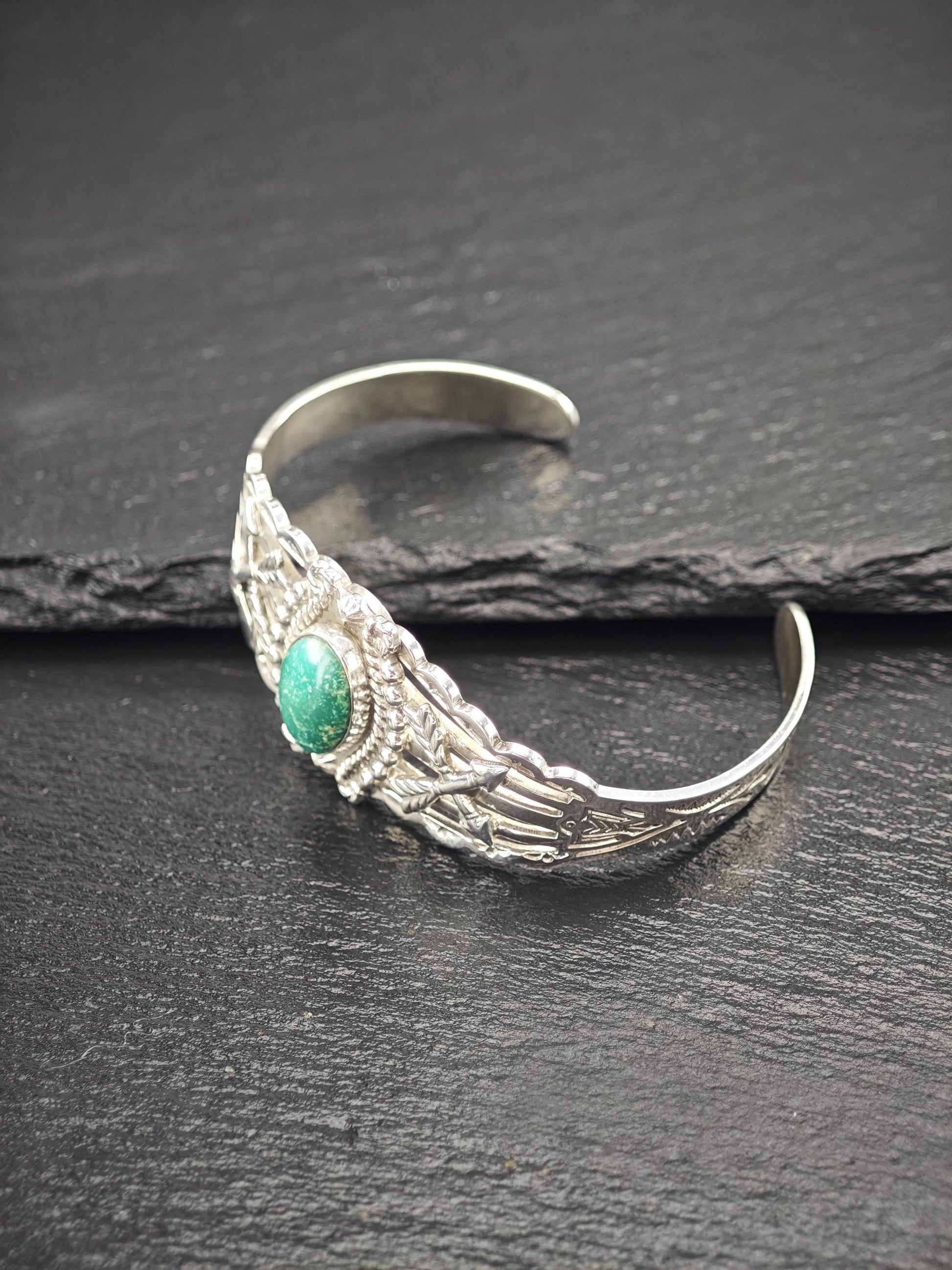 Fred Harvey Era Native American Green Turquoise, Oval Cuff Bracelet Sterling Silver