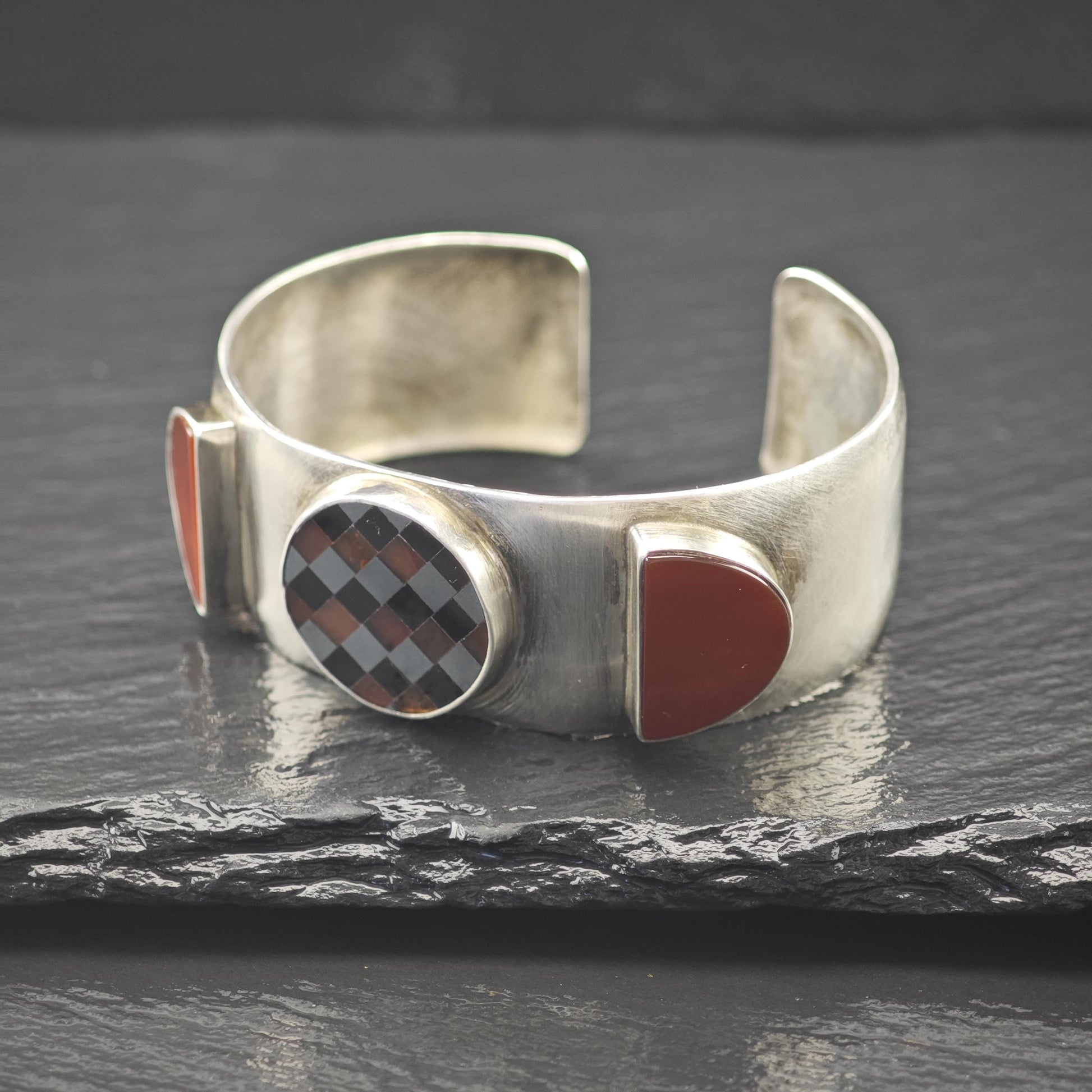 GFMW Mid Century Silver Cuff Bracelet Carnelian Checkered Sterling