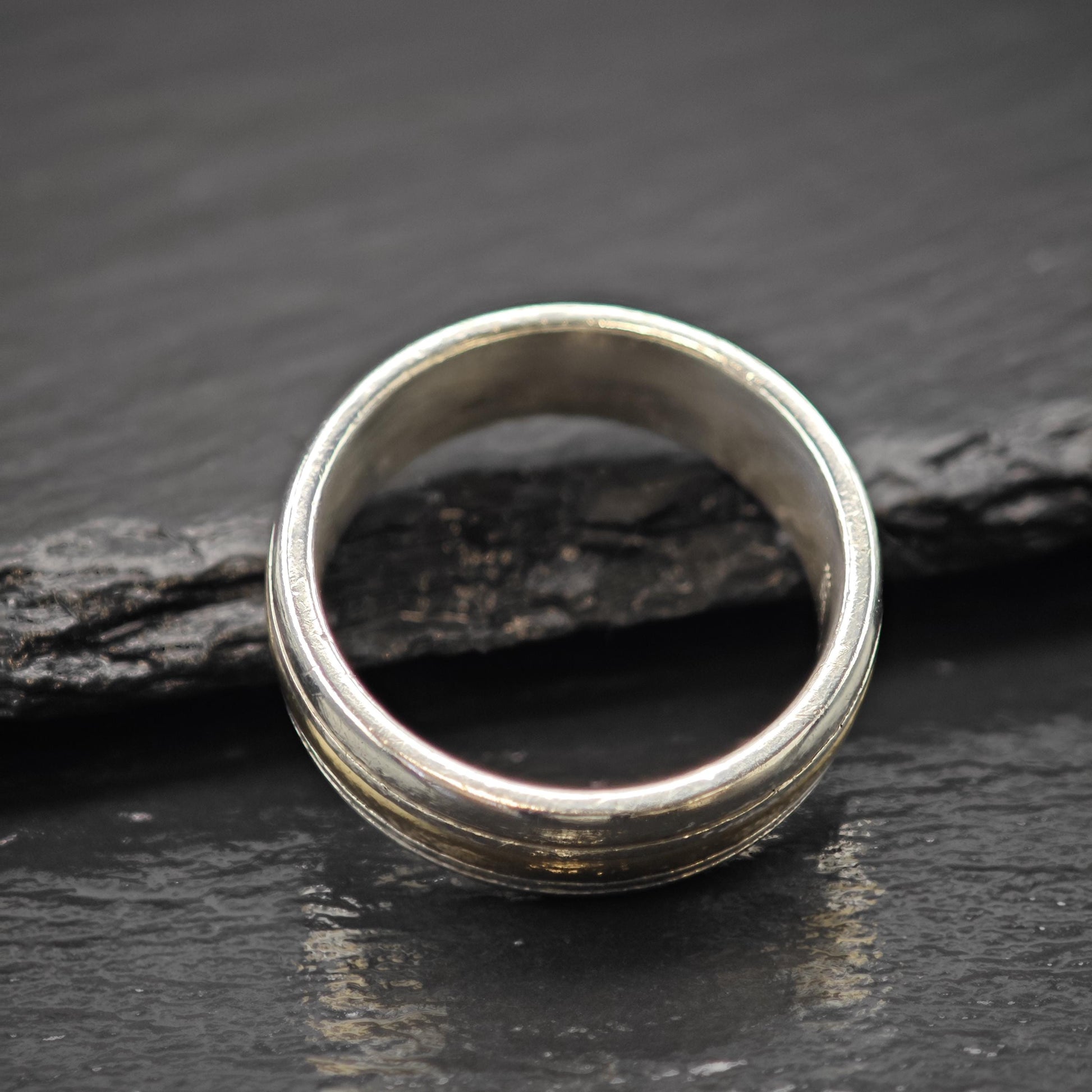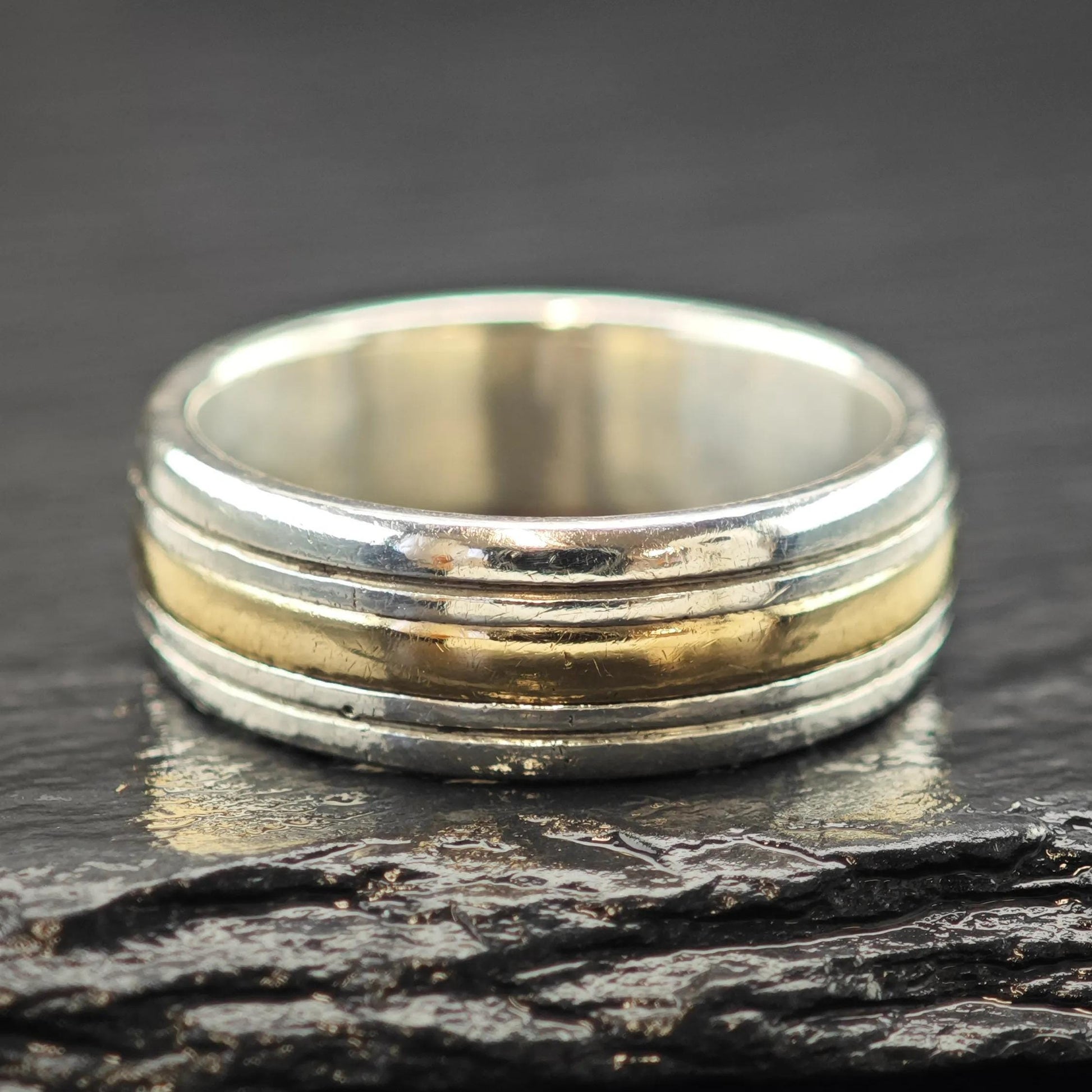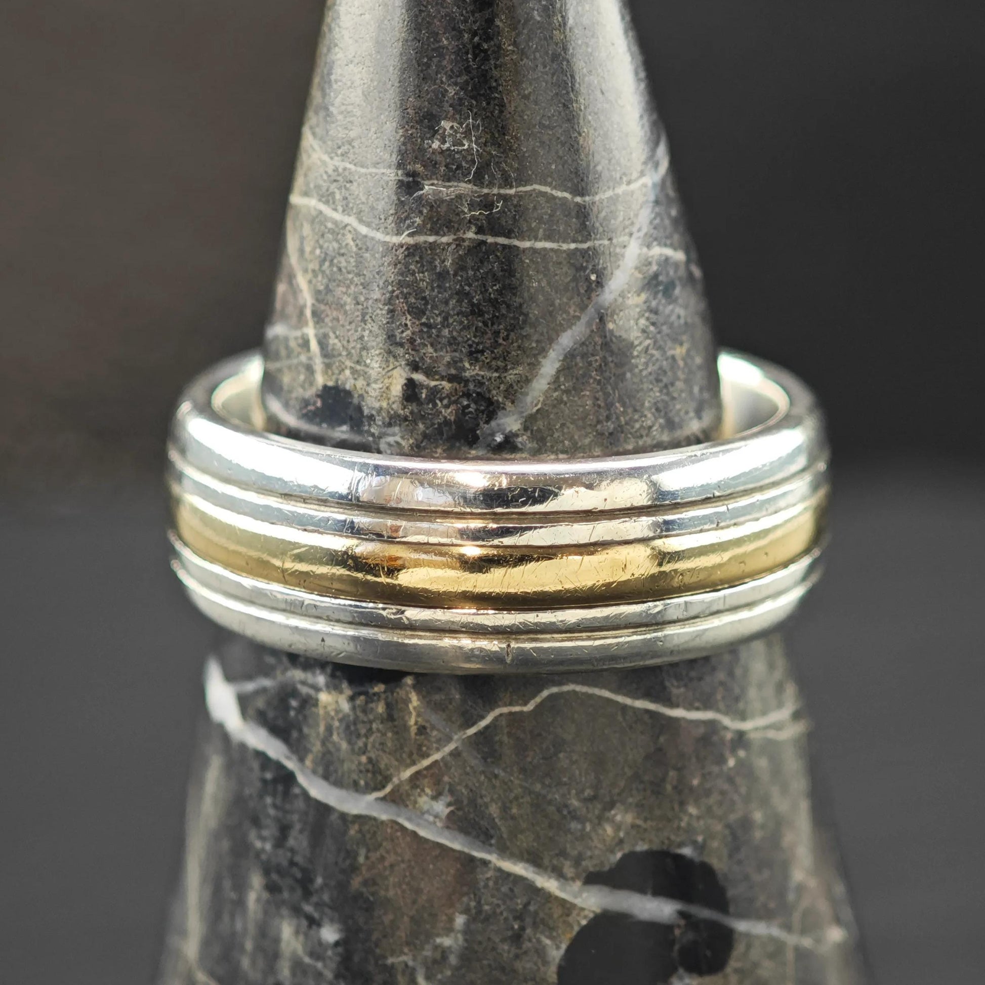 Discover the timeless elegance of this vintage band ring, a beautiful blend of sterling silver and 14K gold accents that captures classic charm with modern flair. Crafted with care, this sterling silver band offers a unique statement piece perfect for anyone seeking authentic vintage jewelry. Whether as a holiday gift or a special treat for yourself, this silver ring brings sophistication and history to your collection.