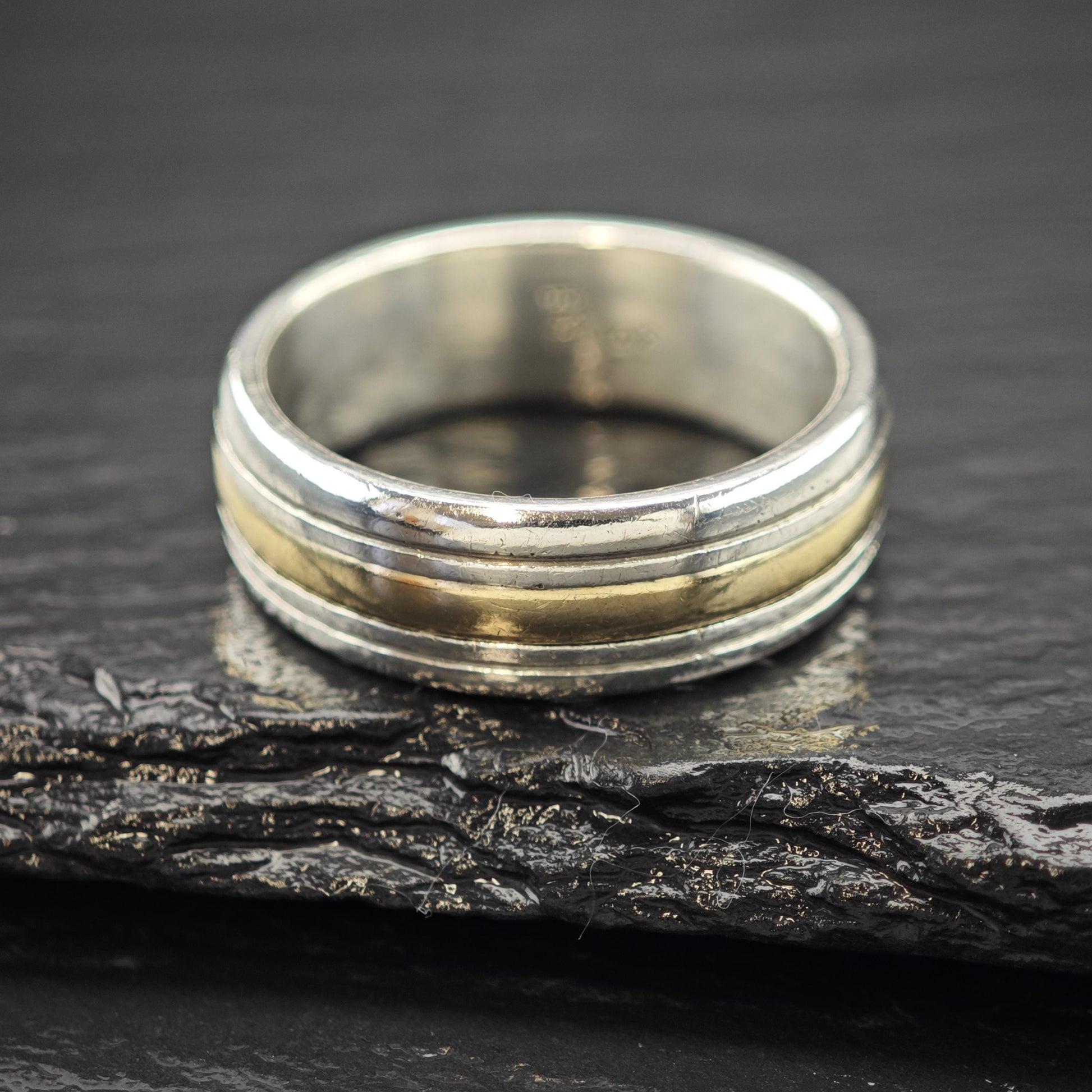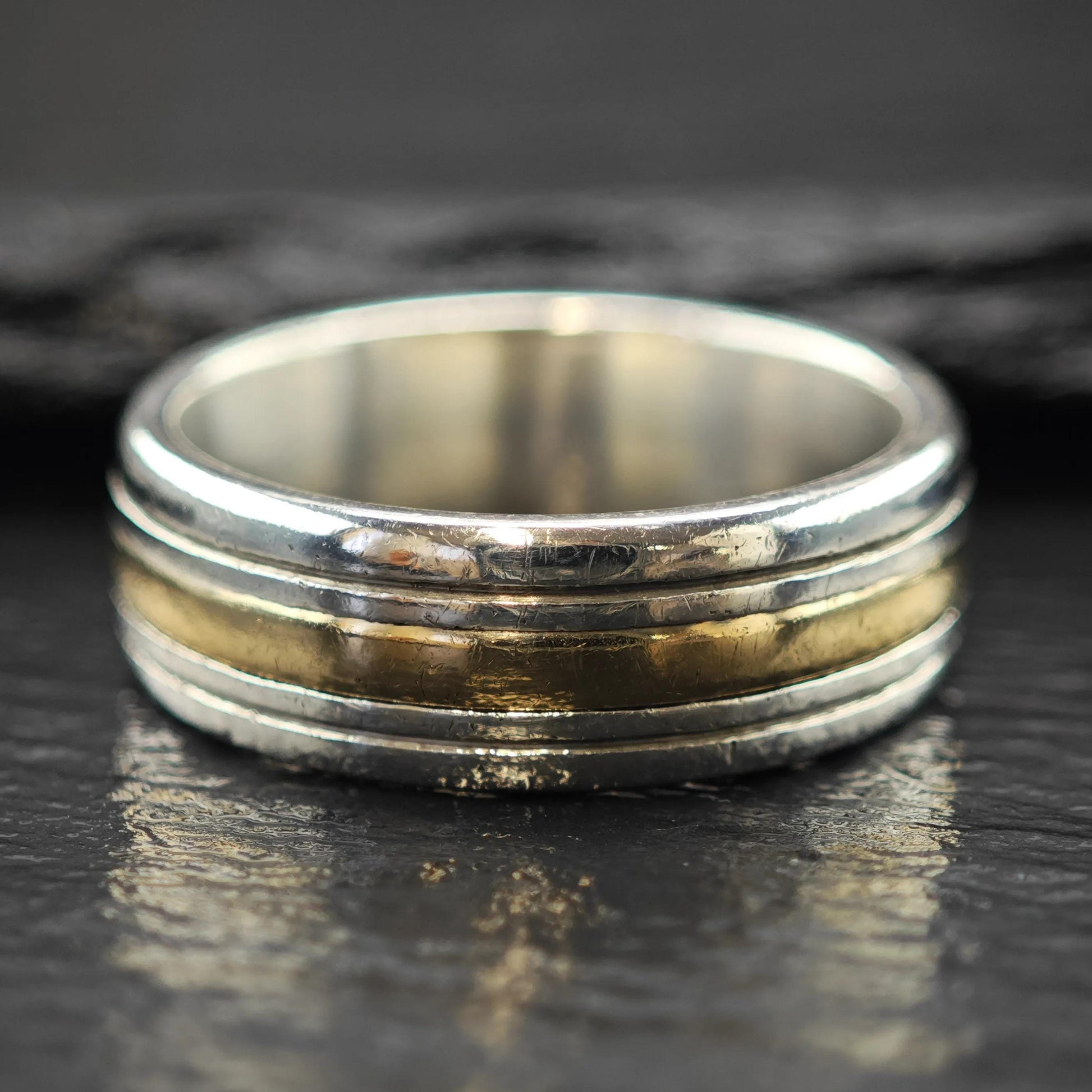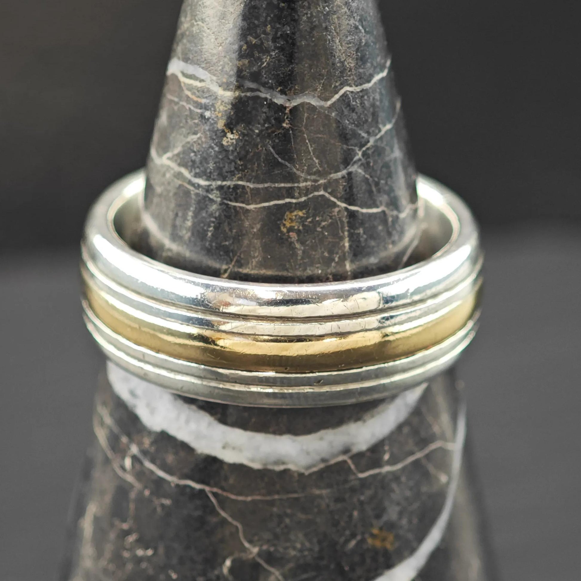 Discover the timeless elegance of this vintage band ring, a beautiful blend of sterling silver and 14K gold accents that captures classic charm with modern flair. Crafted with care, this sterling silver band offers a unique statement piece perfect for anyone seeking authentic vintage jewelry. Whether as a holiday gift or a special treat for yourself, this silver ring brings sophistication and history to your collection.