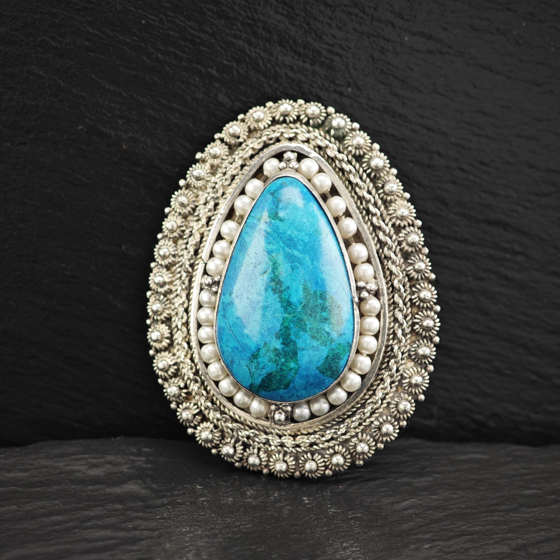 Jerusalem Blue Stone Teardrop Brooch Pendant with White Faux Pearls Sterling Silver