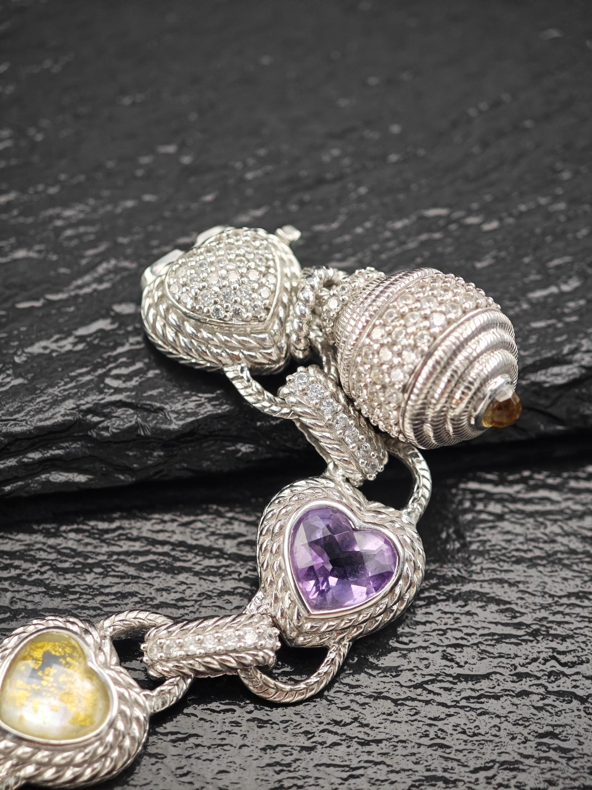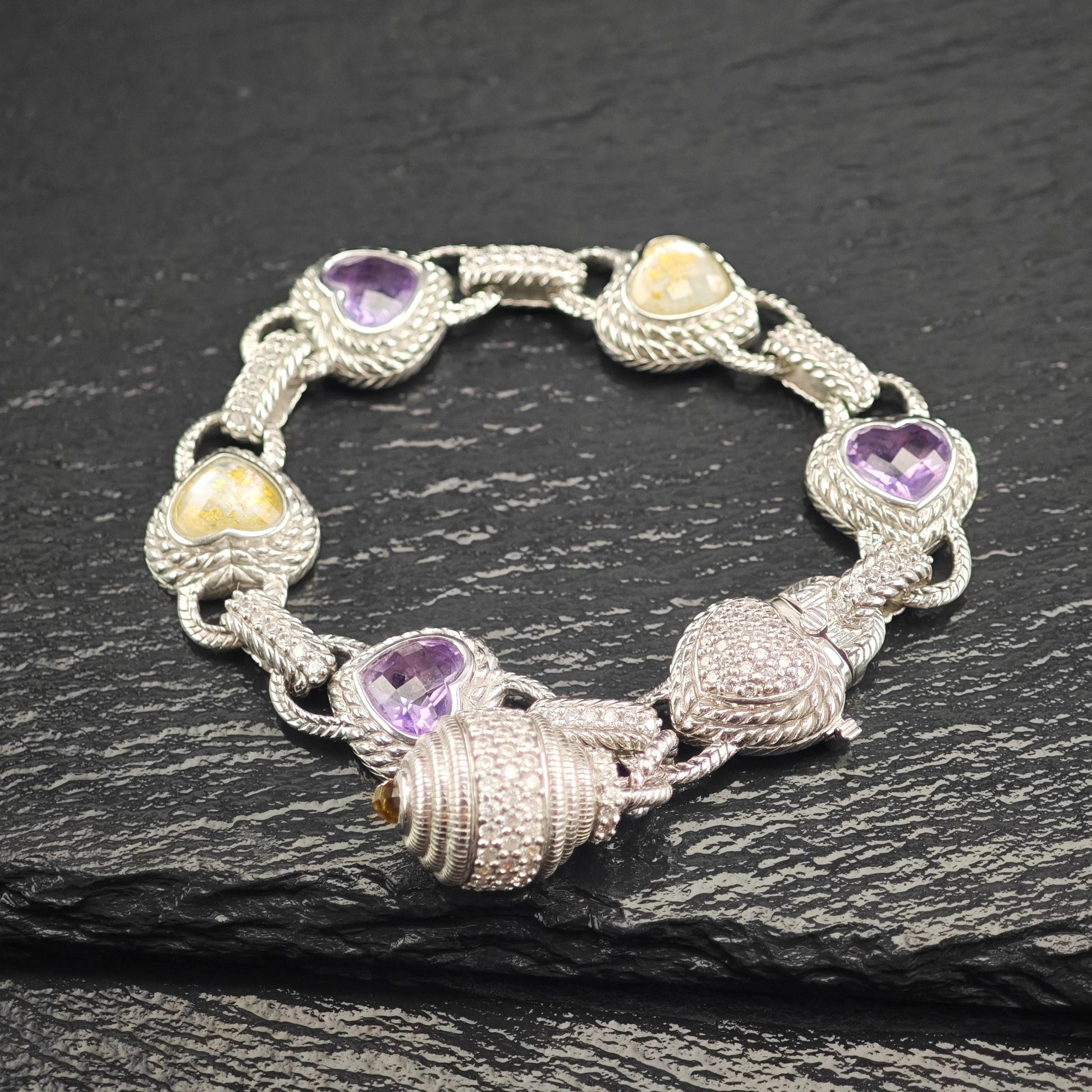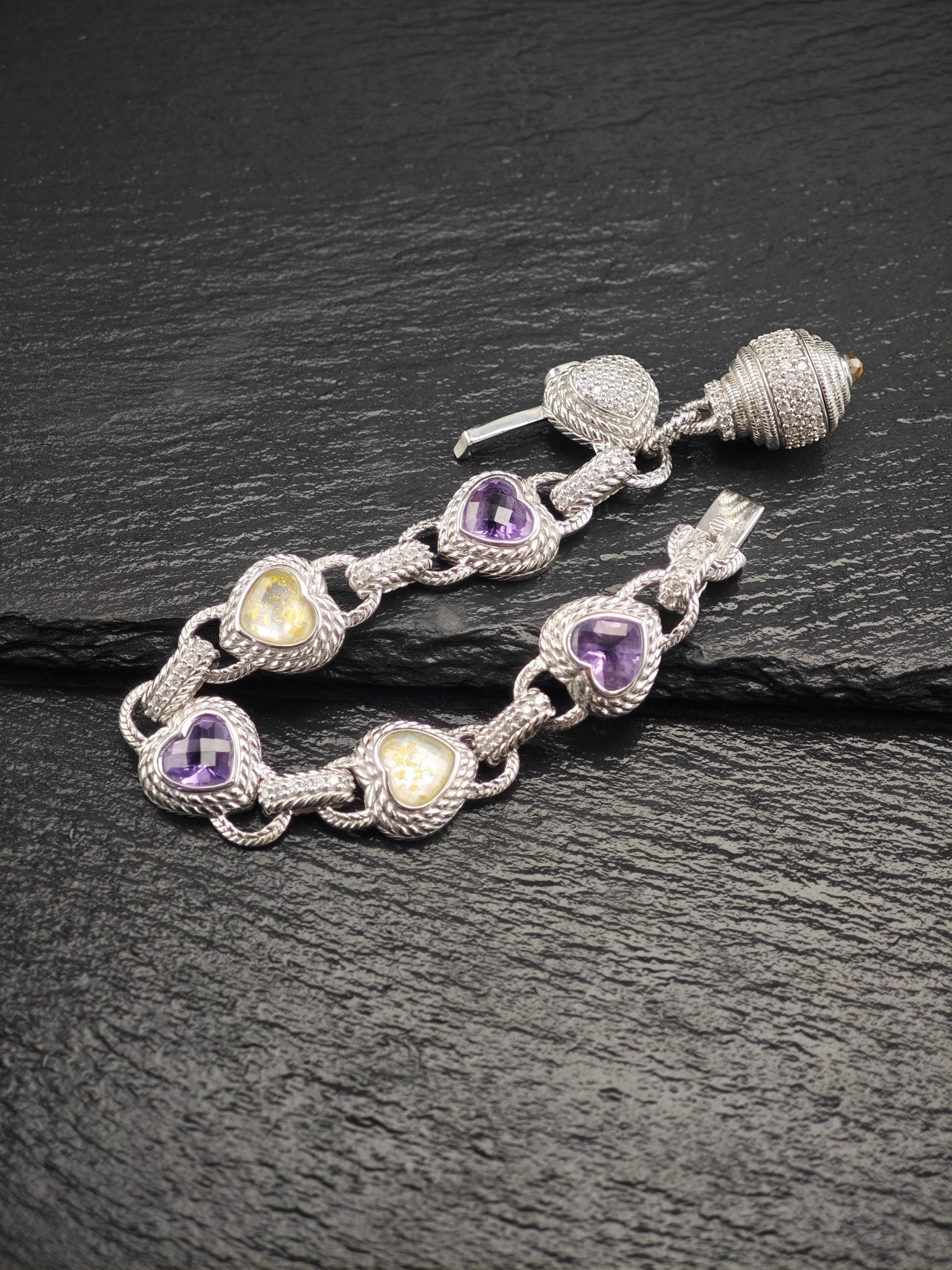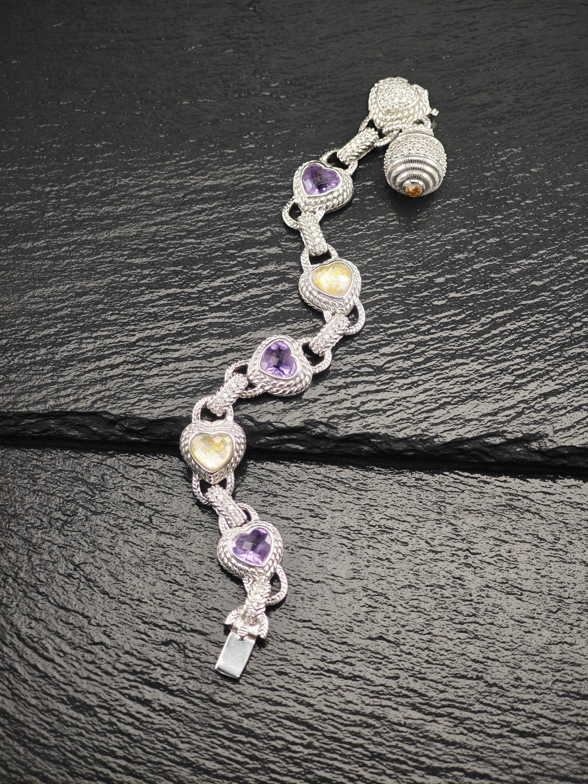 Discover the exquisite charm of this vintage Judith Ripka Amethyst Heart Bracelet, featuring stunning doublet links crafted from sterling silver. This elegant piece is beautifully stamped with Judith Ripka's signature, along with the marks for 925 sterling silver and CZ, and was made in Thailand.