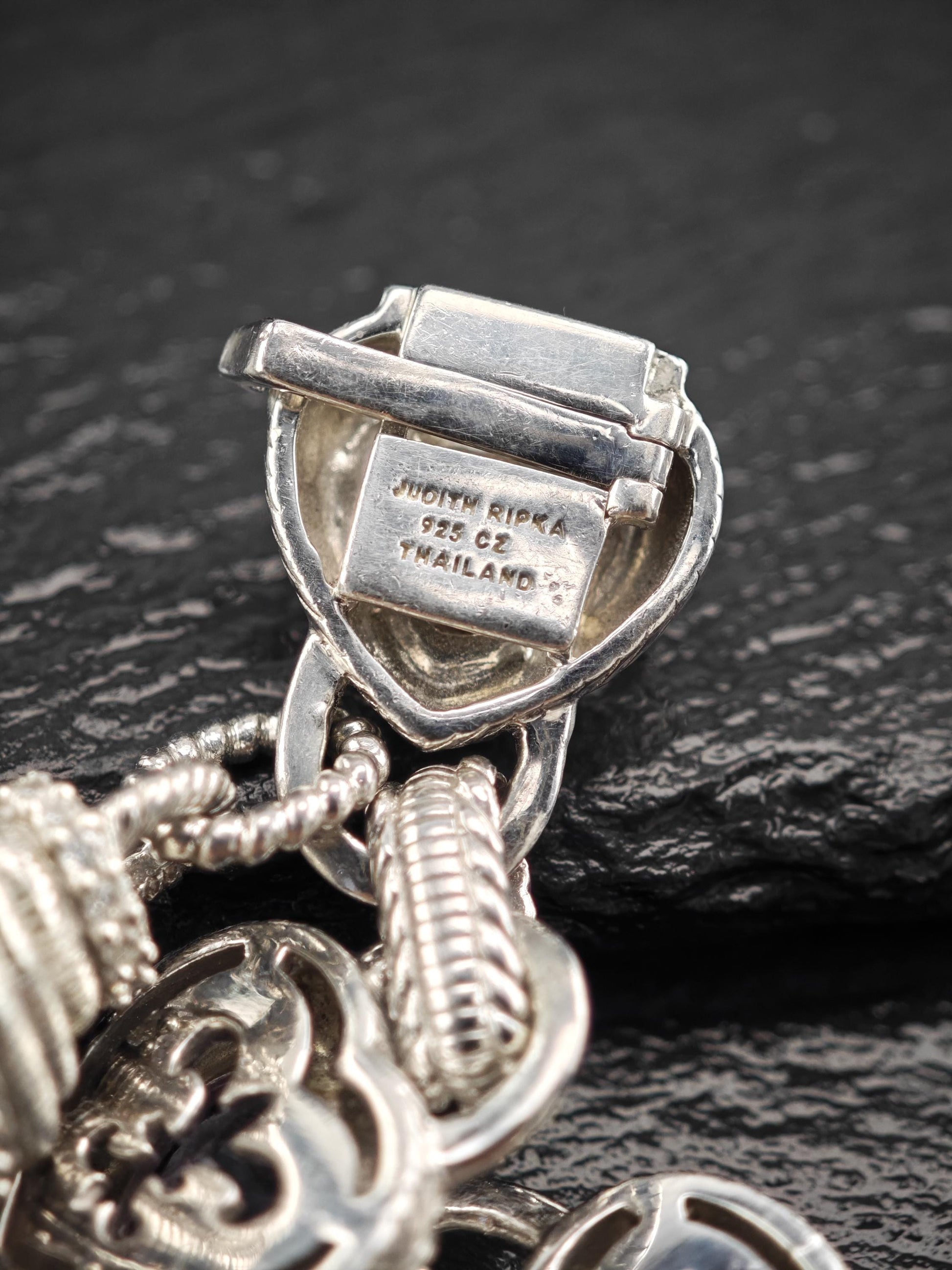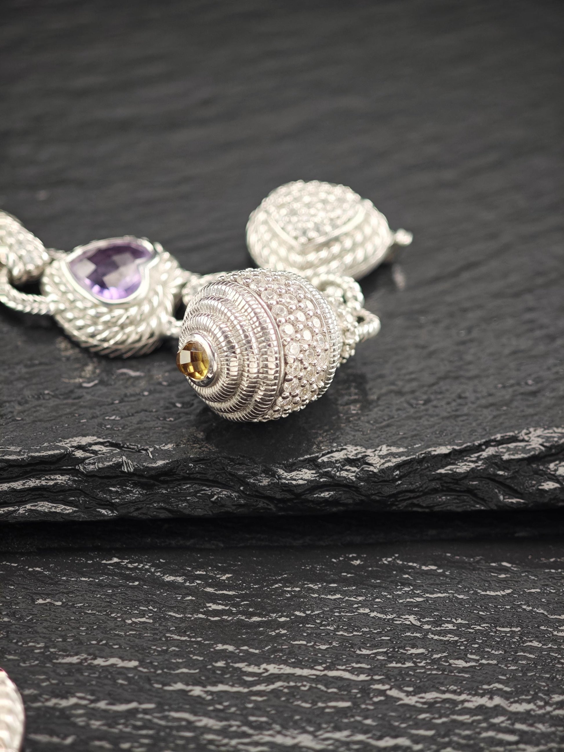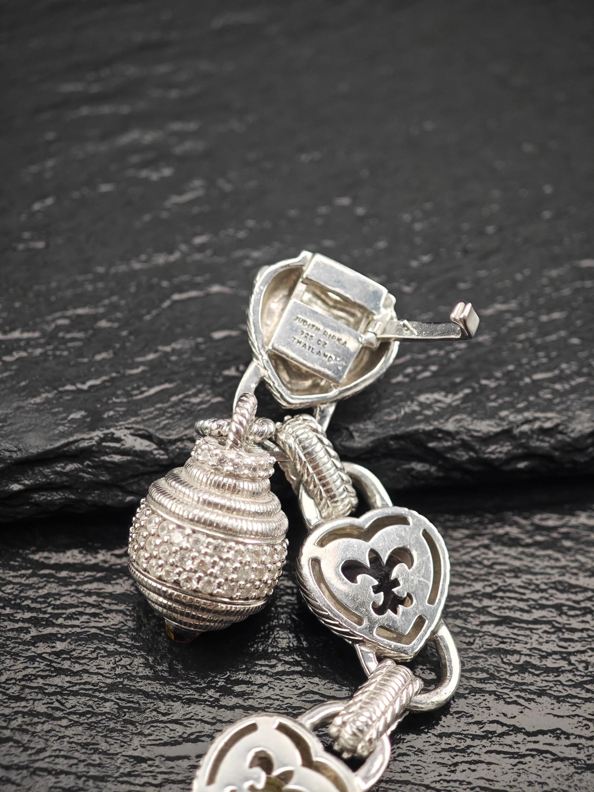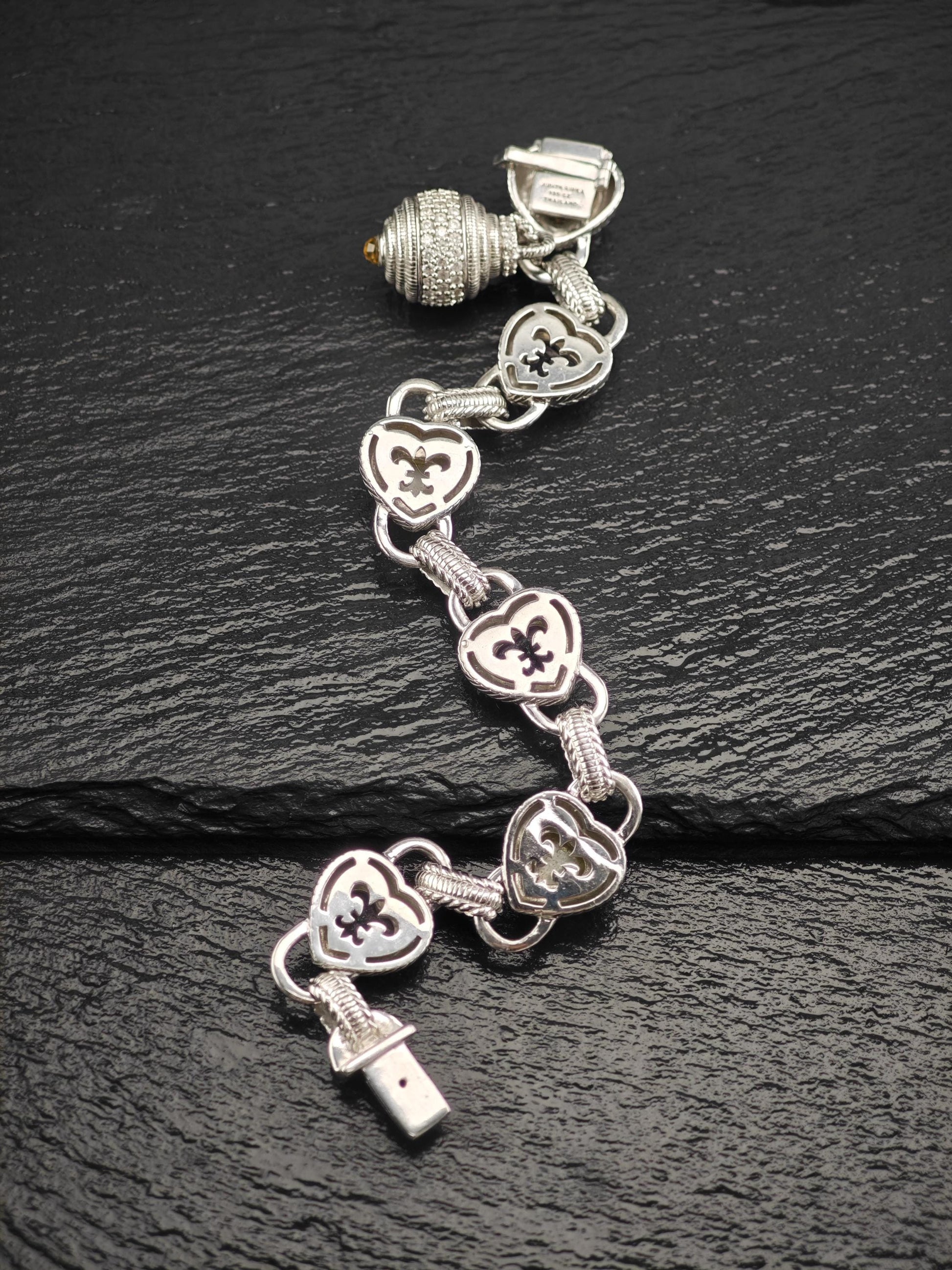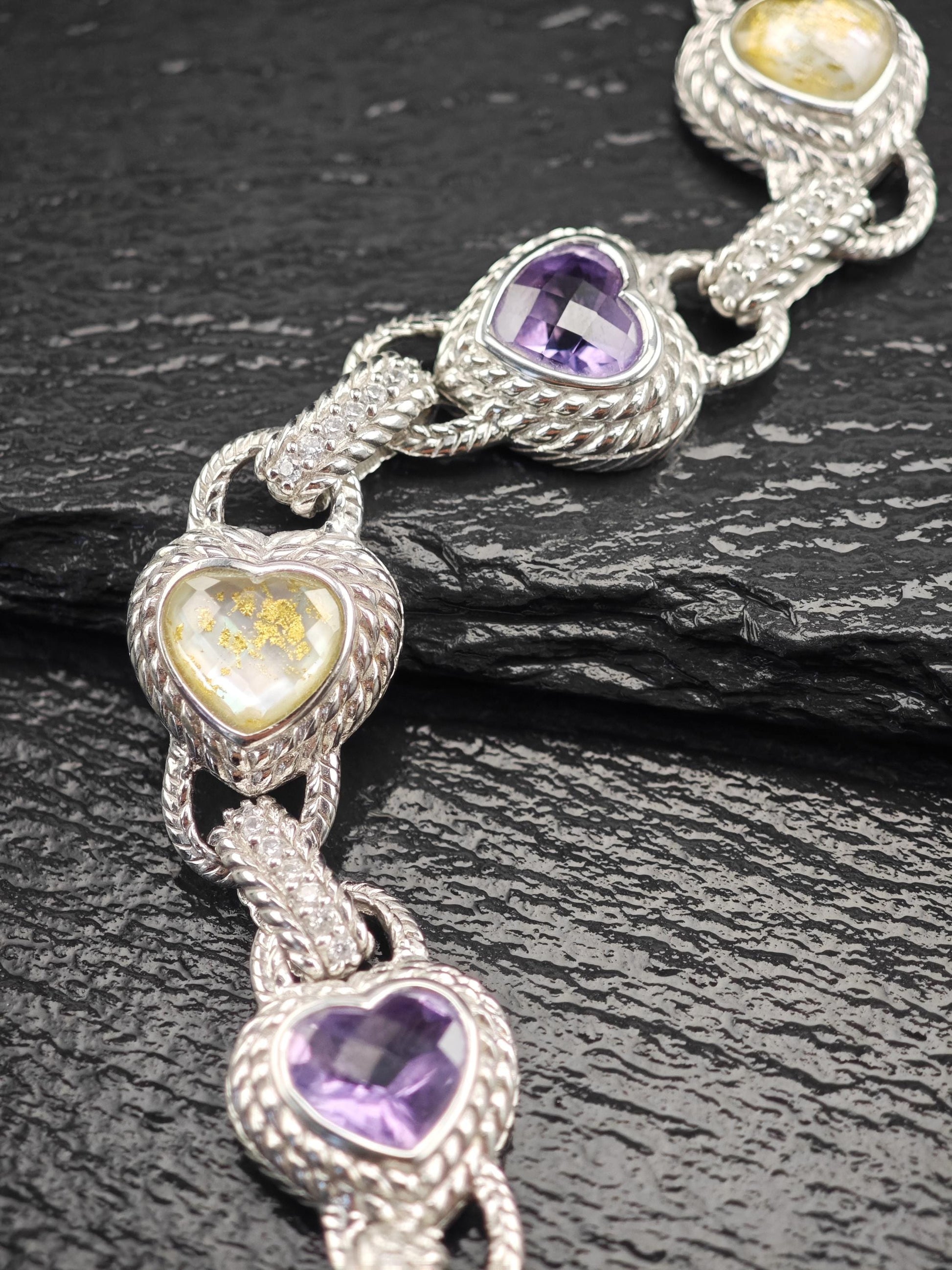 Discover the exquisite charm of this vintage Judith Ripka Amethyst Heart Bracelet, featuring stunning doublet links crafted from sterling silver. This elegant piece is beautifully stamped with Judith Ripka's signature, along with the marks for 925 sterling silver and CZ, and was made in Thailand.