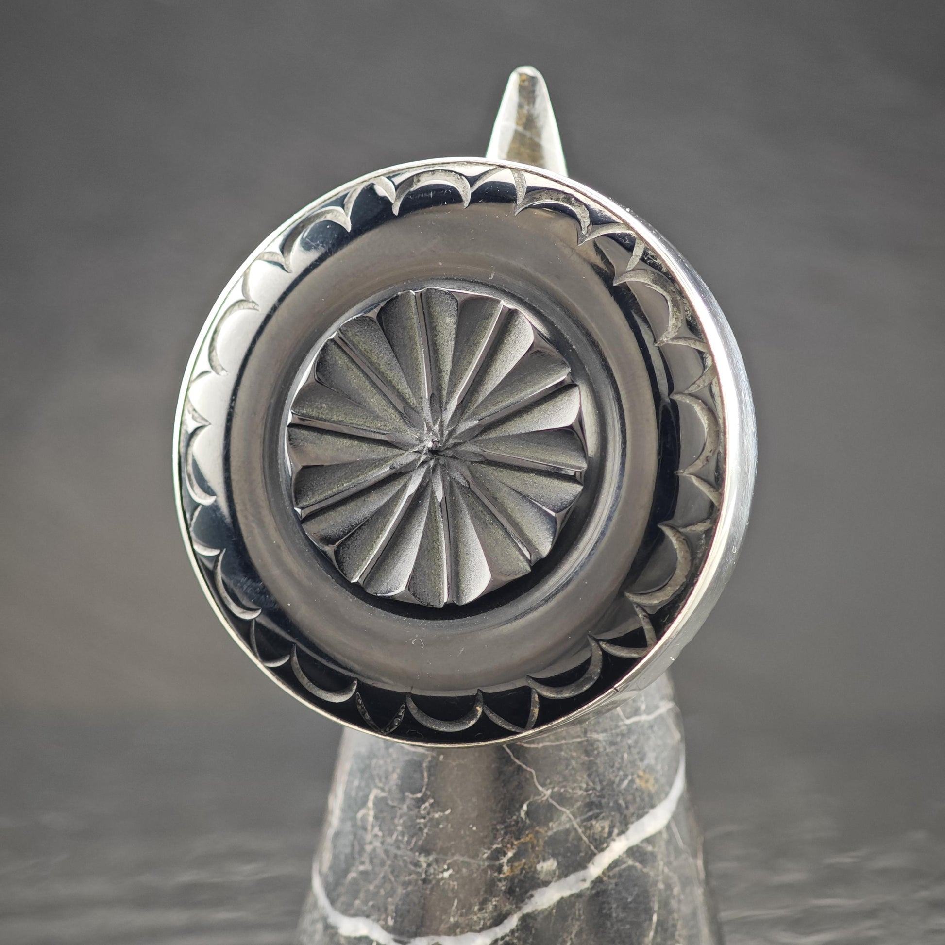 Large Carved Black Gemstone Ring Sterling Silver Size 9