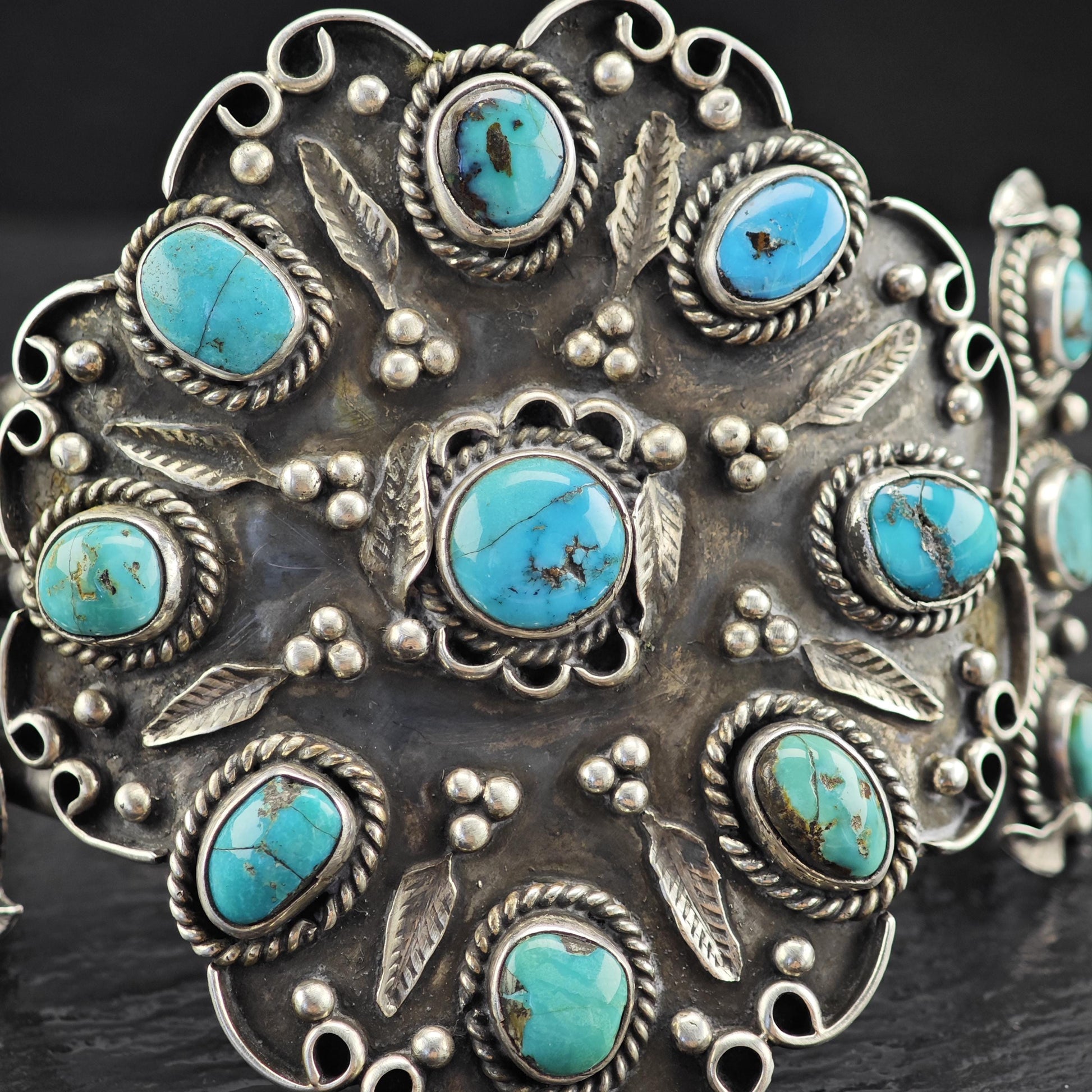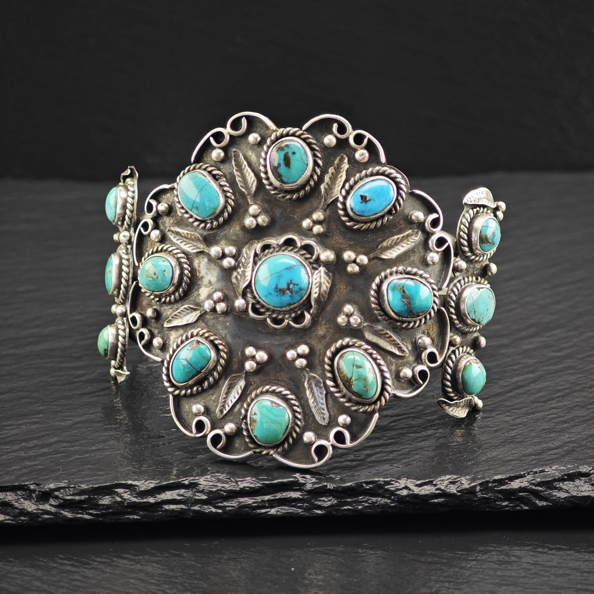 Large Turquoise Floral Cuff Bracelet Native American Sterling Silver
