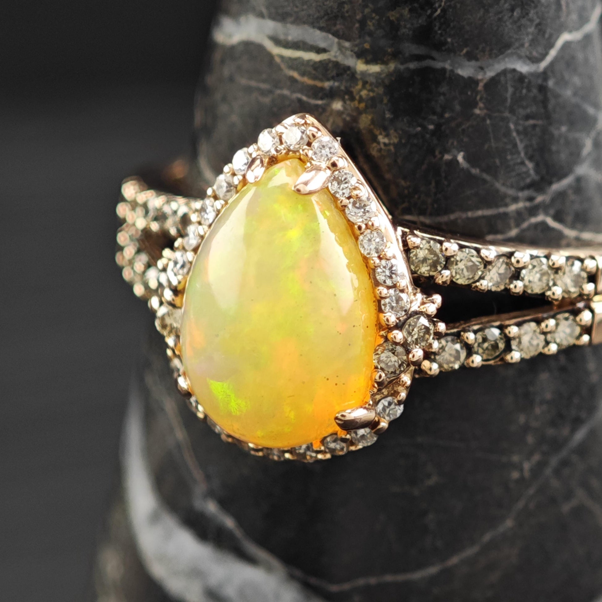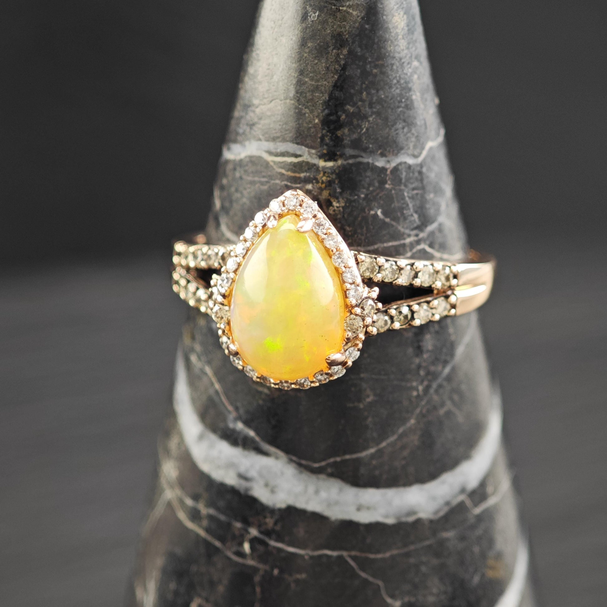 Discover the exquisite beauty of this LeVian 14K Rose Gold Teardrop Opal Diamond Ring. This stunning piece, stamped with the LeVian hallmark, is crafted from genuine 14K rose gold, which has been tested and guaranteed to meet the specified standards.