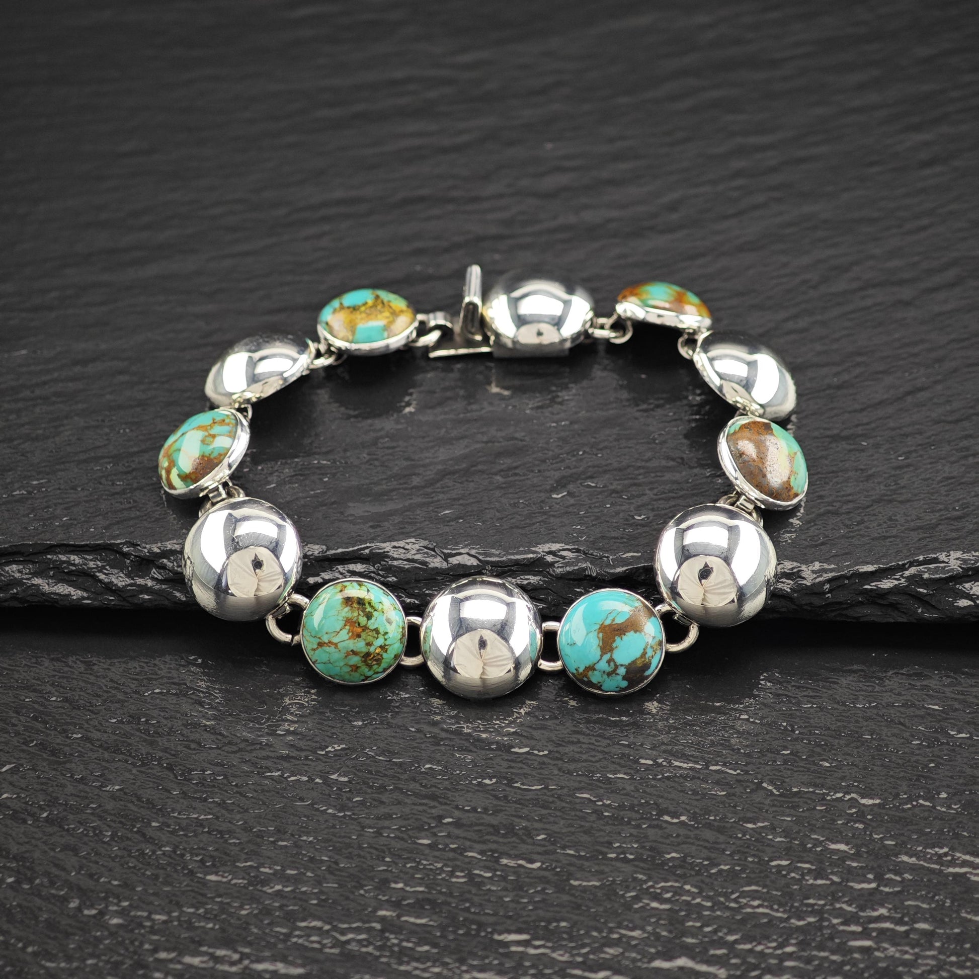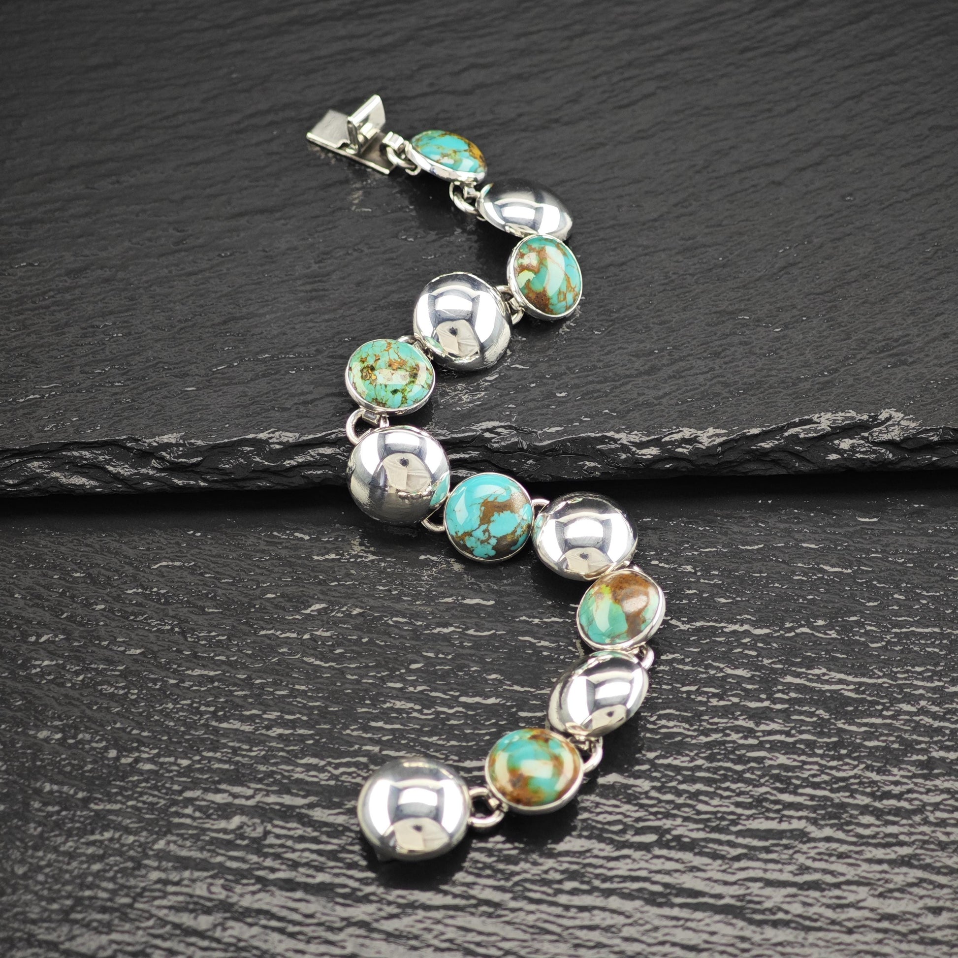In great condition, the bracelet has been cleaned and polished, showcasing its vibrant turquoise stones. While you may notice some superficial scratches and a touch of patina, these age-appropriate characteristics only add to its charm and story.