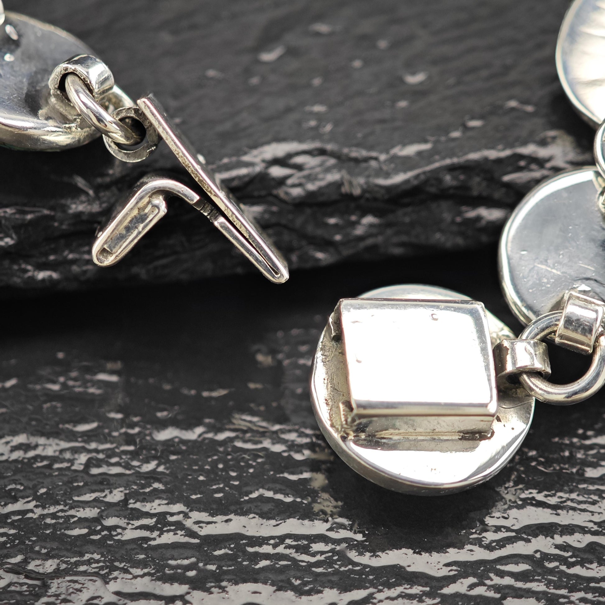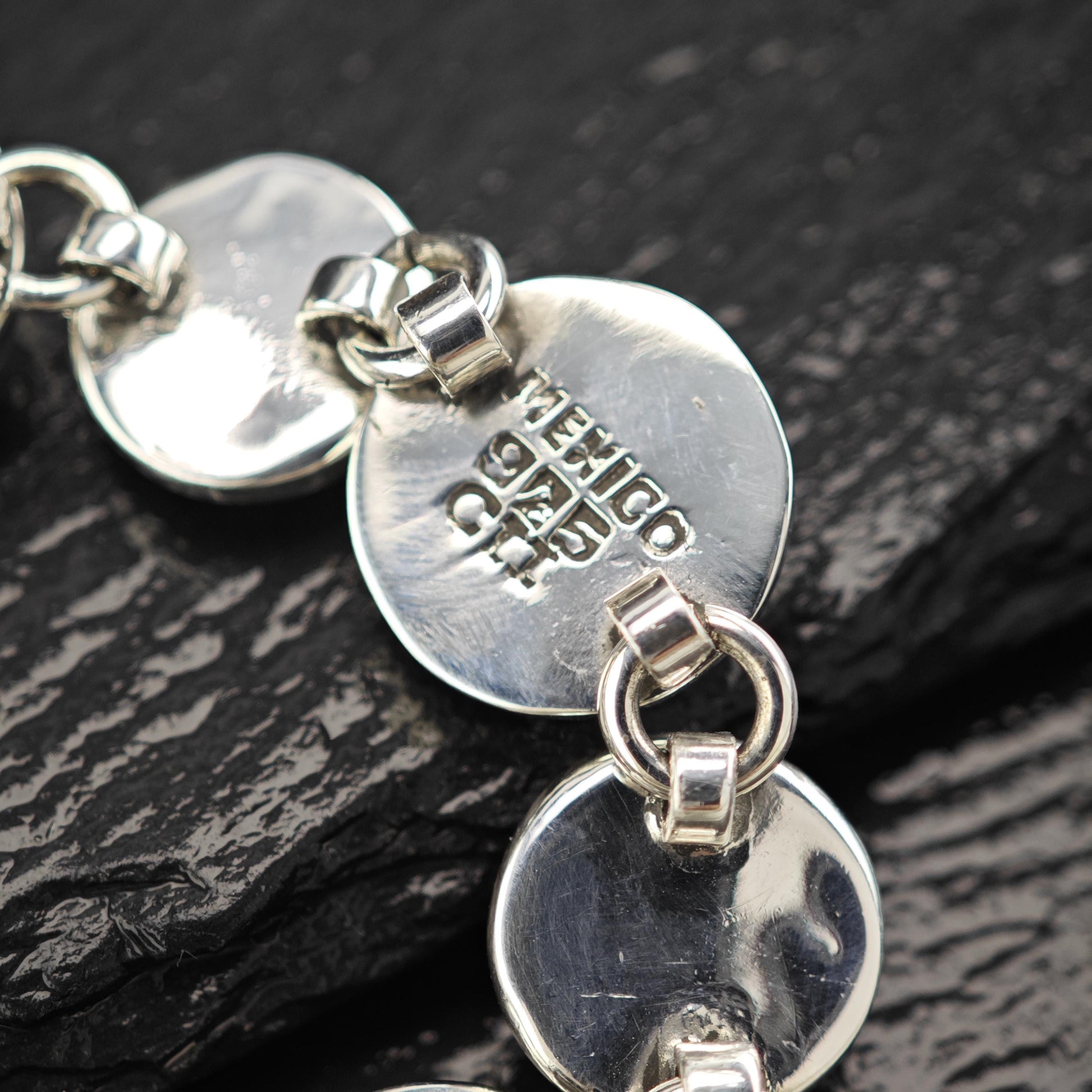 Discover the beauty of this stunning Mexican Turquoise Modernist Bracelet, crafted from high-quality sterling silver. This exquisite piece is stamped with "Mexico," "925," and "CII," ensuring its authenticity and quality. Designed to fit a wrist size of 7 1/4 inches, the bracelet has a lay-flat length of 7 1/2 inches and a width of 9/16 inches. Weighing in at 34.6 grams, this bracelet is both lightweight and durable.