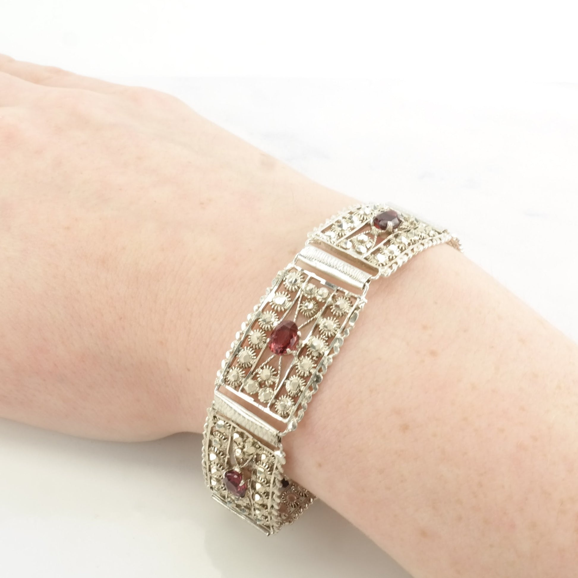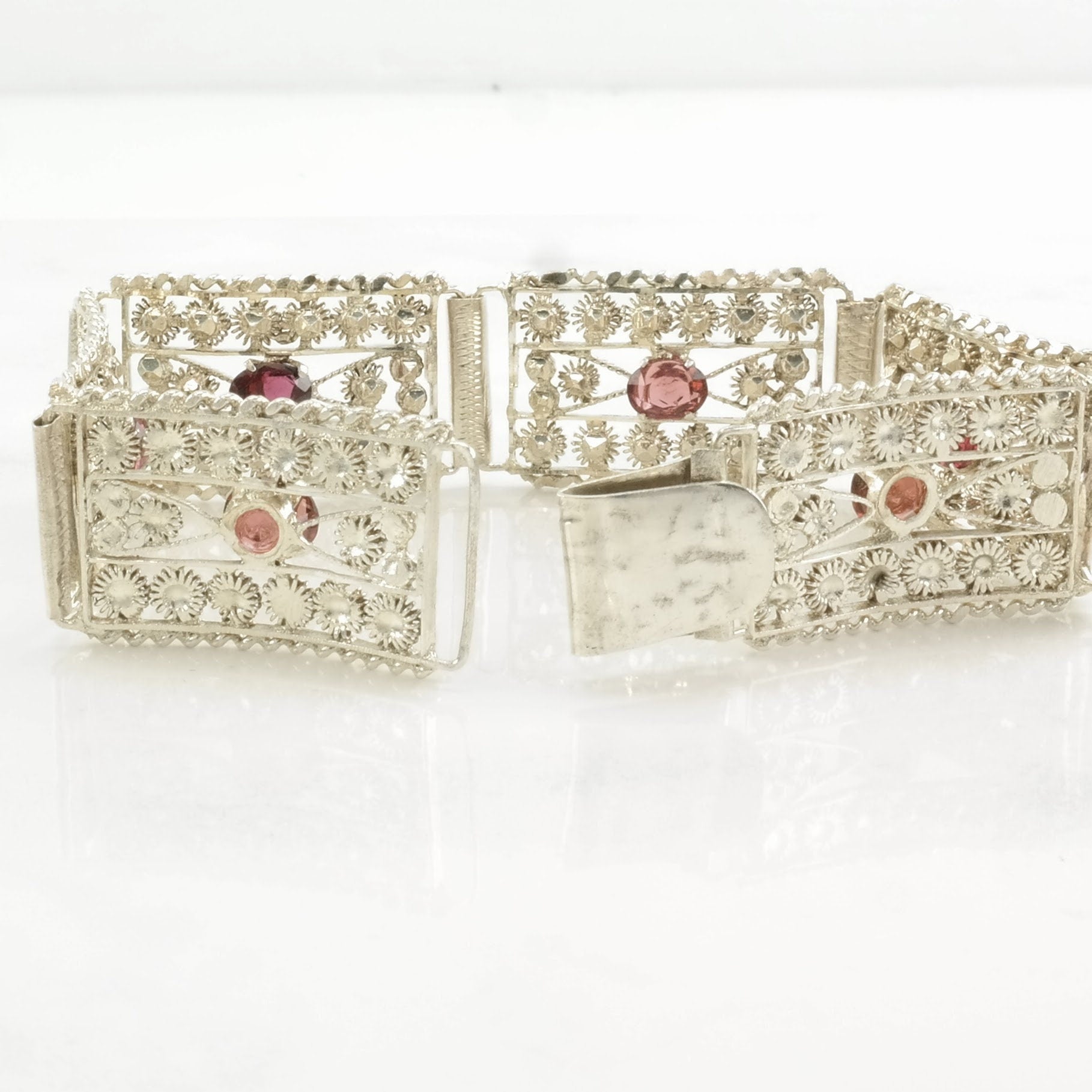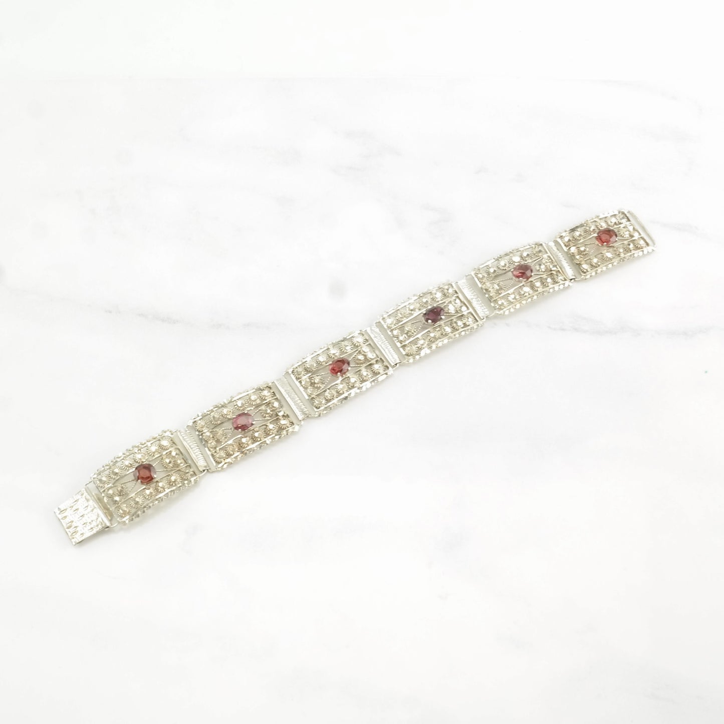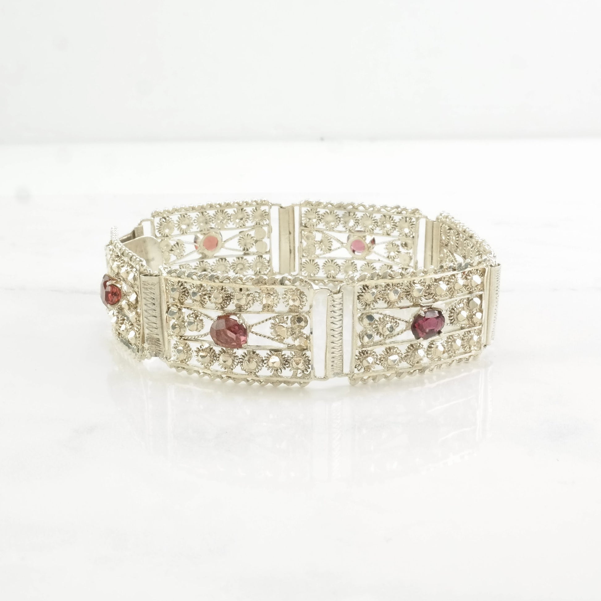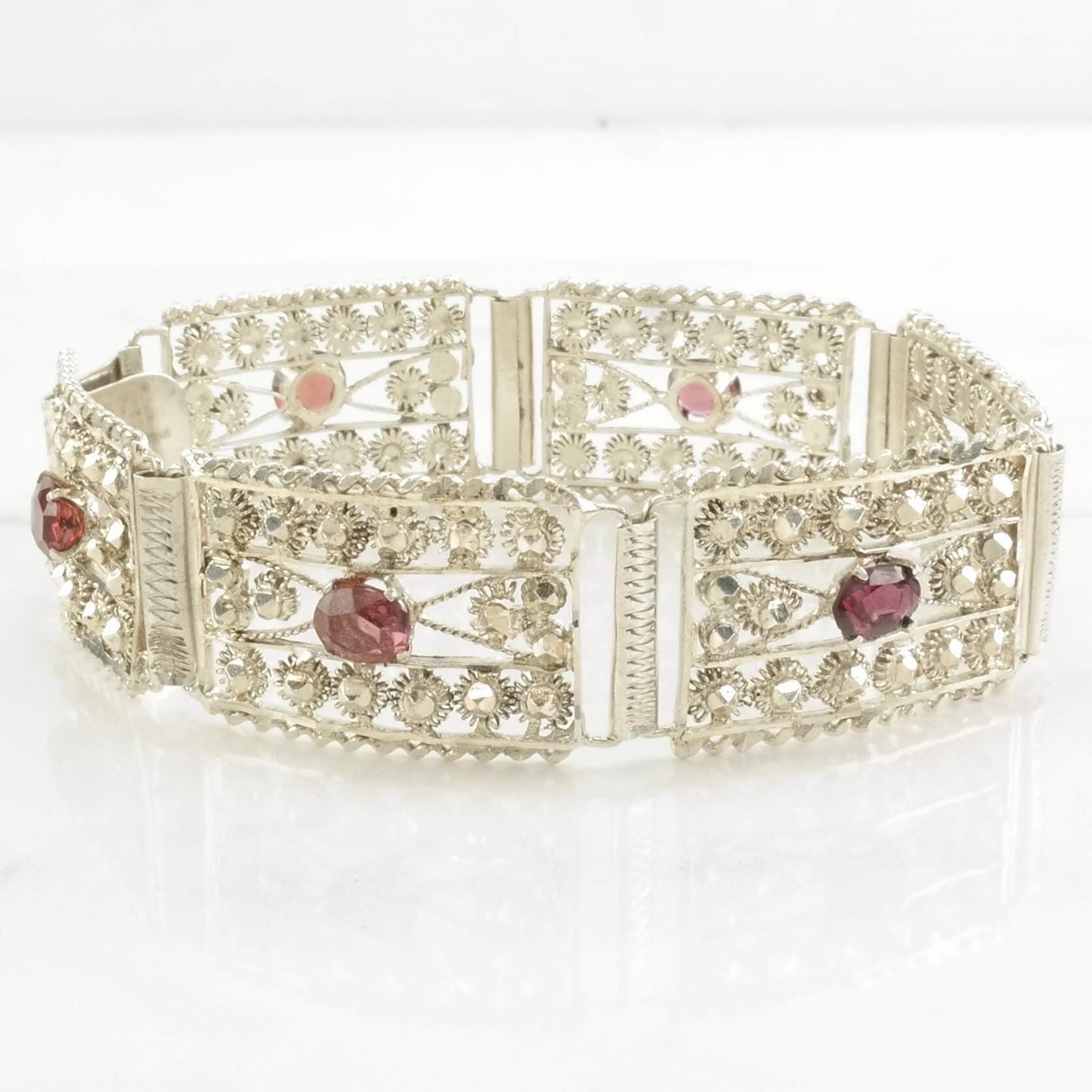 Mid Century Sterling Silver Line Bracelet Red Garnet Sunburst