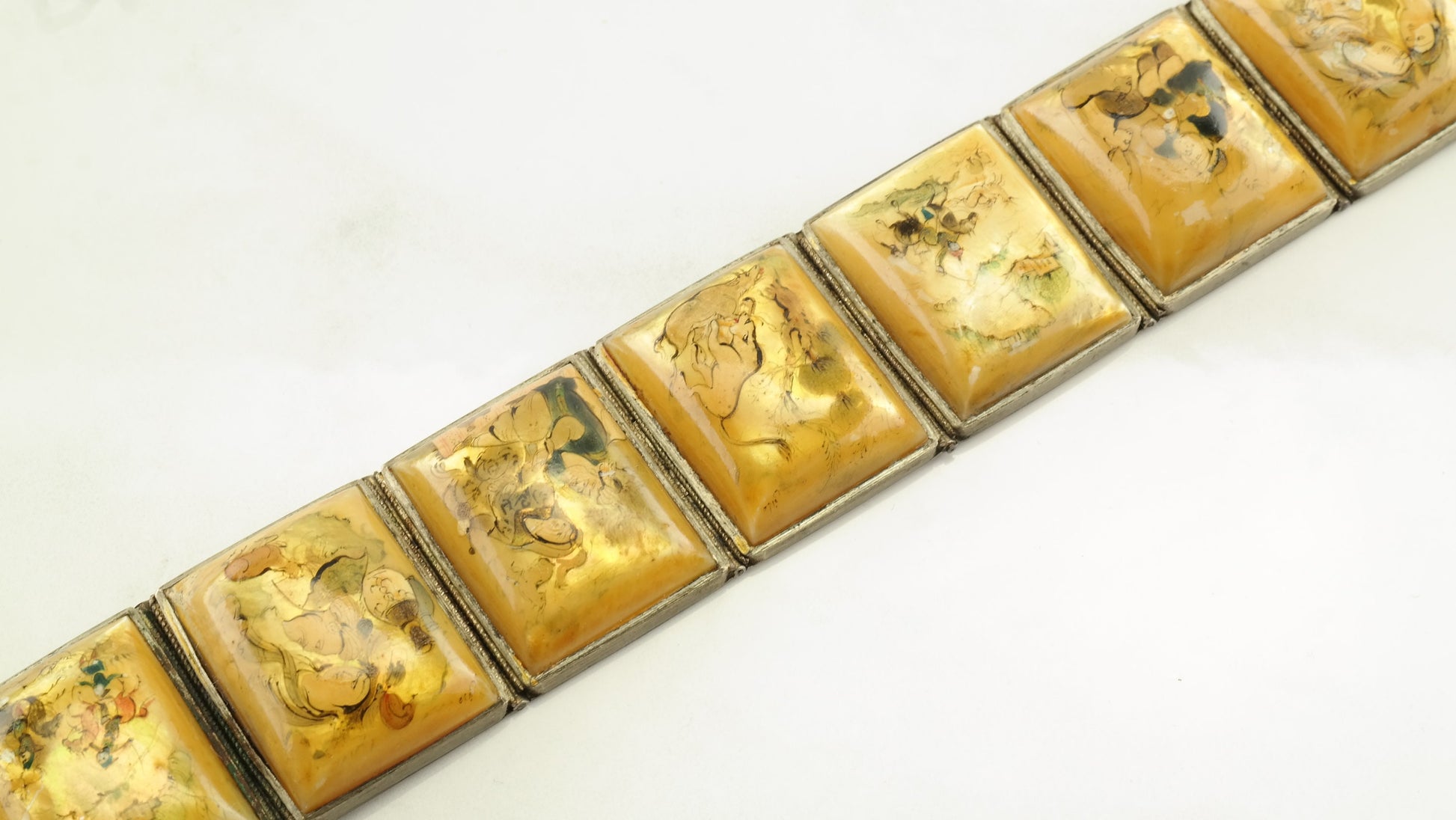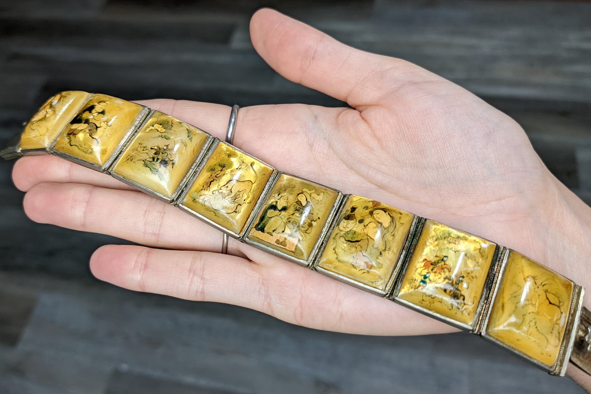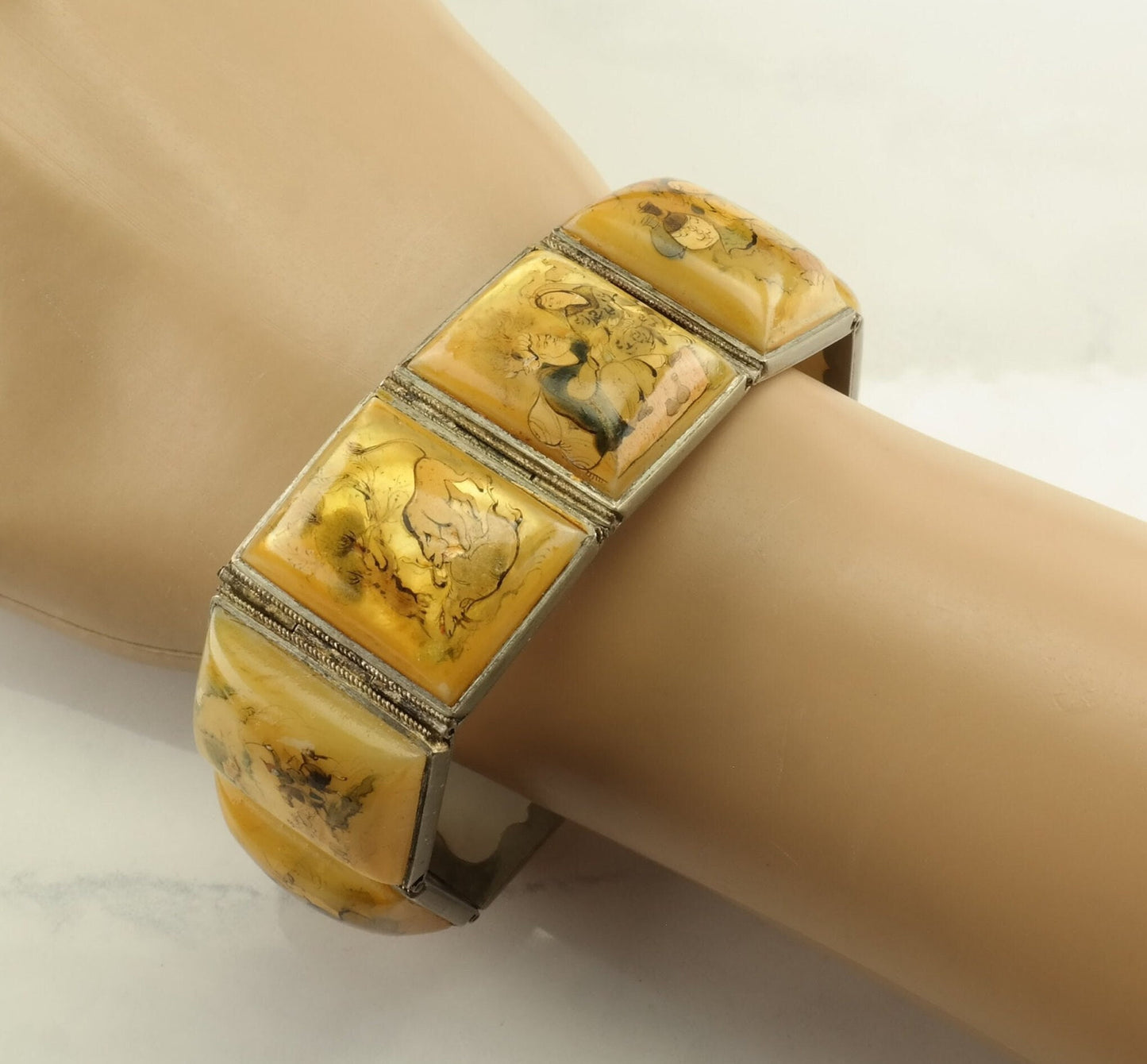 Circa 1950's Intricately detailed, hand-painted enamel bracelet.