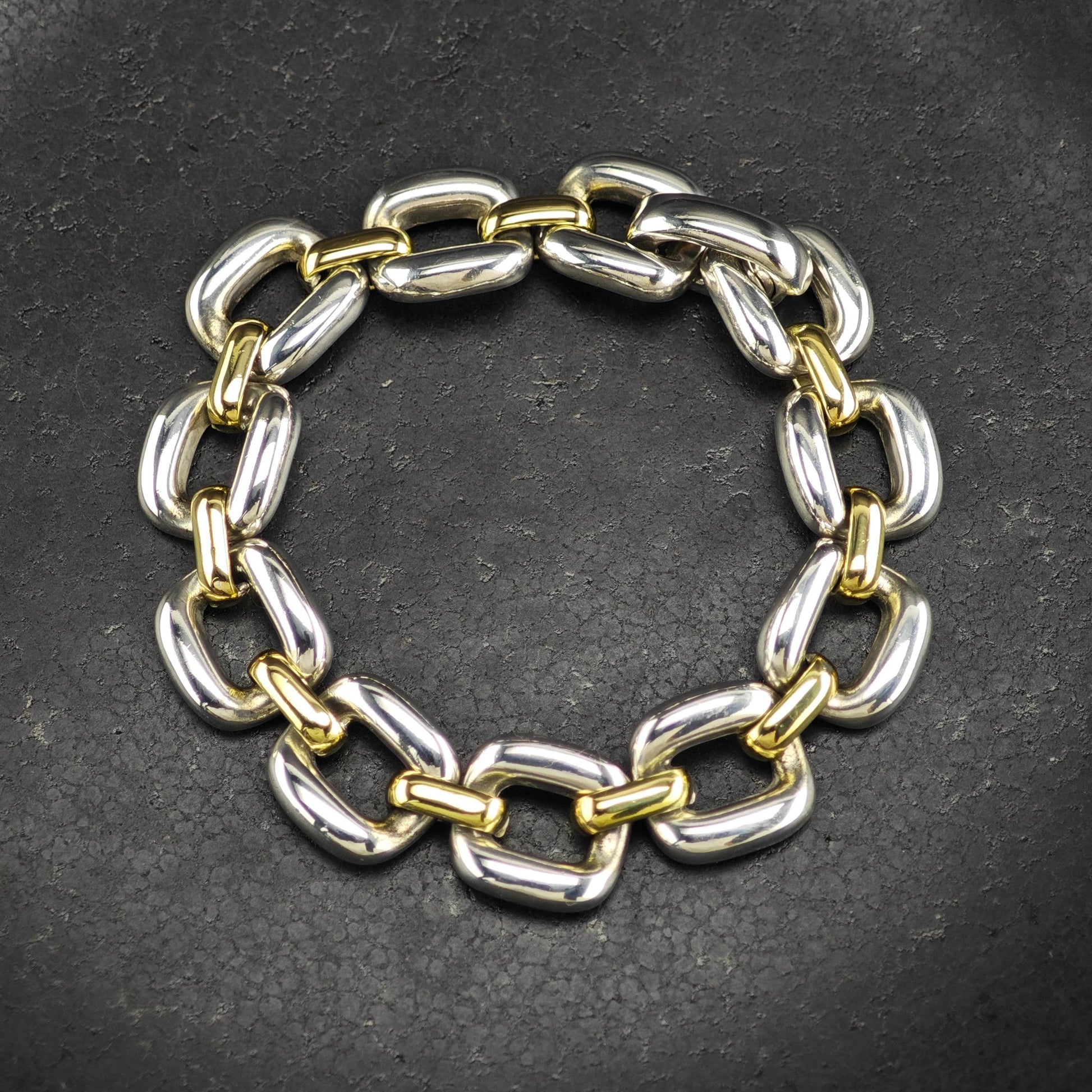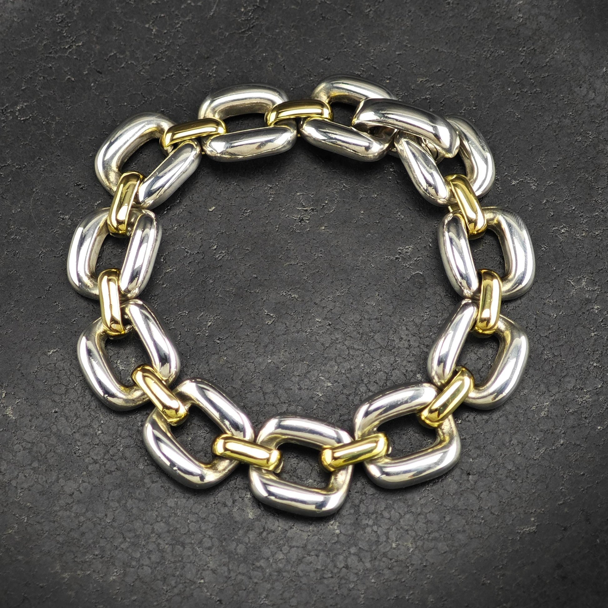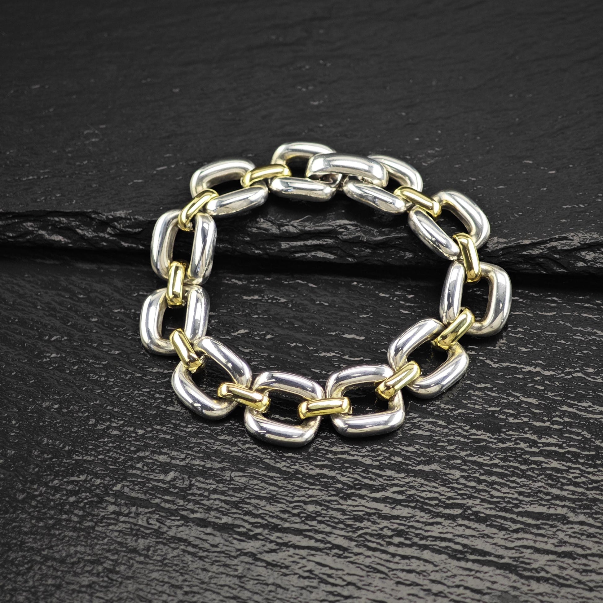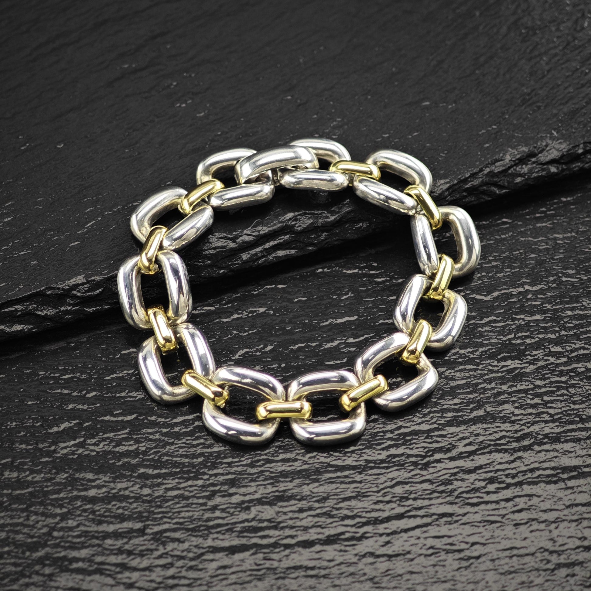 Introducing a stunning modern bracelet that beautifully combines 18k gold and sterling silver. This exquisite piece is stamped with 925 and made in Italy, showcasing fine craftsmanship. Weighing 53.6 grams, the bracelet features a lay flat length of 7 1/4 inches and a width of 1/2 inch, making it a perfect fit for a wrist size of 6 1/2 inches.