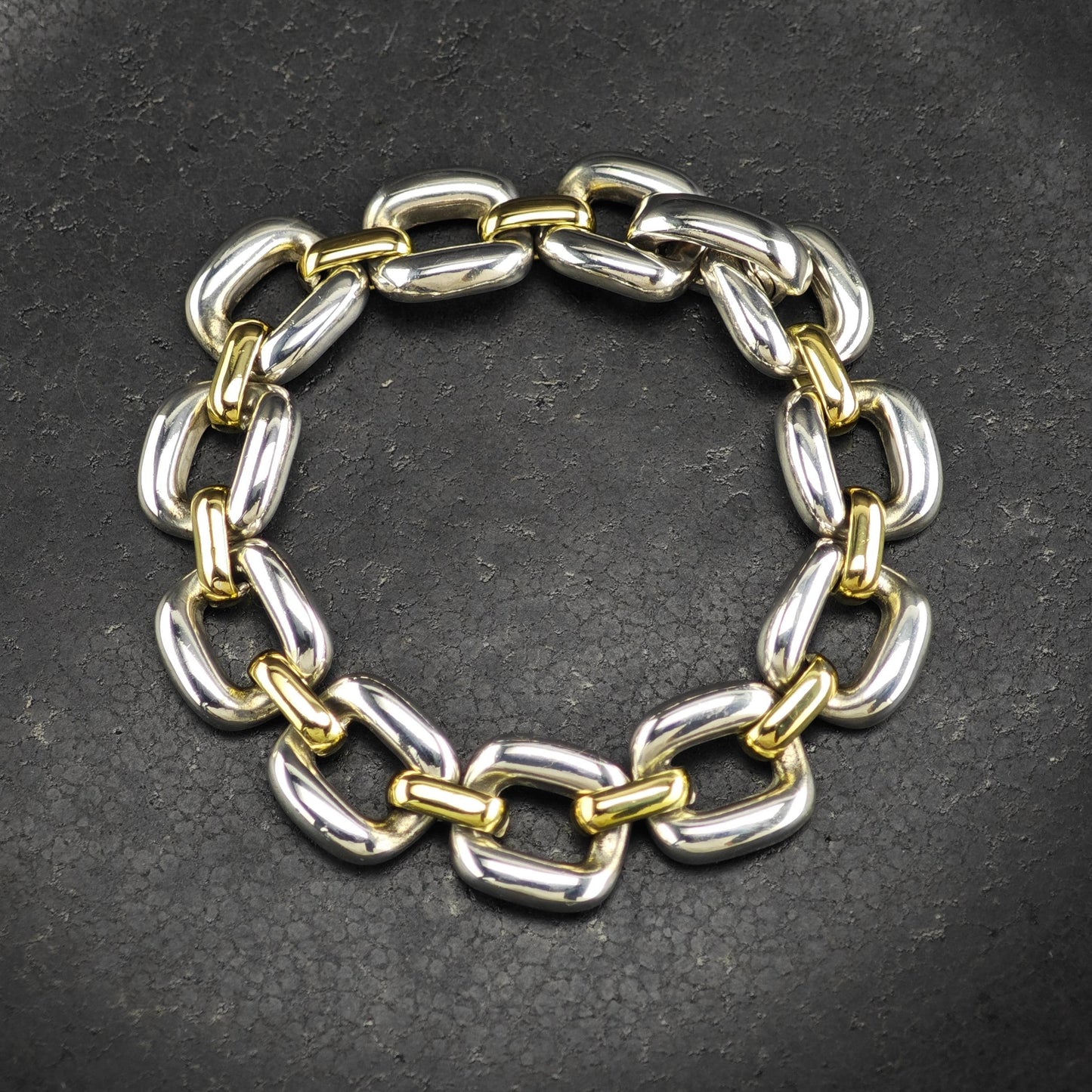 In good condition, this bracelet has been professionally cleaned and polished. It may exhibit some superficial scratches and a touch of patina, which add to its charm and character, reflecting its age. Notably, some of the gold links are securely soldered to the silver, ensuring durability without any looseness.