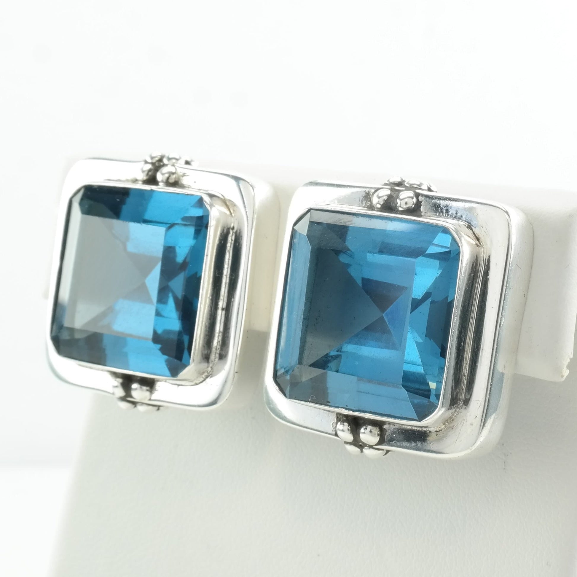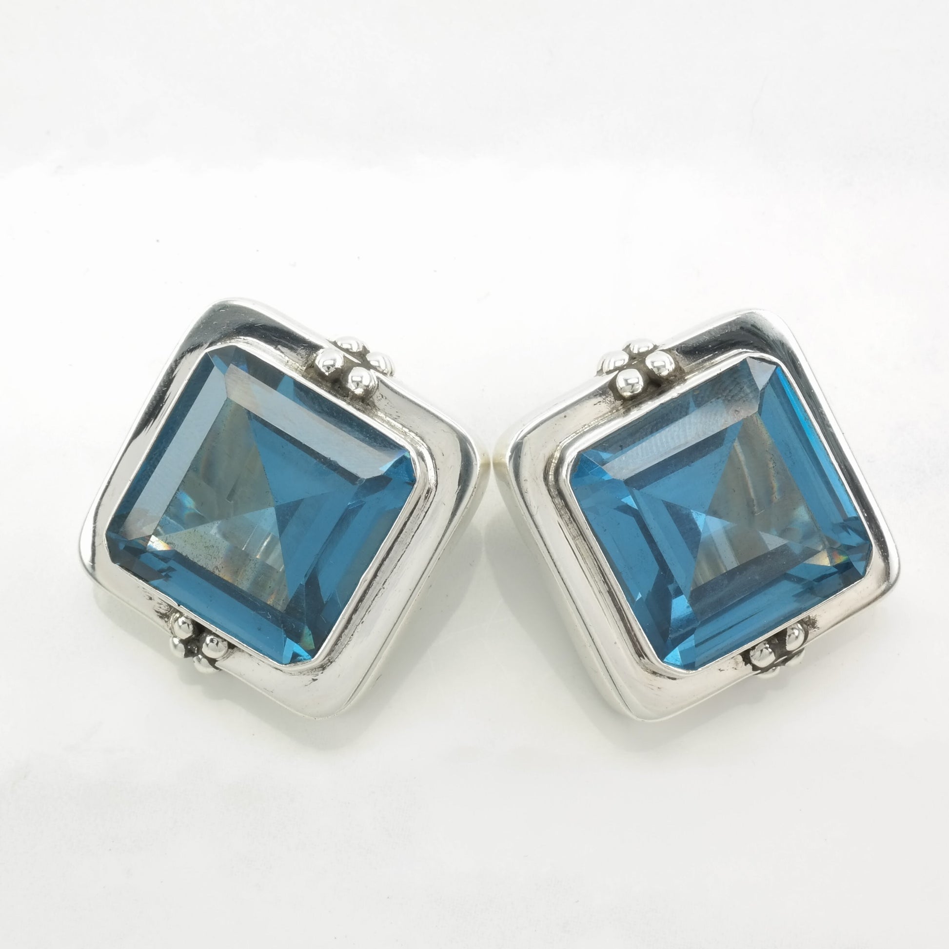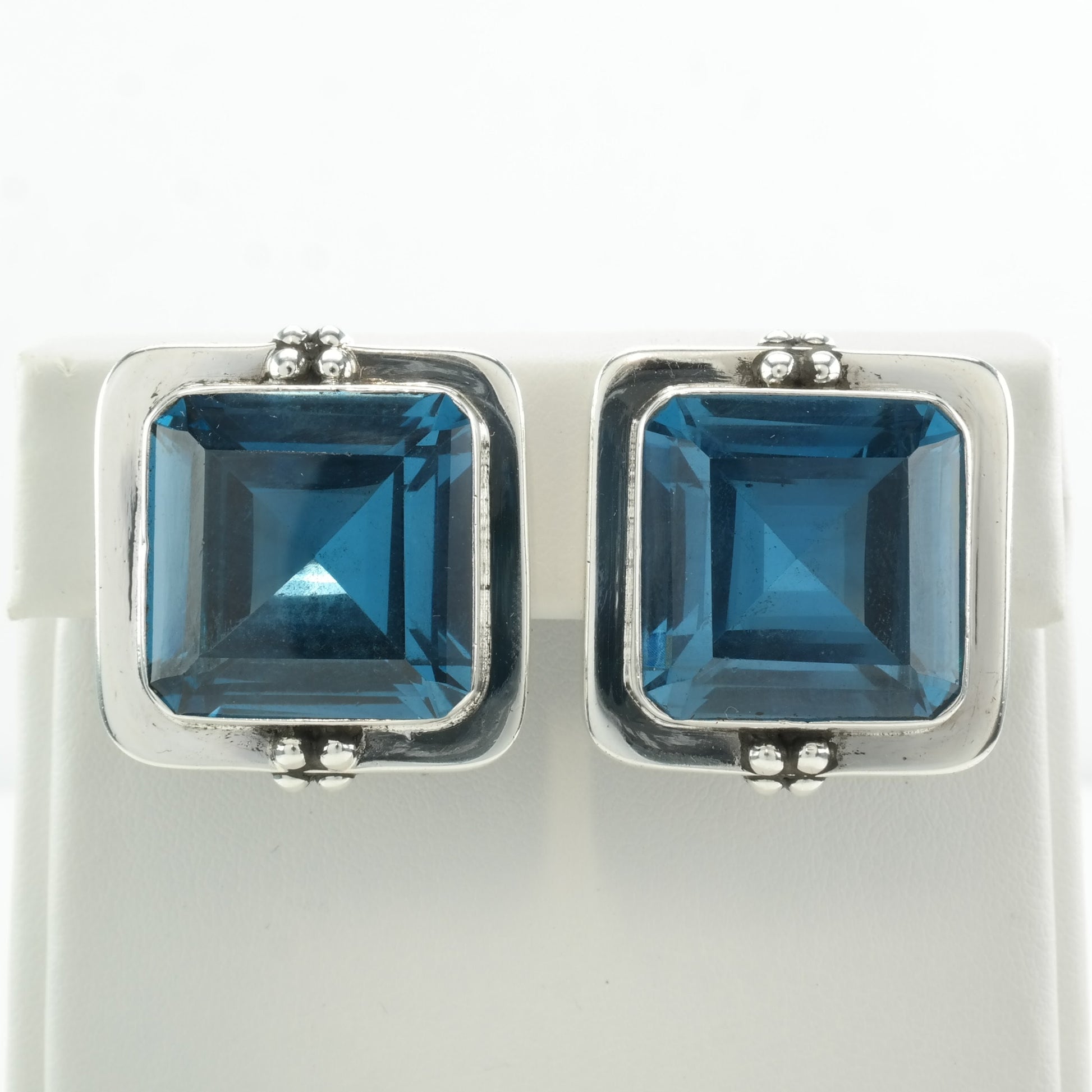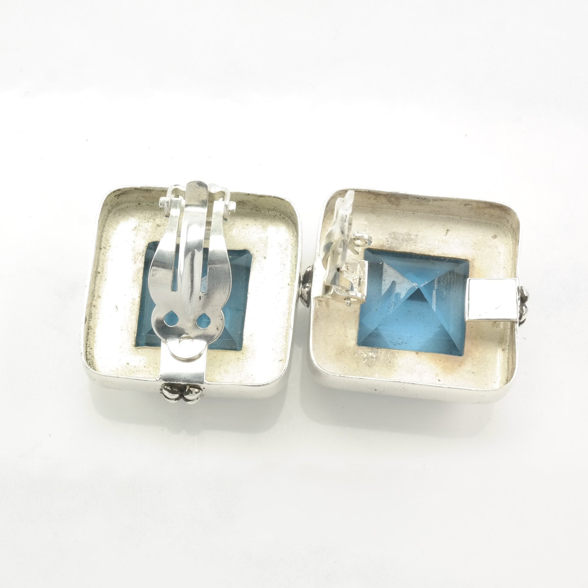 Modernist Sterling Silver Blue Large, Topaz Square Earrings Clip on