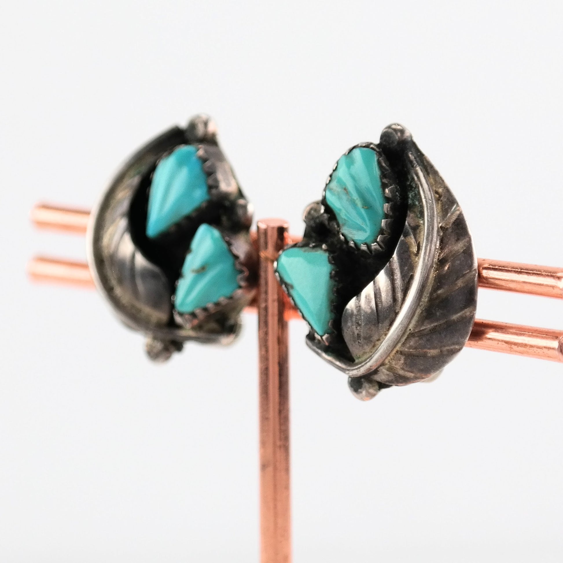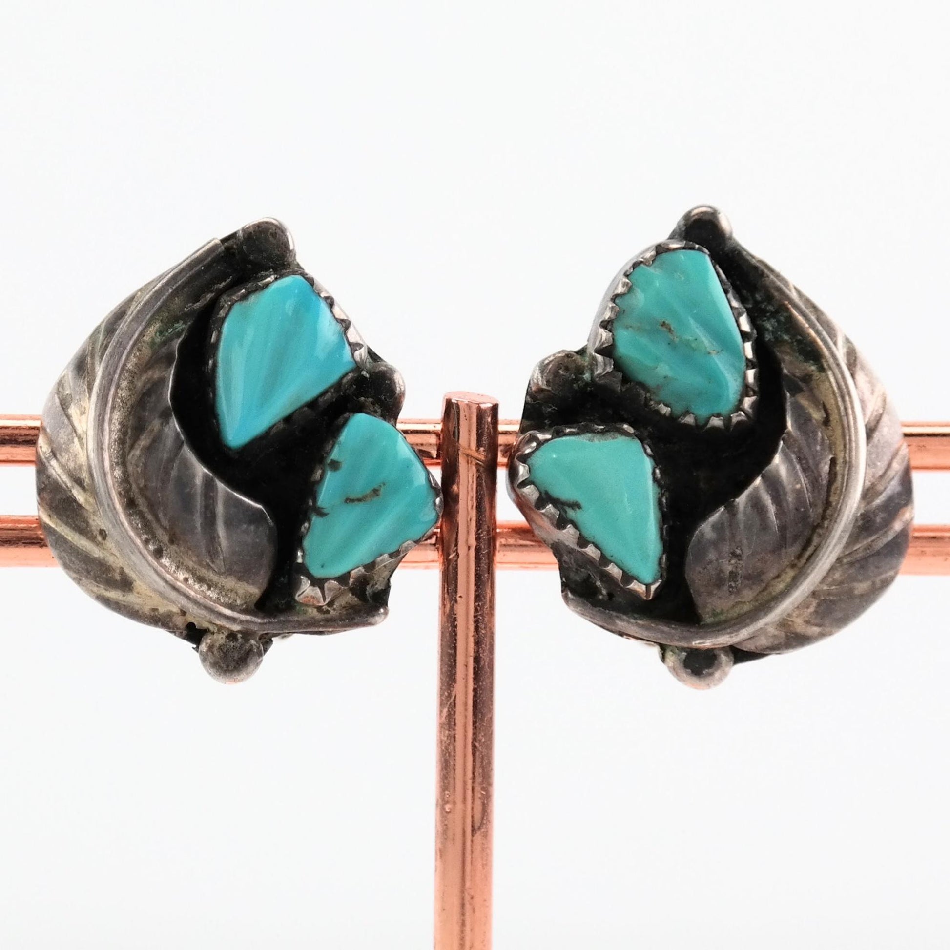 The condition of the earrings is Estate, Great, heavy patina, three turquoise stones are carved, one might be a replacement