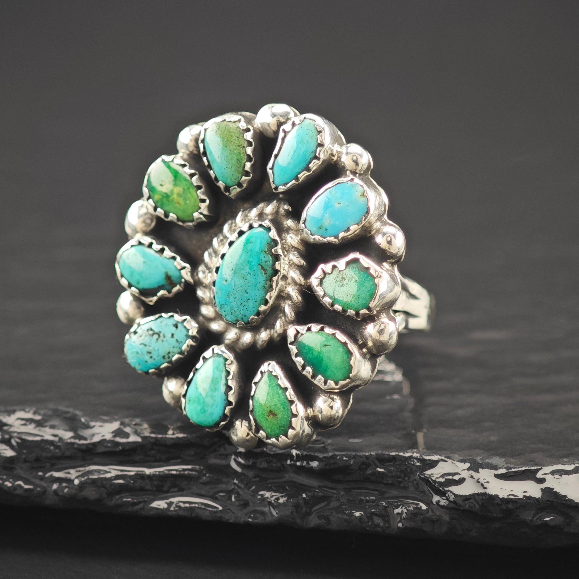 Discover the beauty of this stunning Native American Cluster Turquoise Ring, crafted from high-quality sterling silver. This exquisite piece is stamped and has been tested to guarantee its authenticity.