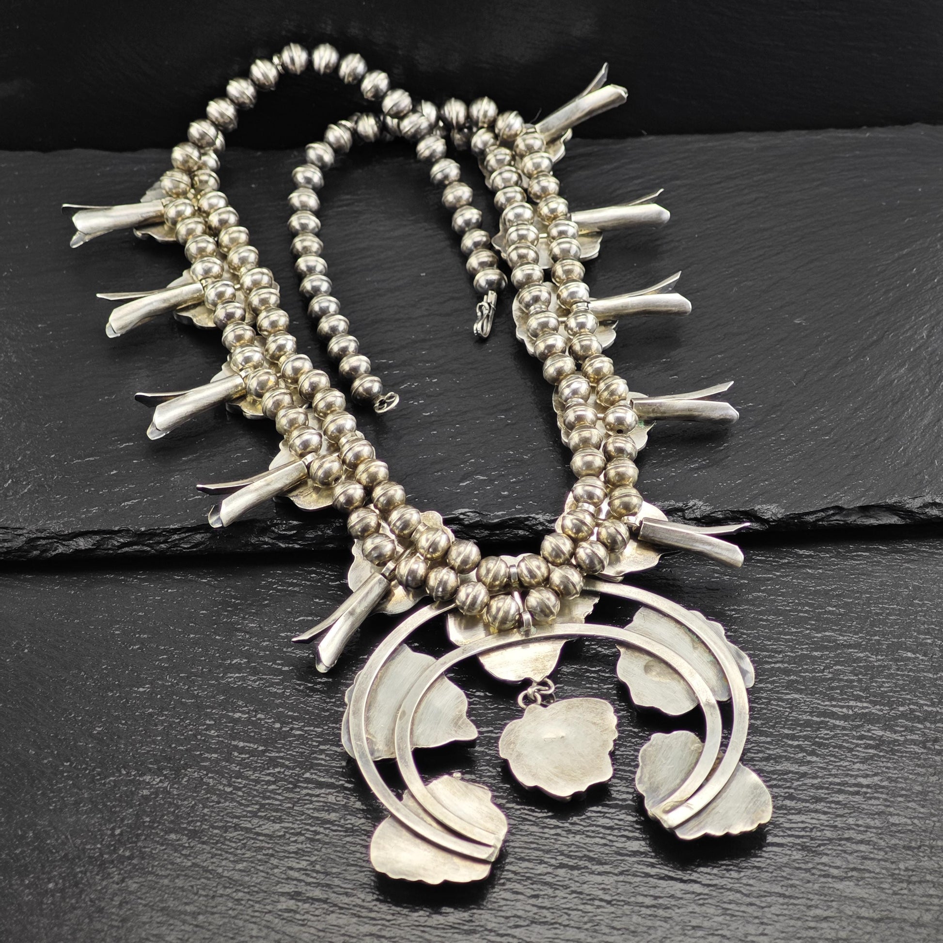 Discover a stunning piece of craftsmanship with this Vintage Native American Sterling Silver Squash Blossom Necklace, featuring exquisite Green Royston Turquoise. This striking necklace weighs 210.9 grams and showcases the natural beauty of Royston Turquoise, which has undergone industry-standard treatment. Please note that one corner of a stone has a minor crack; however, this does not affect the wearability of the necklace.