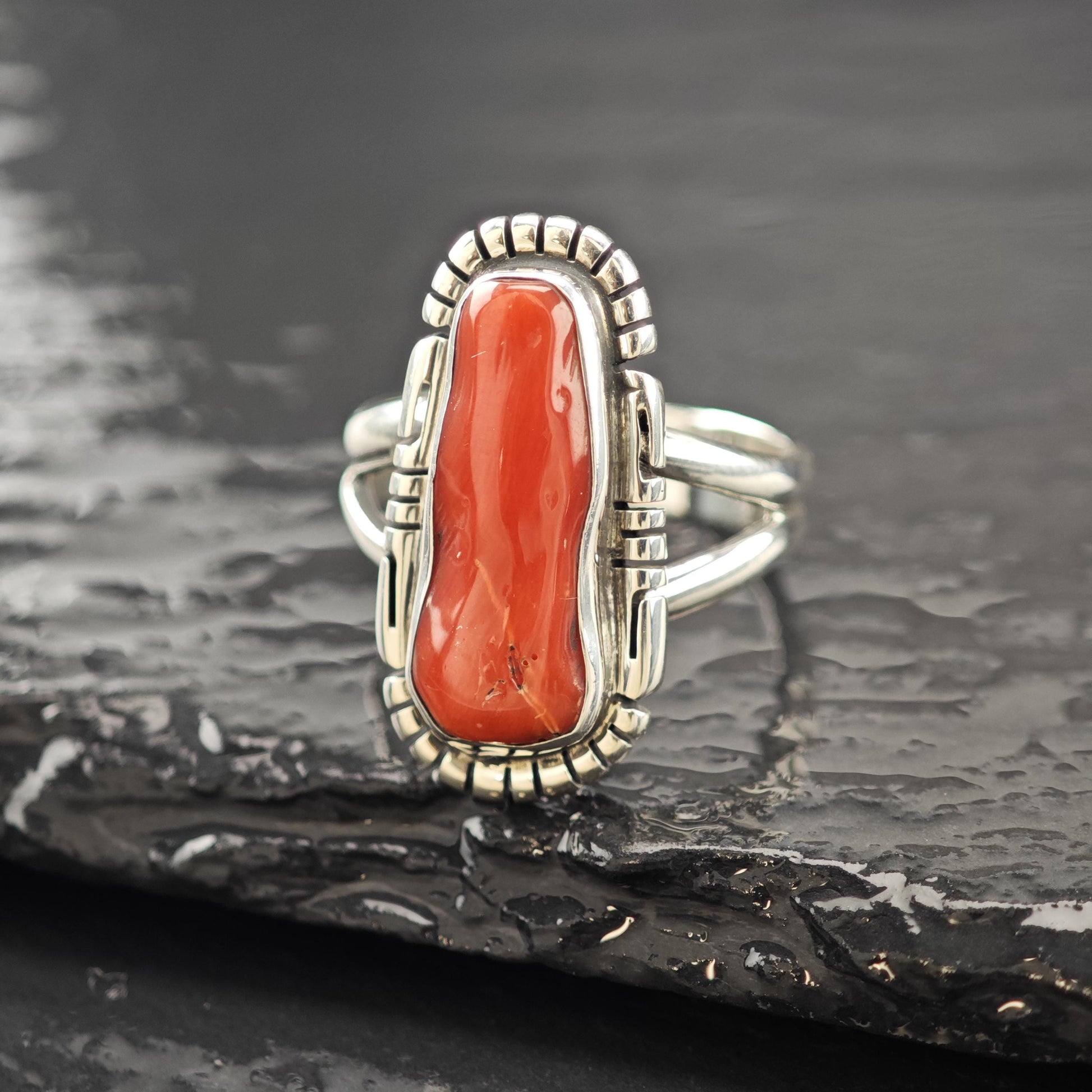 Native American Long Coral Ring Sterling Silver Size 9