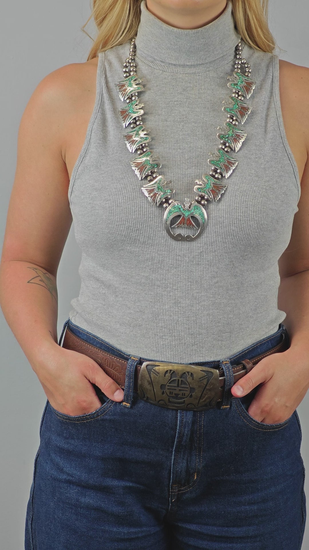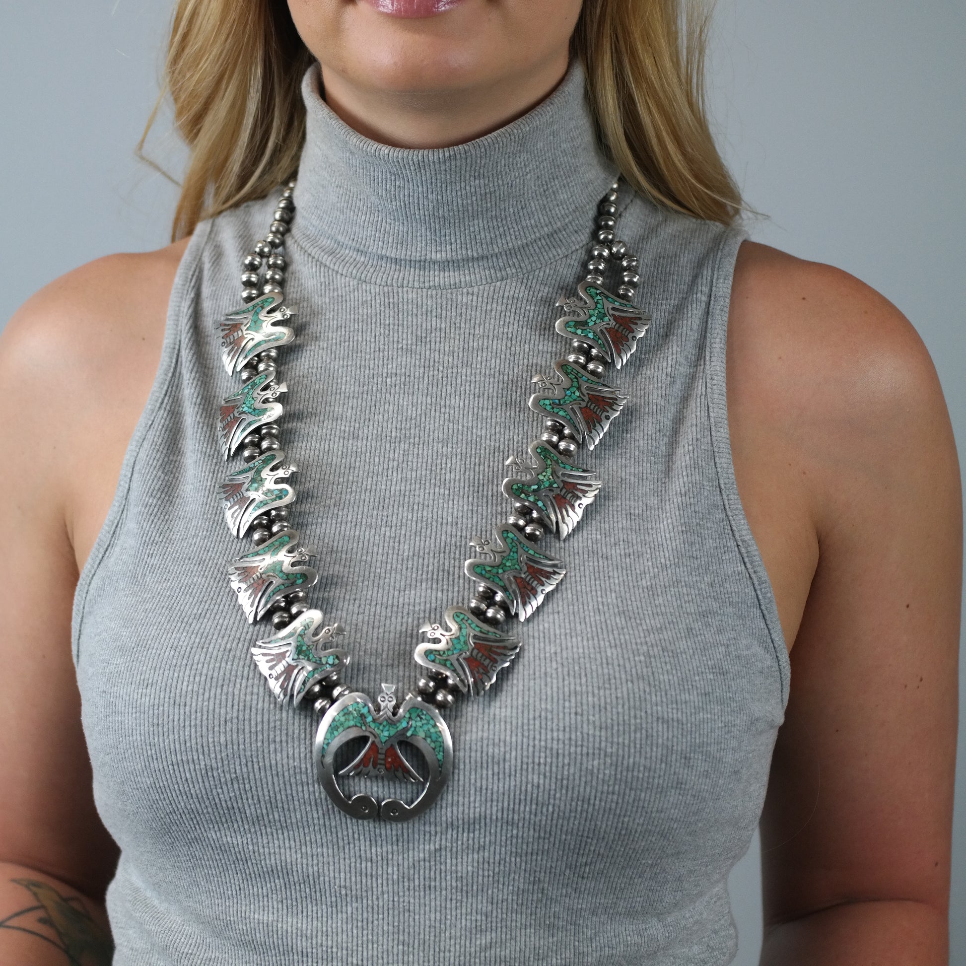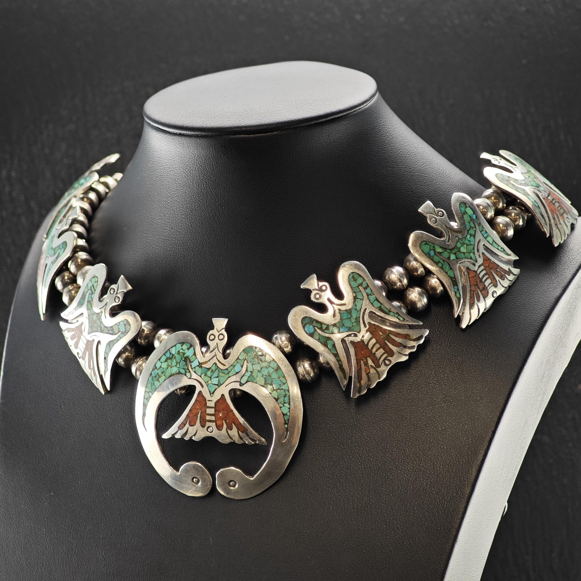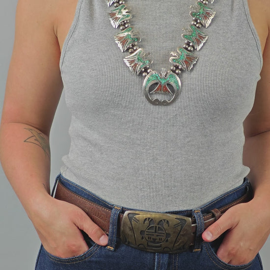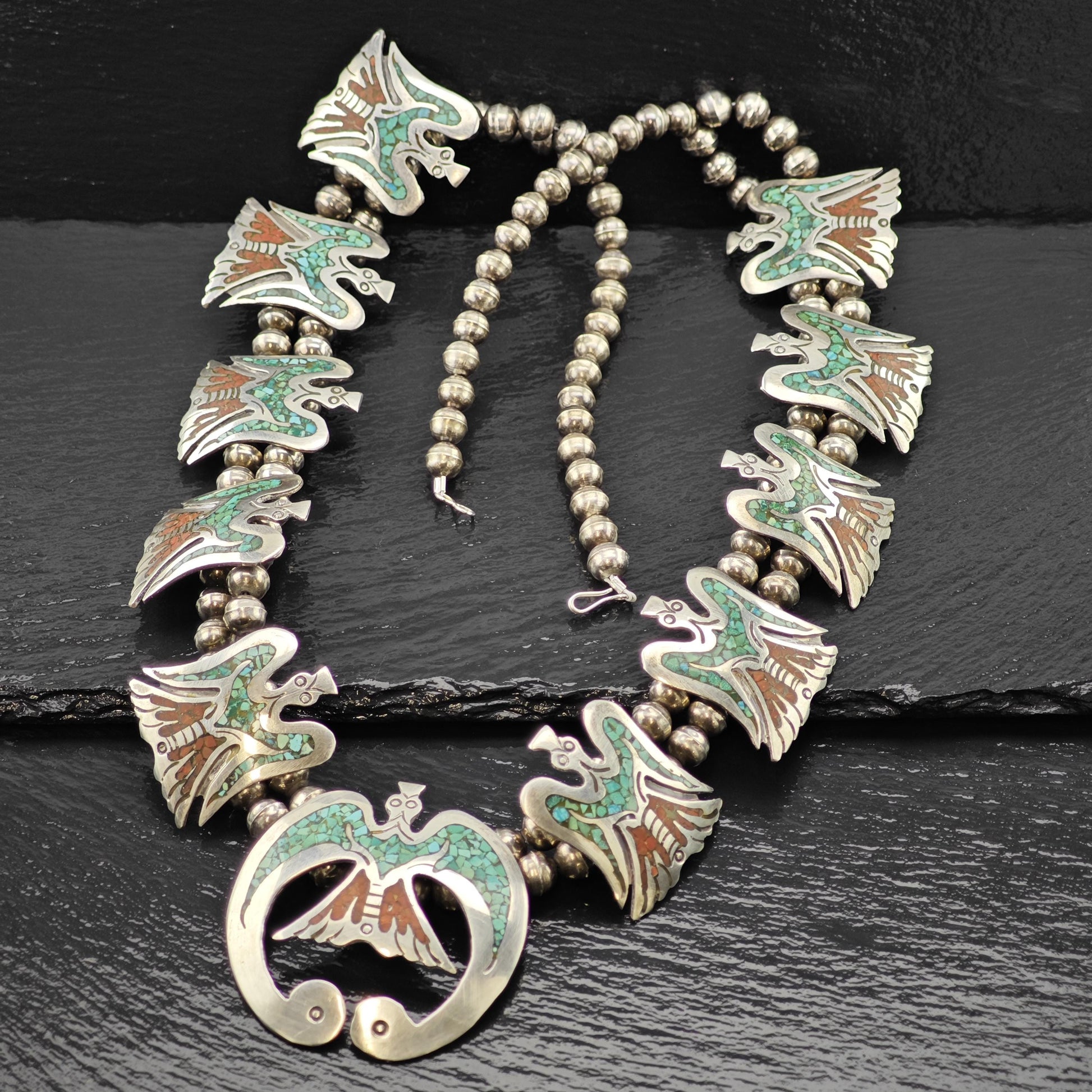 Discover the timeless beauty of this Native American inspired squash blossom necklace, featuring exquisite turquoise inlay and an eagle motif that honors traditional craftsmanship. This vintage silver bead necklace blends rich red and green hues, creating a striking statement piece perfect for collectors and lovers of authentic Native American made jewelry. Handcrafted with care, this sterling silver necklace carries a story of heritage and artistry.