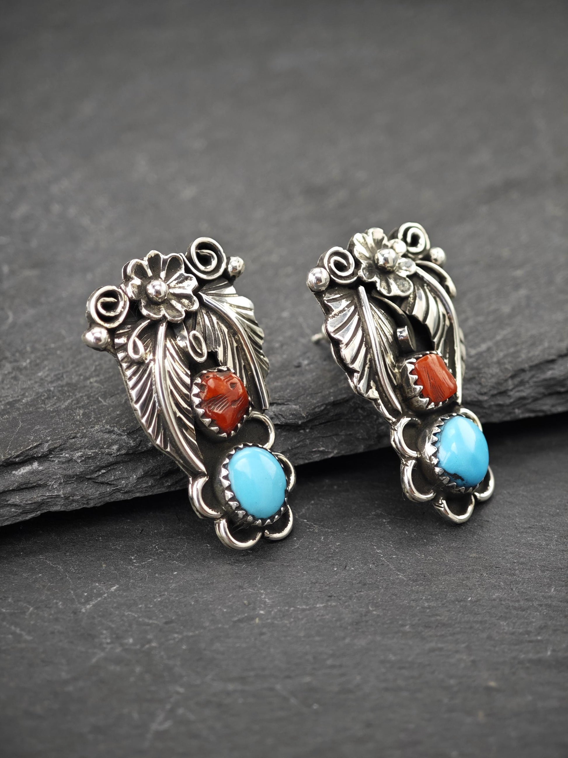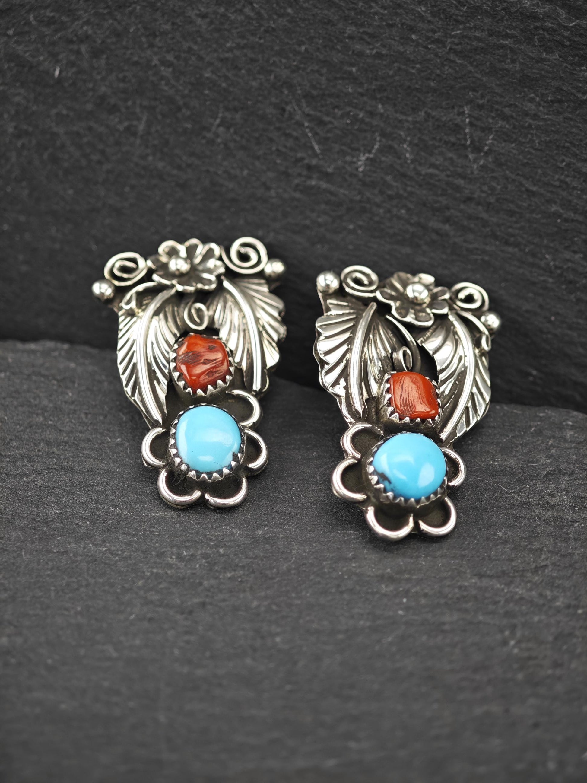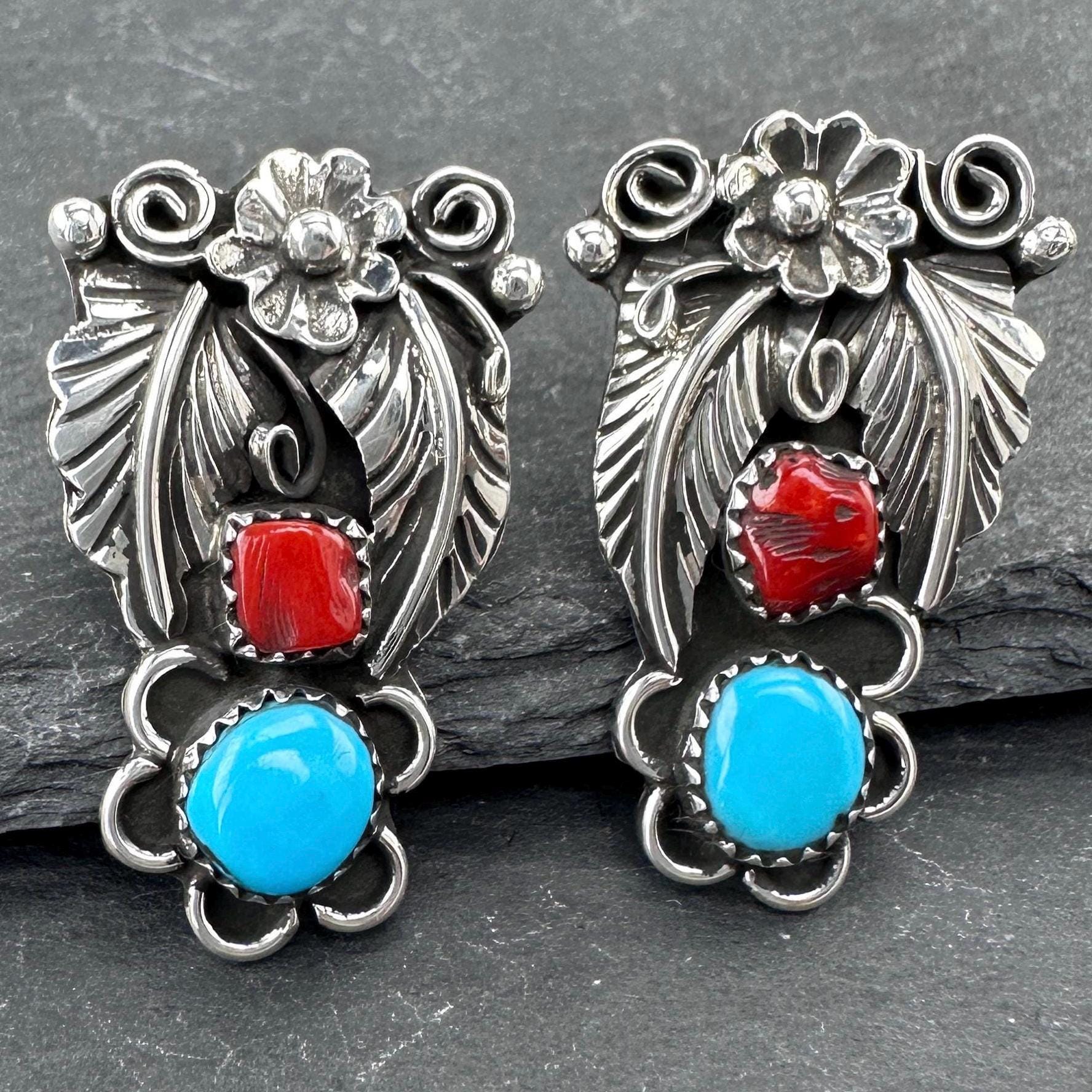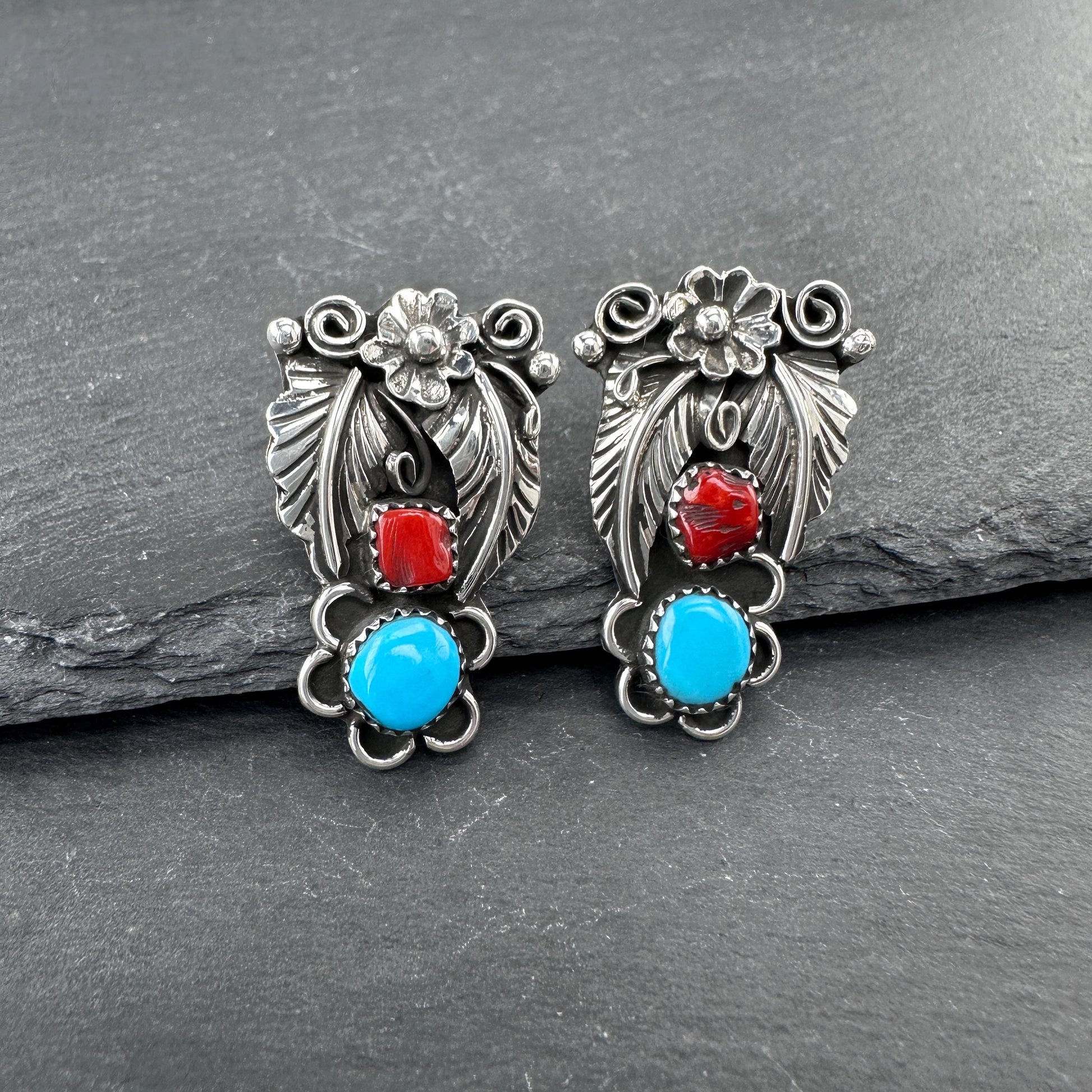 Native American Turquoise & Coral Stud Earrings Sterling Silver