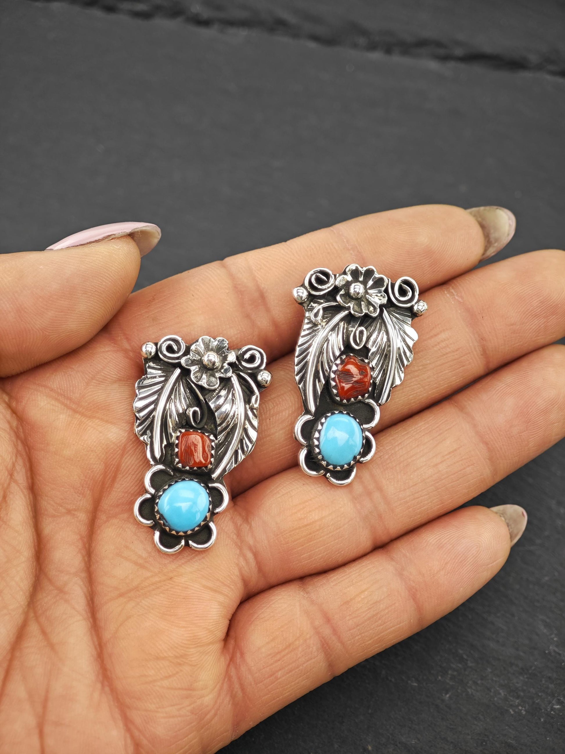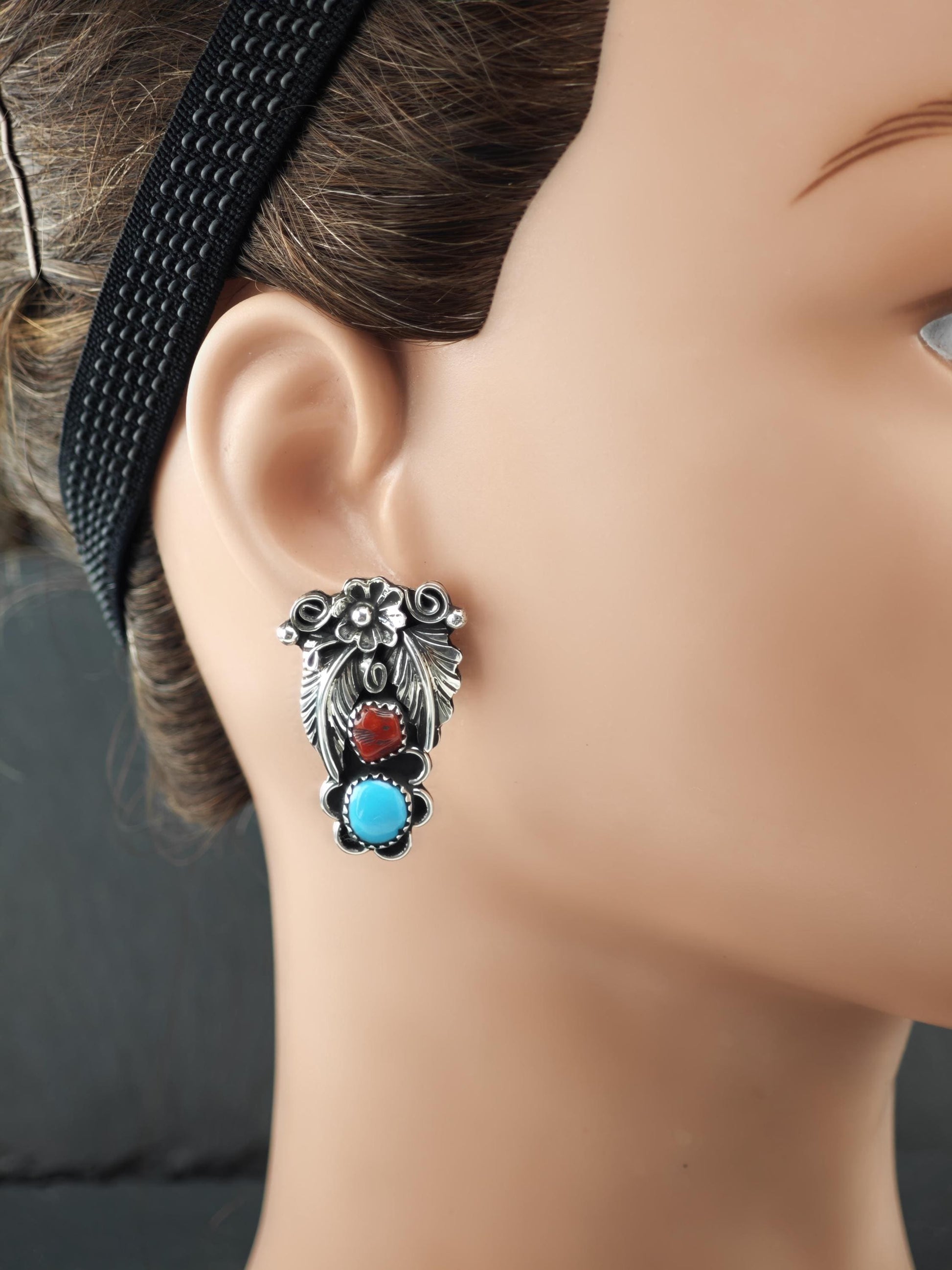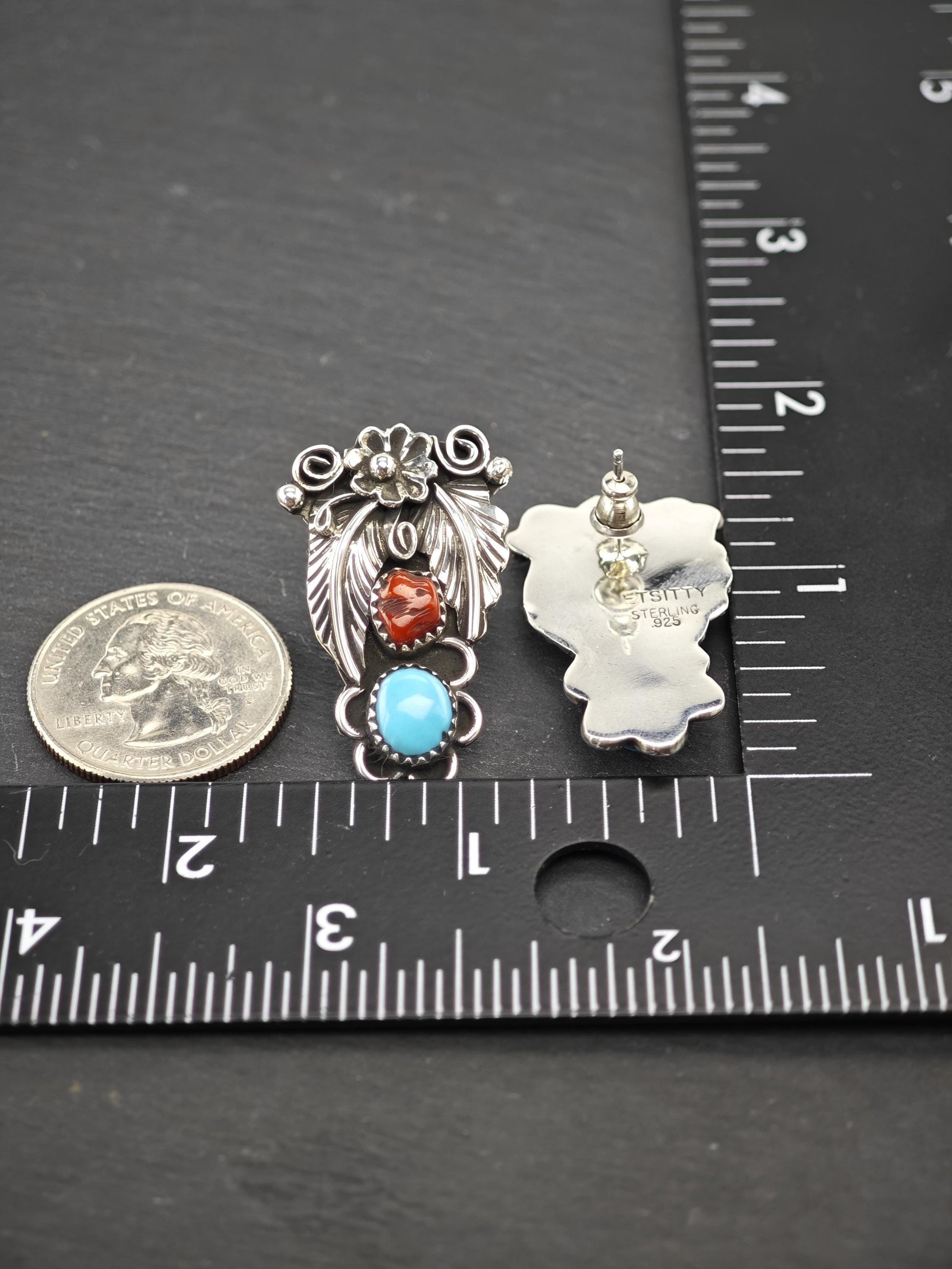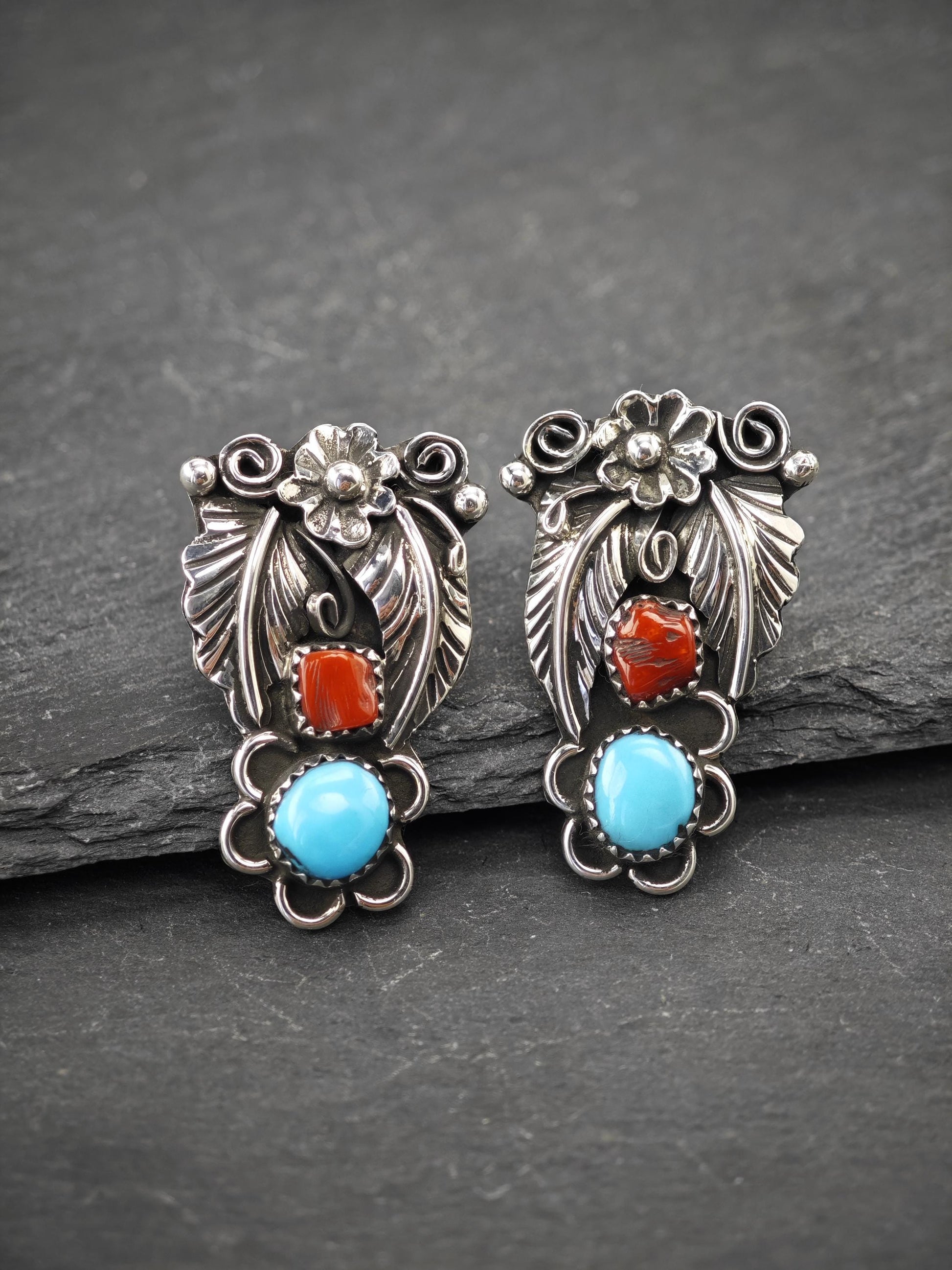 Native American Turquoise & Coral Stud Earrings Sterling Silver