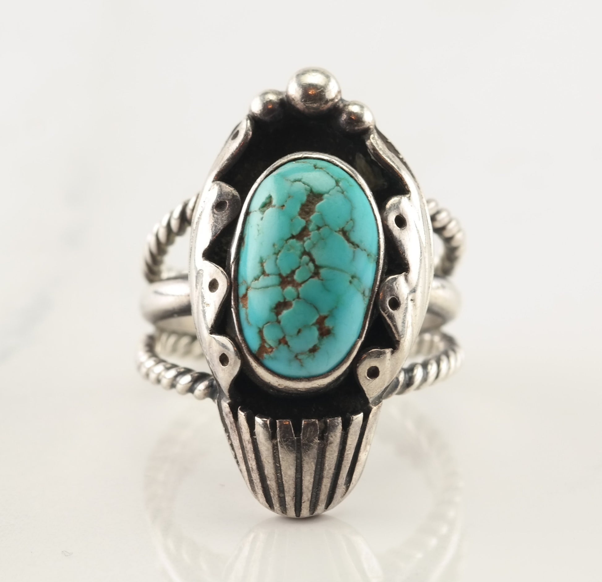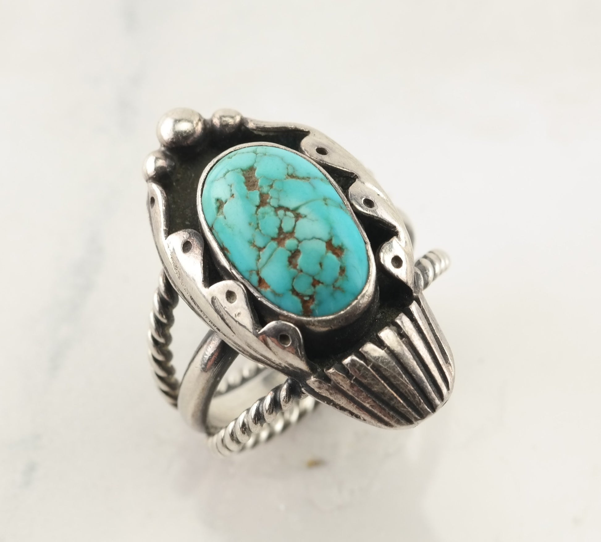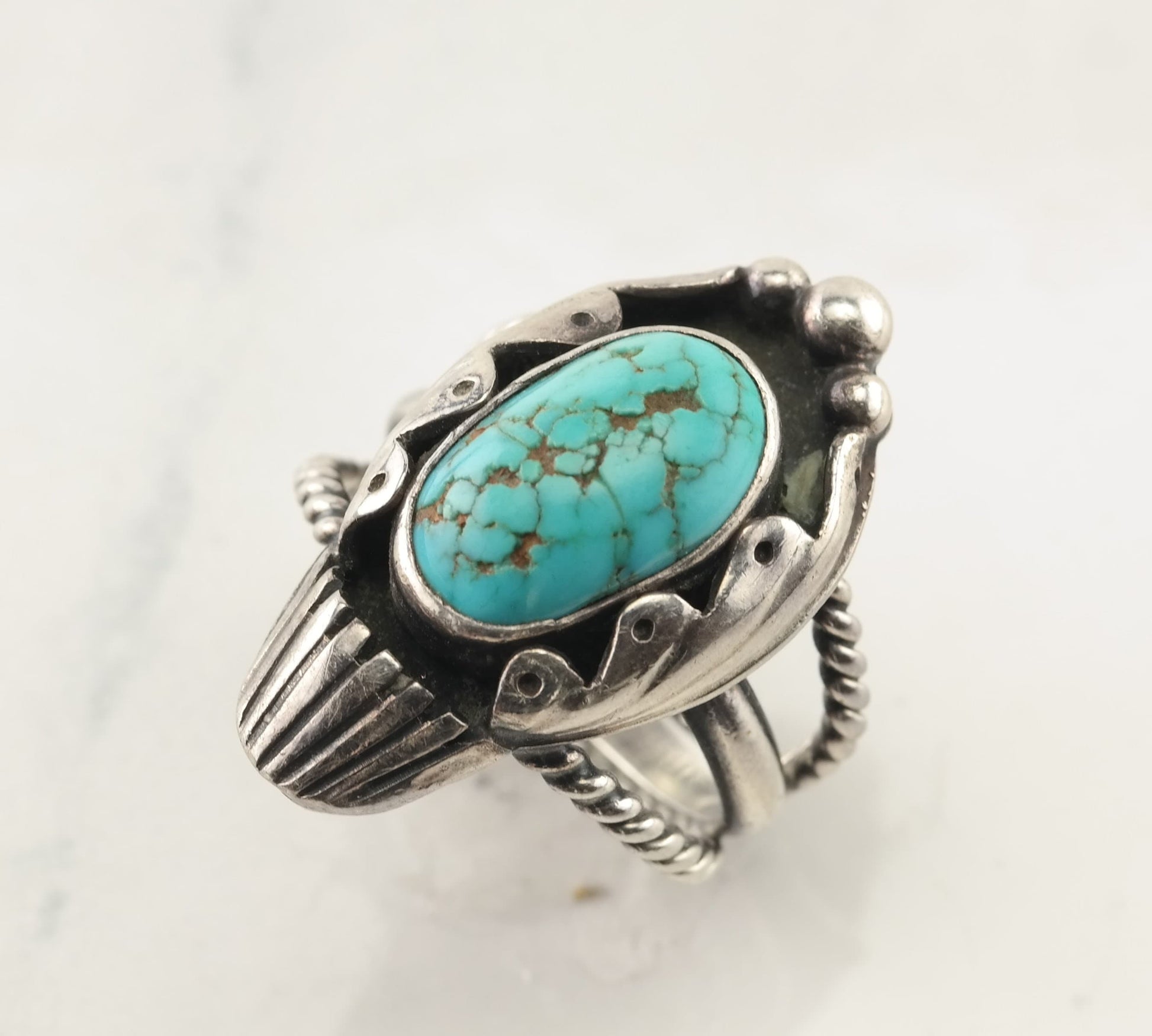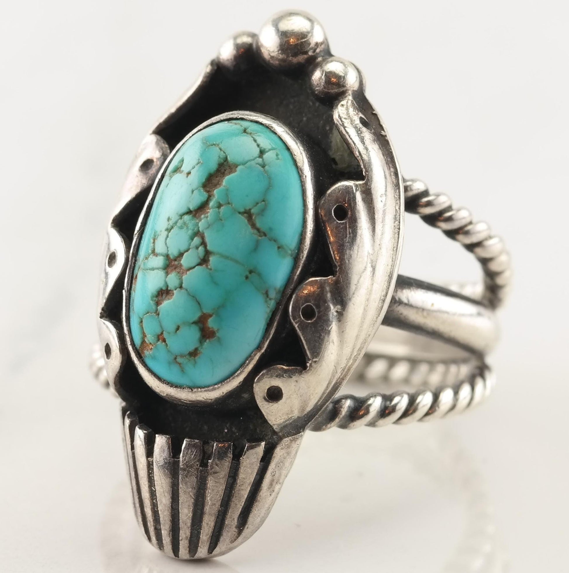 Native American Silver Ring Spiderweb Turquoise Shadowbox Sterling Size 7 1/2