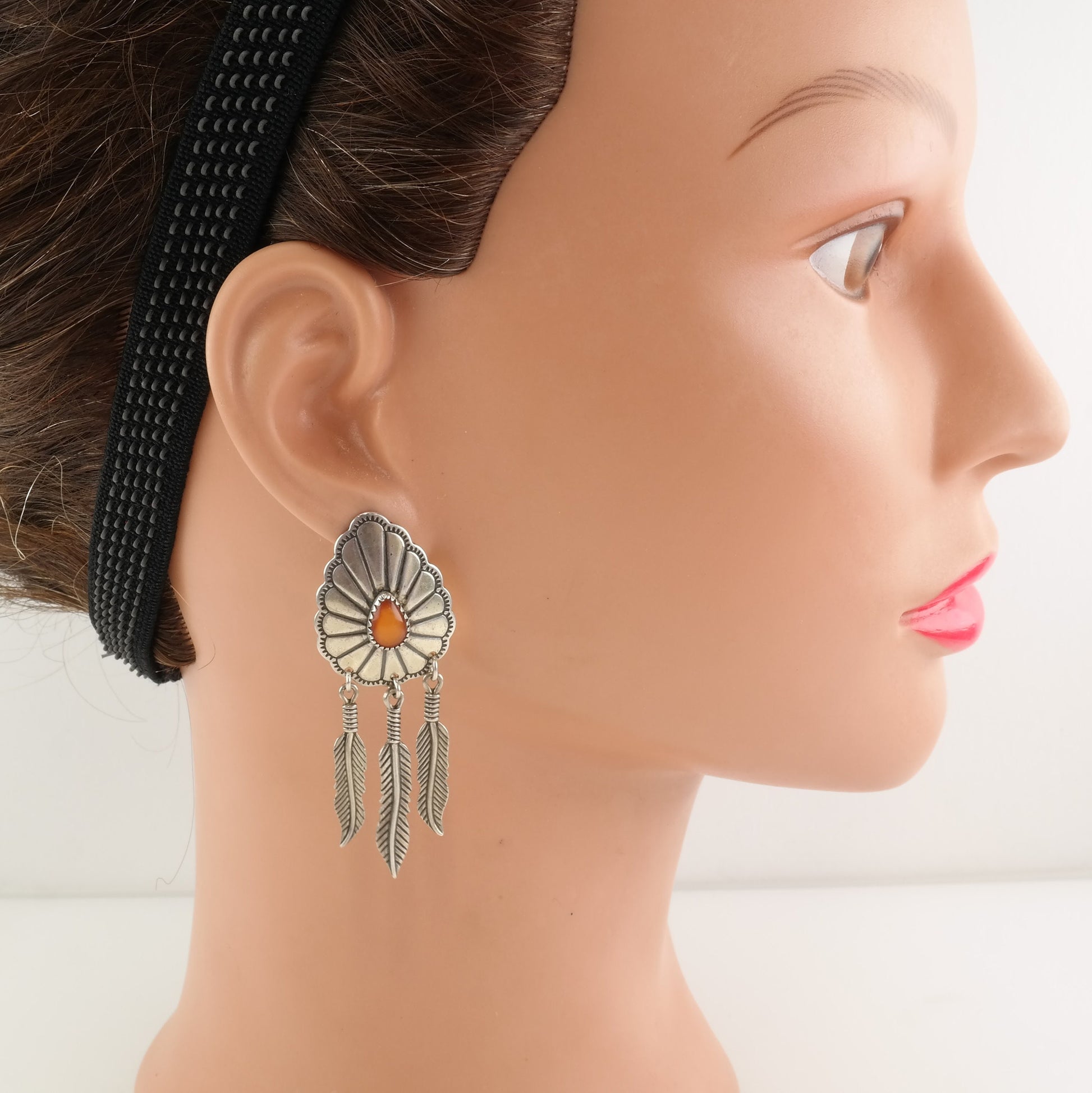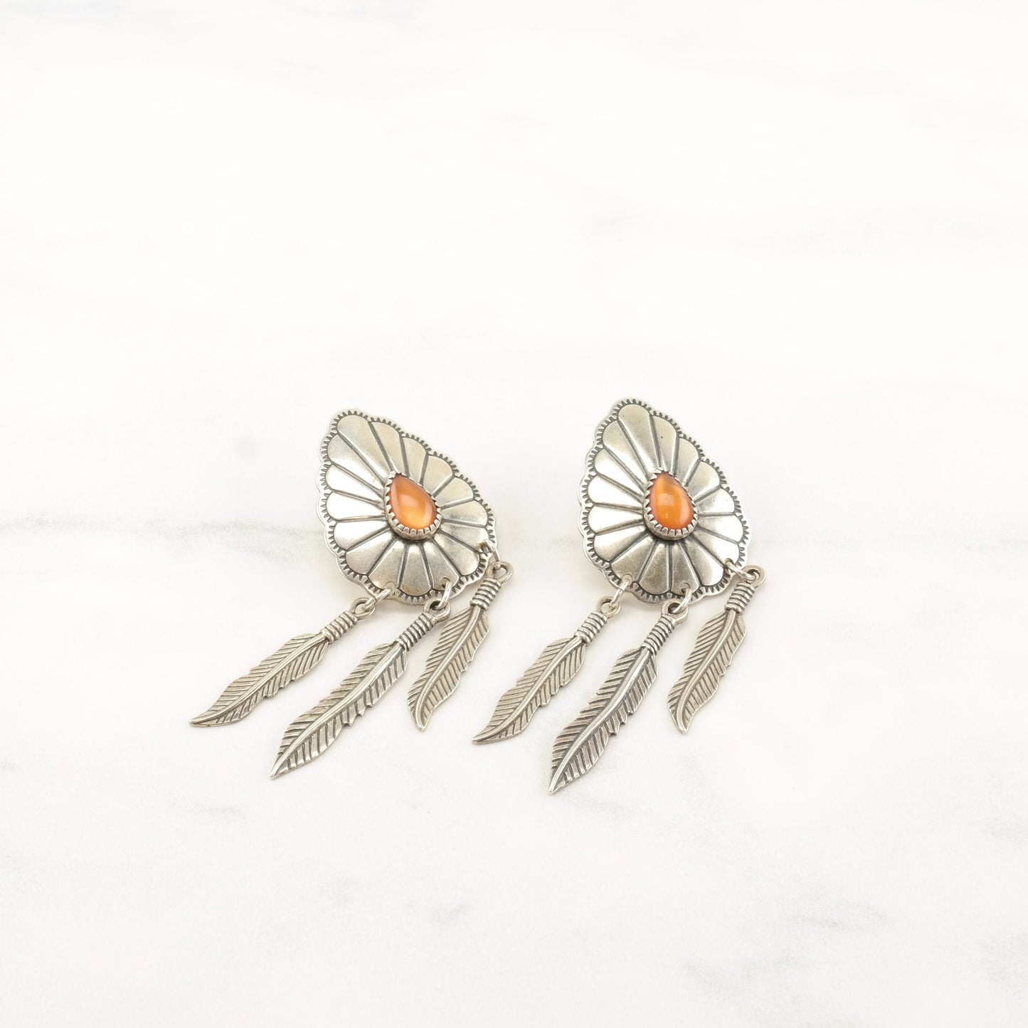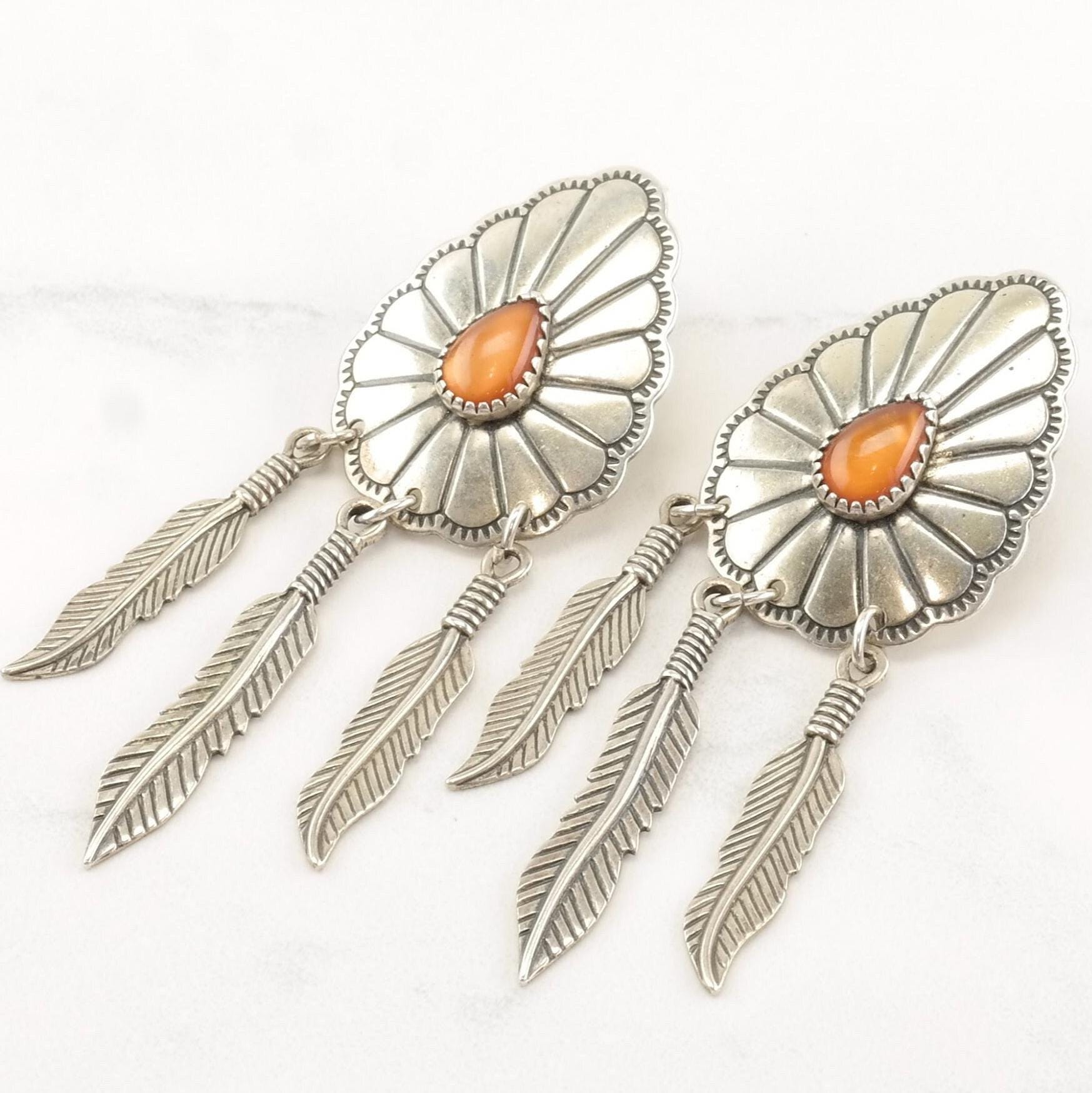 Native American Sterling Silver Amber MOP Doublet Concho Navajo Earrings Stud Dangle