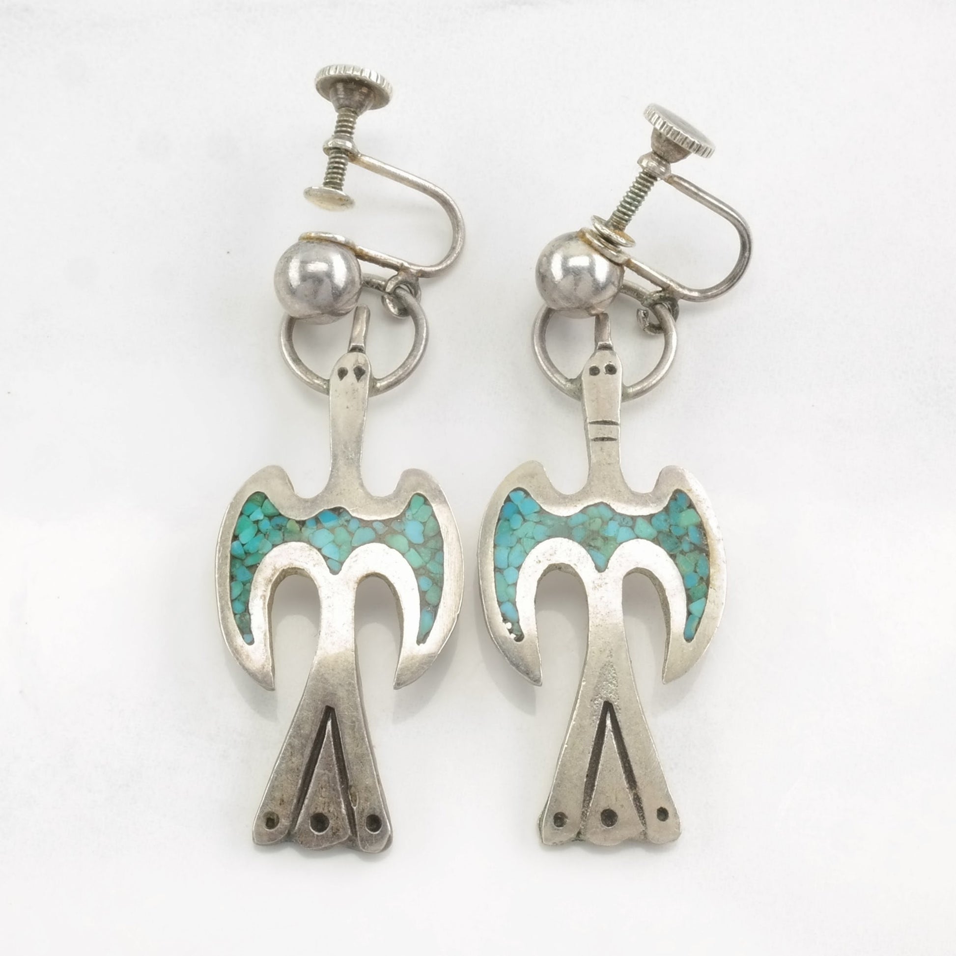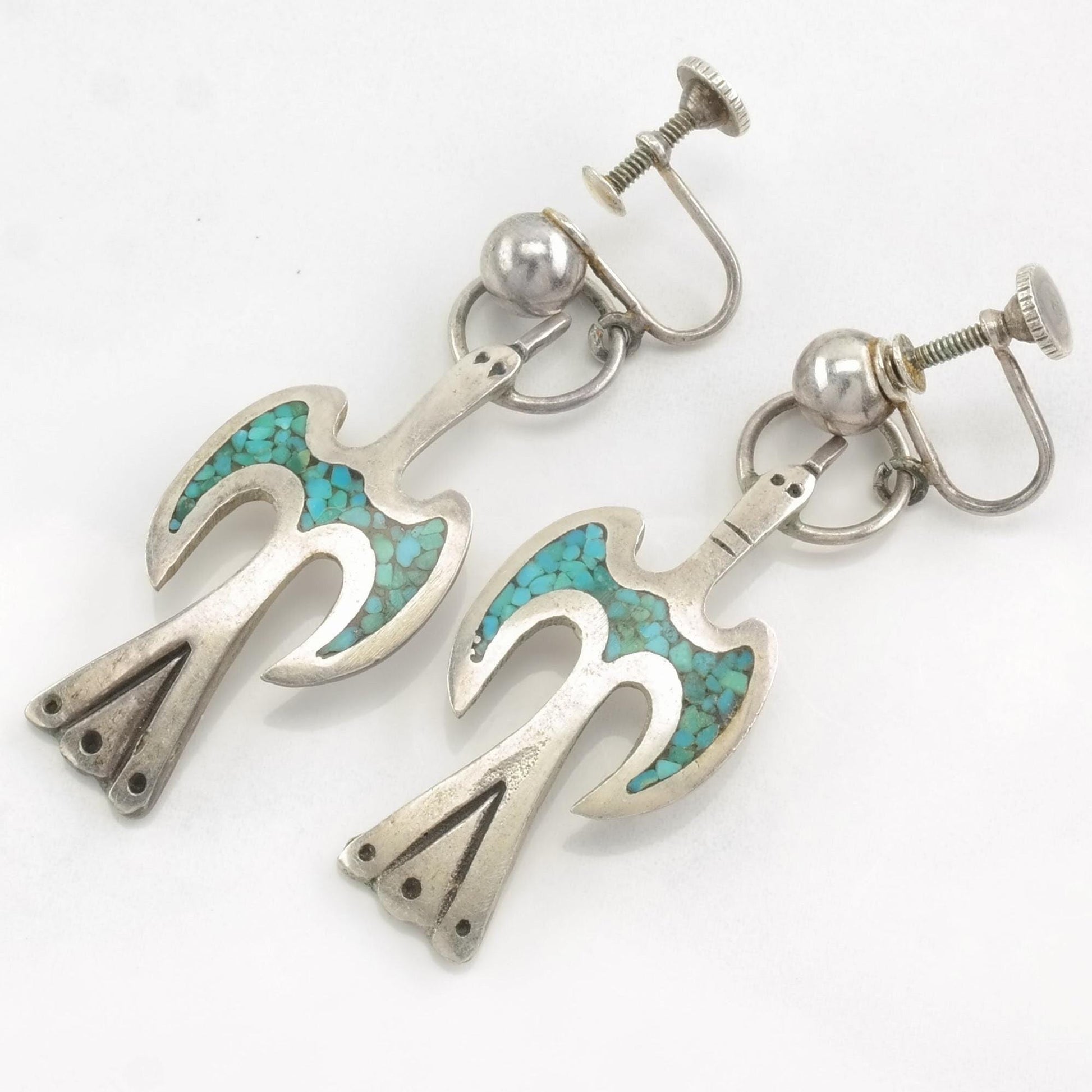 Native American Sterling Silver Blue Crushed Turquoise Inlay Bird Earrings Screwback, Dangle