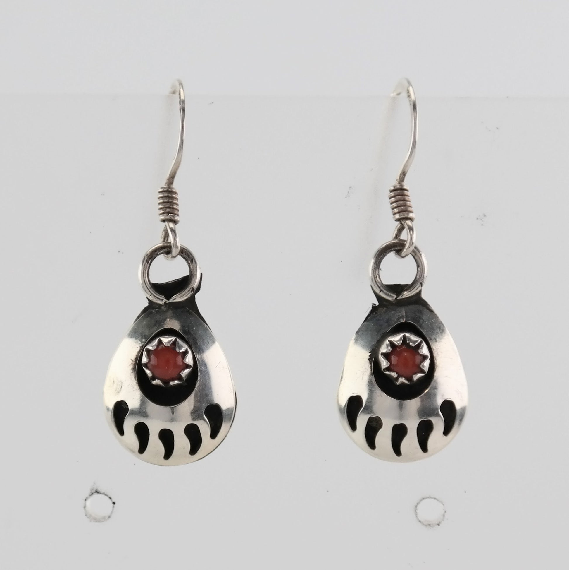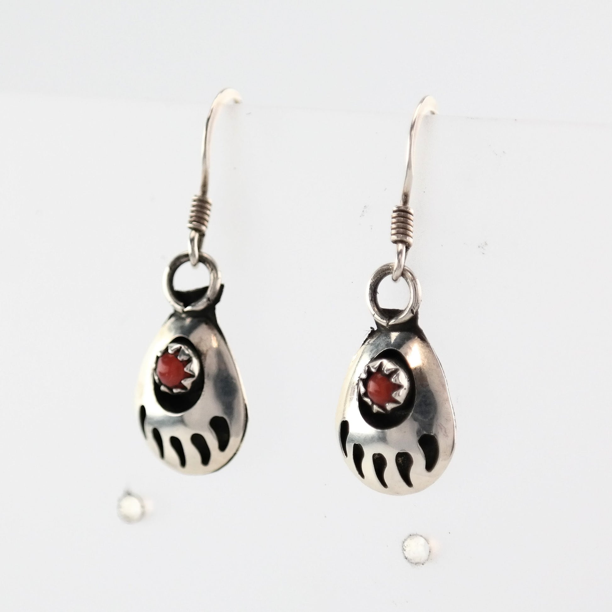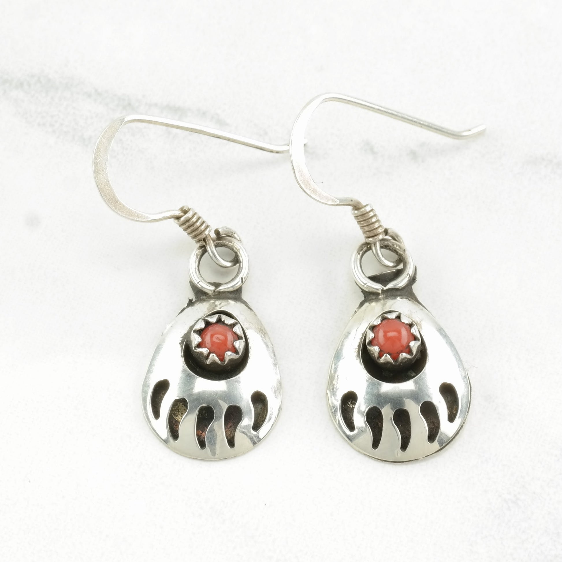 Native American Sterling Silver Coral Bear Paw Earrings Fish hook