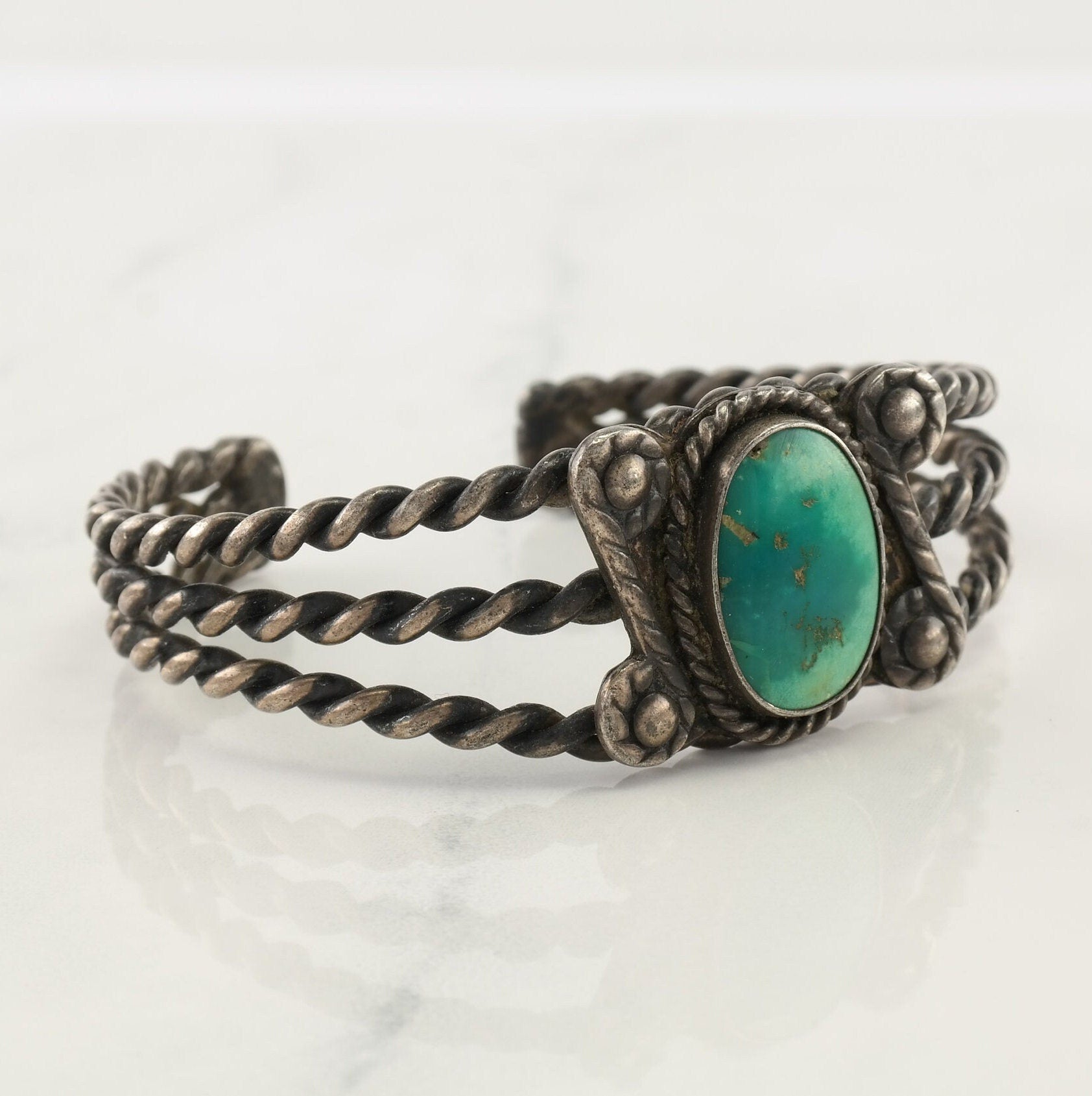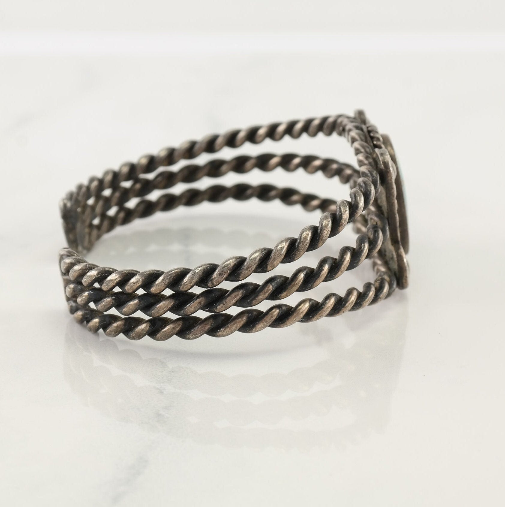 Native American Sterling Silver Cuff Bracelet Greenish Braided Rope Turquoise
