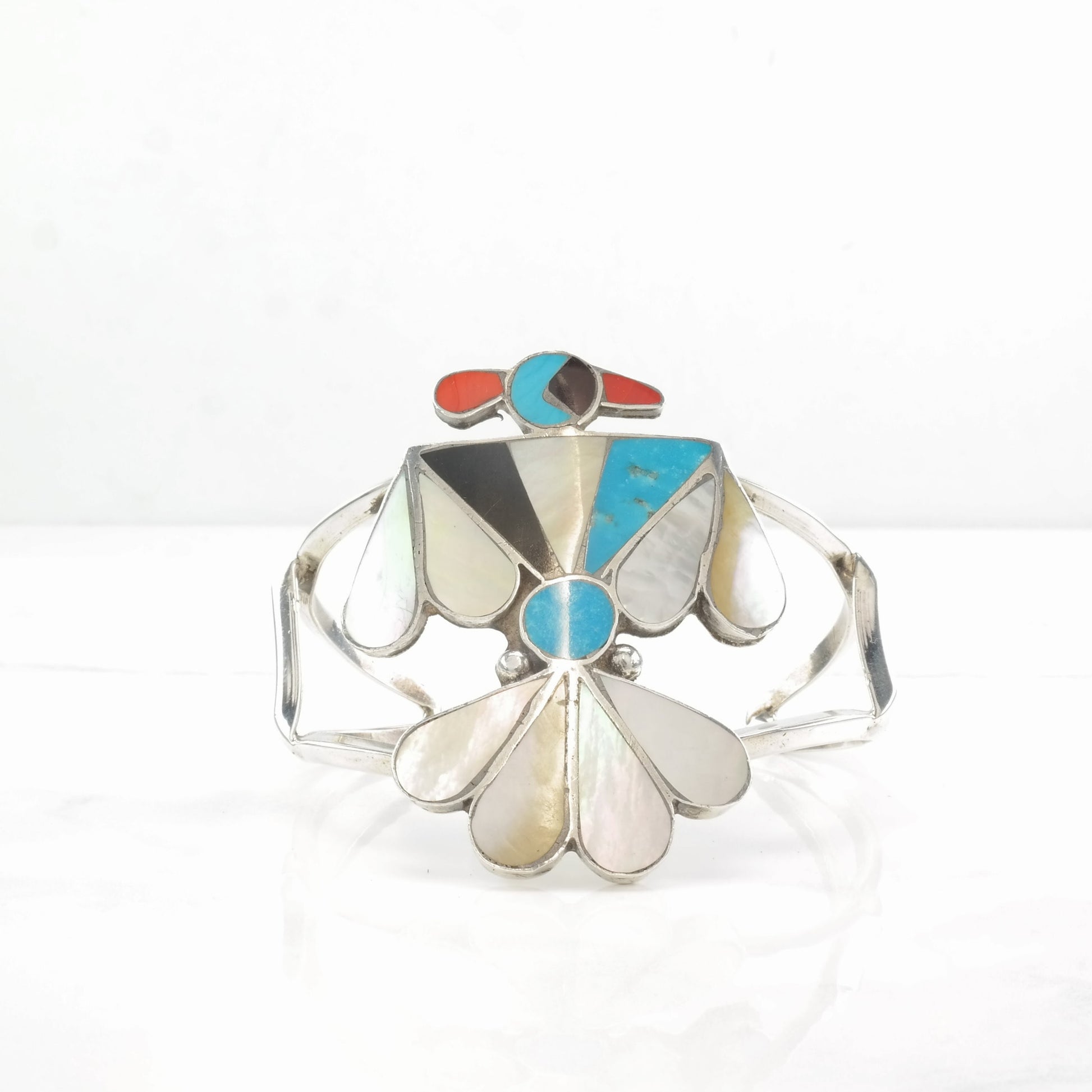 Native American Sterling Silver Cuff Bracelet MOP, Turquoise, Coral, Jet, Thunderbird