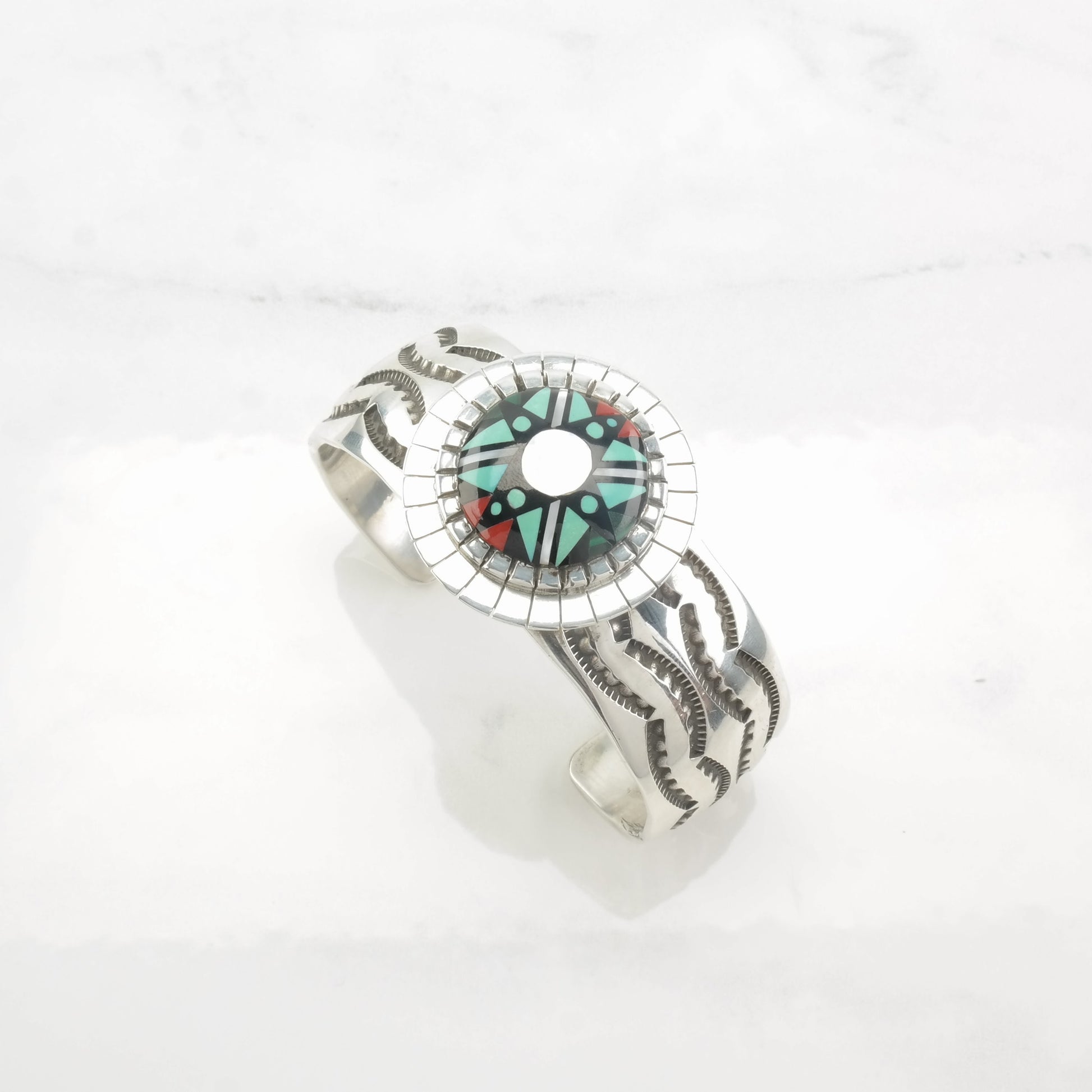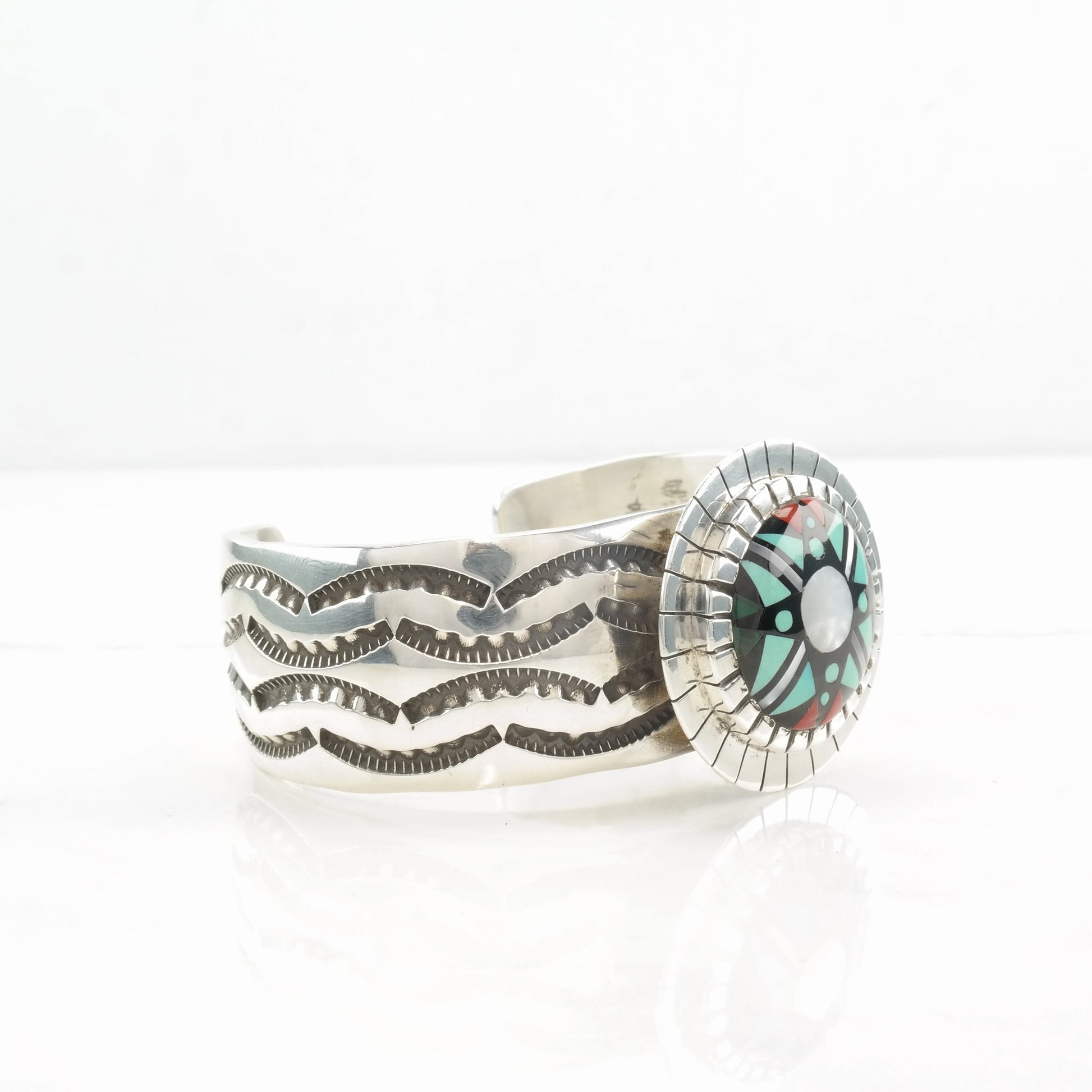Native American Sterling Silver Cuff Bracelet Multi Gemstone Inlay
