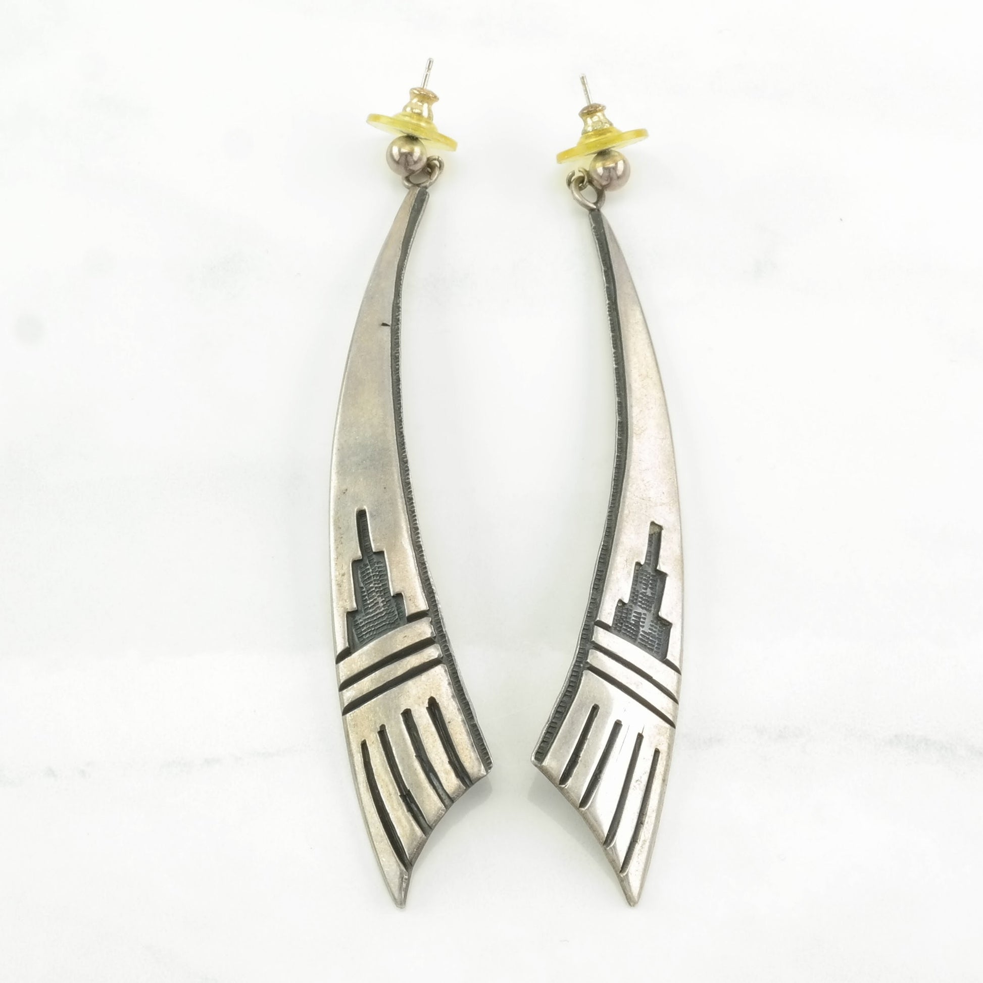 Native American Sterling Silver Long Overlay Earrings Stud Dangle