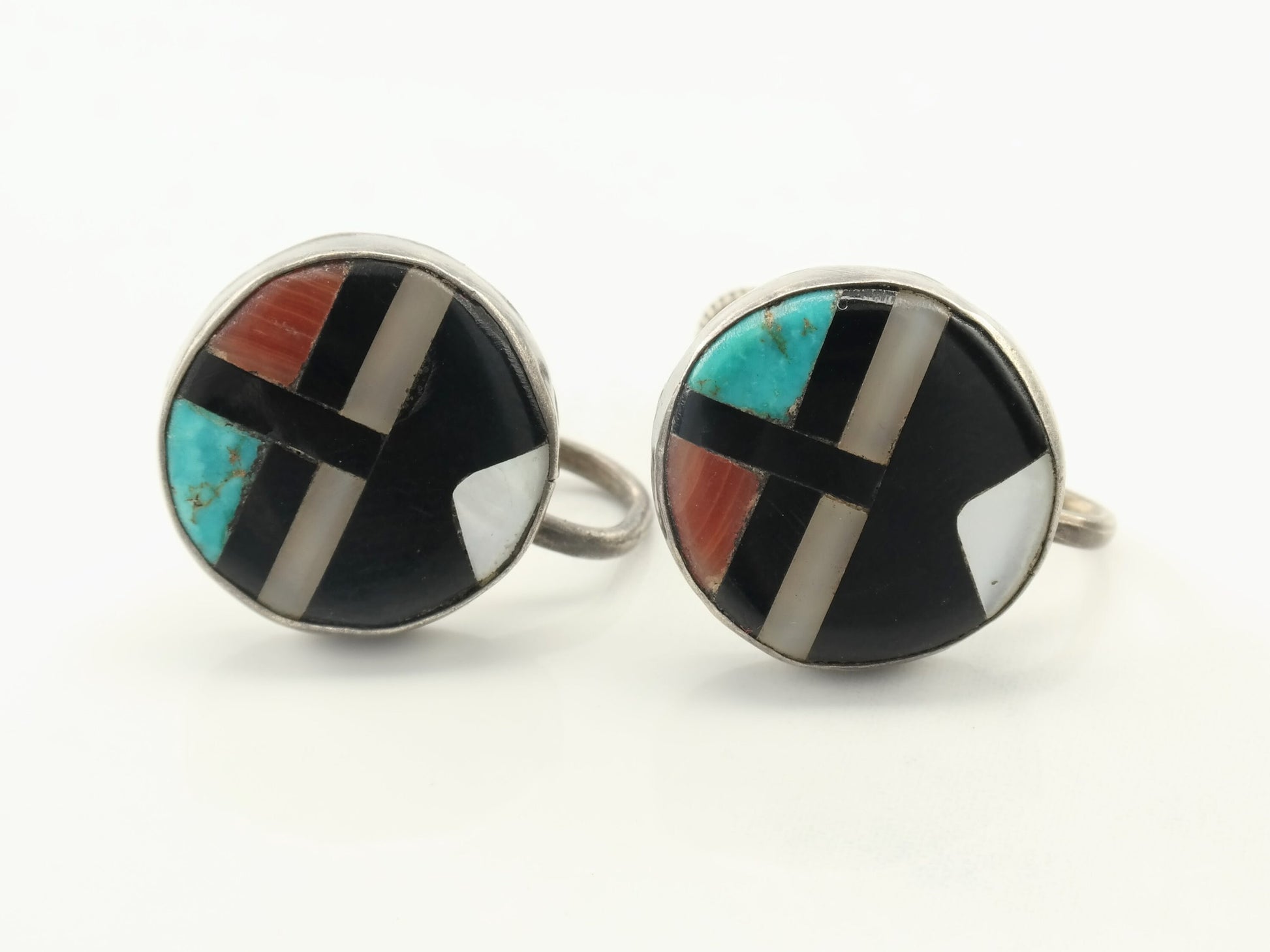 Native American Sterling Silver Multi Gem Inlay Earrings Screw Back