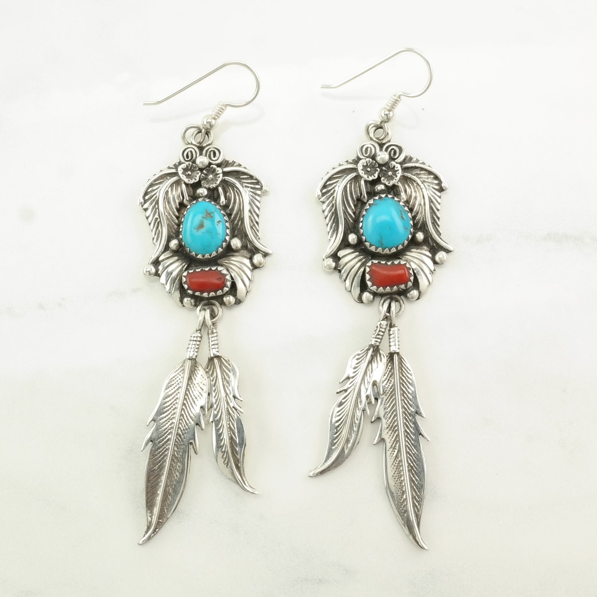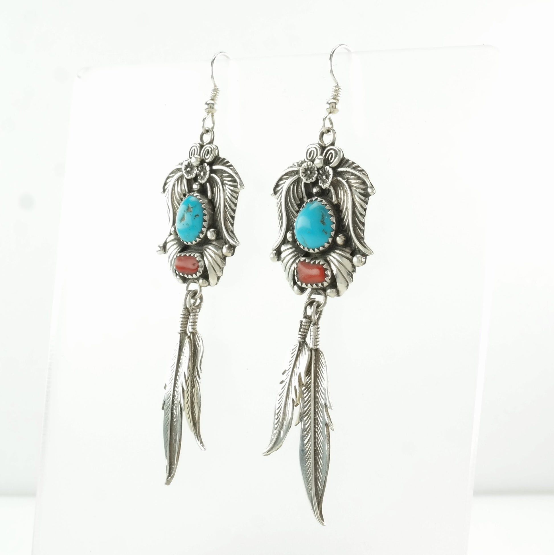 Native American Sterling Silver Turquoise, Coral Feather, Floral Earrings Fish hook