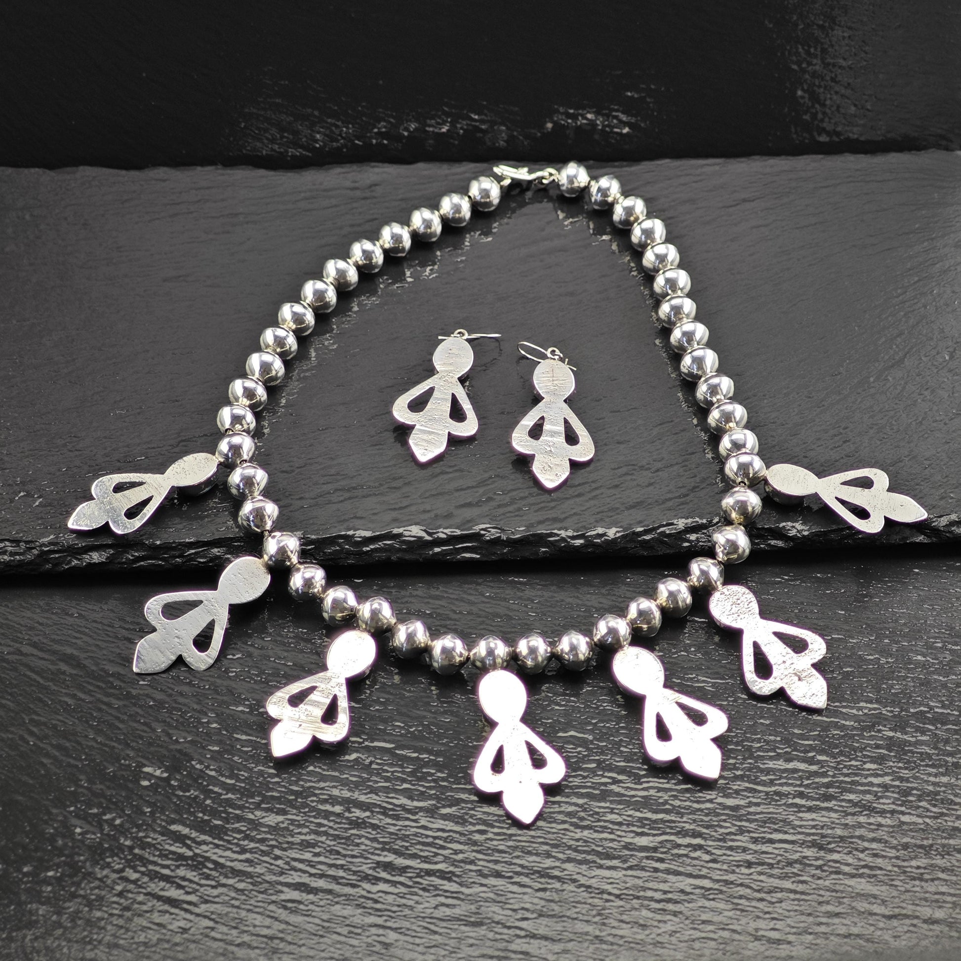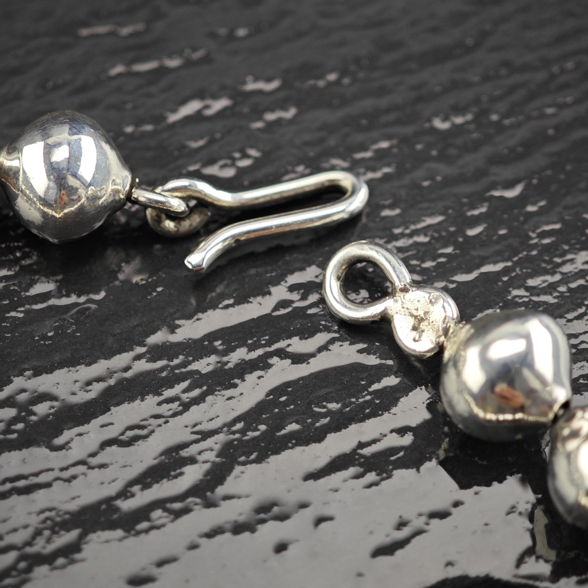 This handmade set dates back to the 1970s and features uniquely crafted beads that reflect the artistry of the era. Please note that variations in color seen in the photographs are due to reflections; in person, the silver presents a beautiful, even tone.