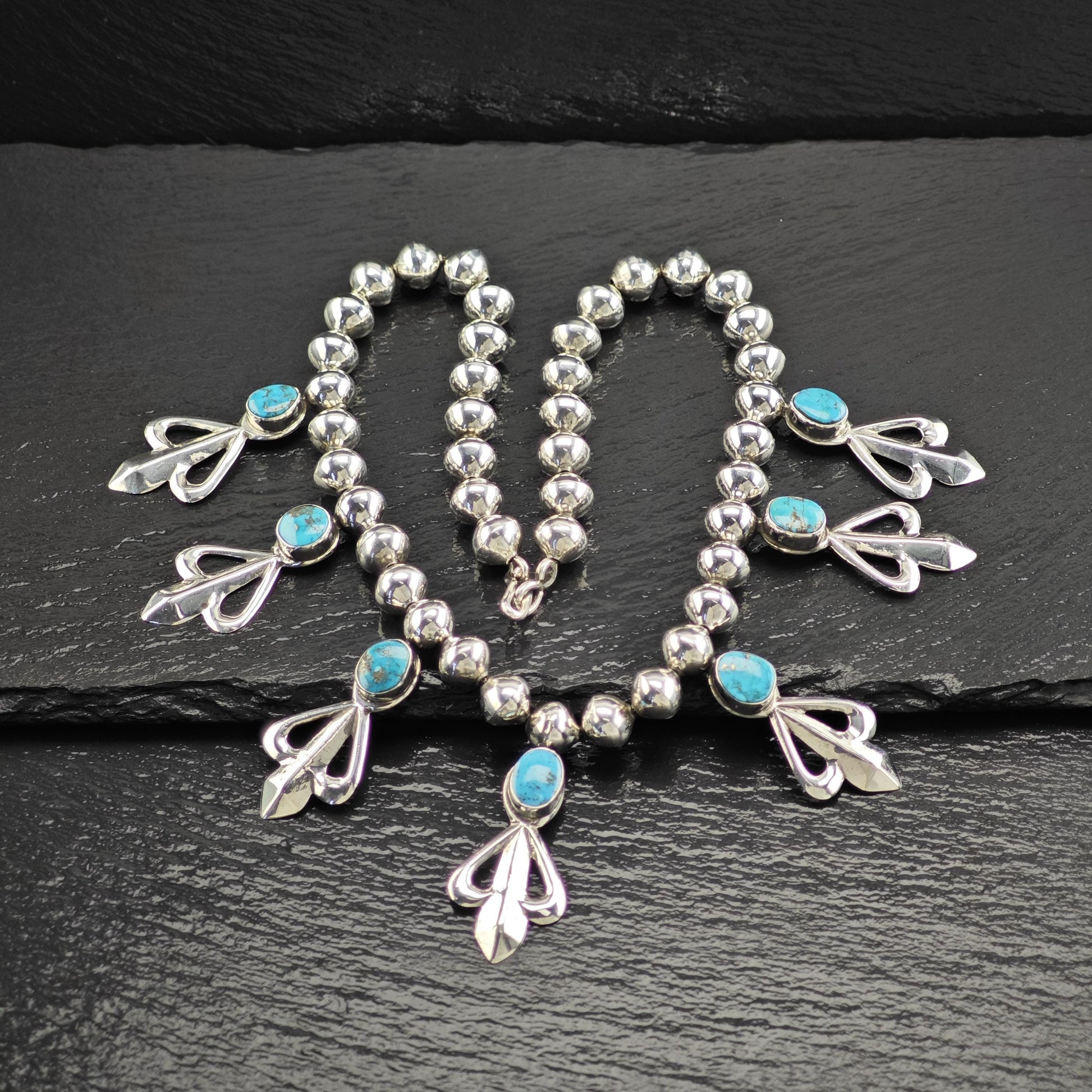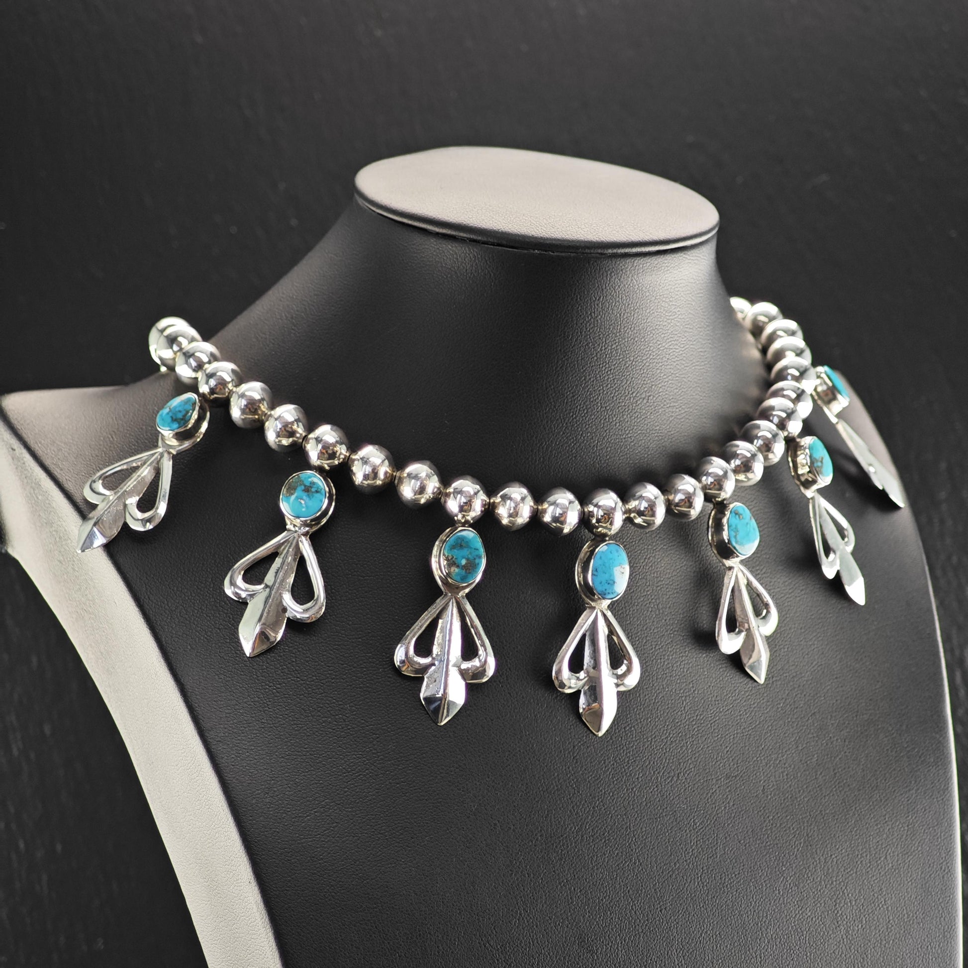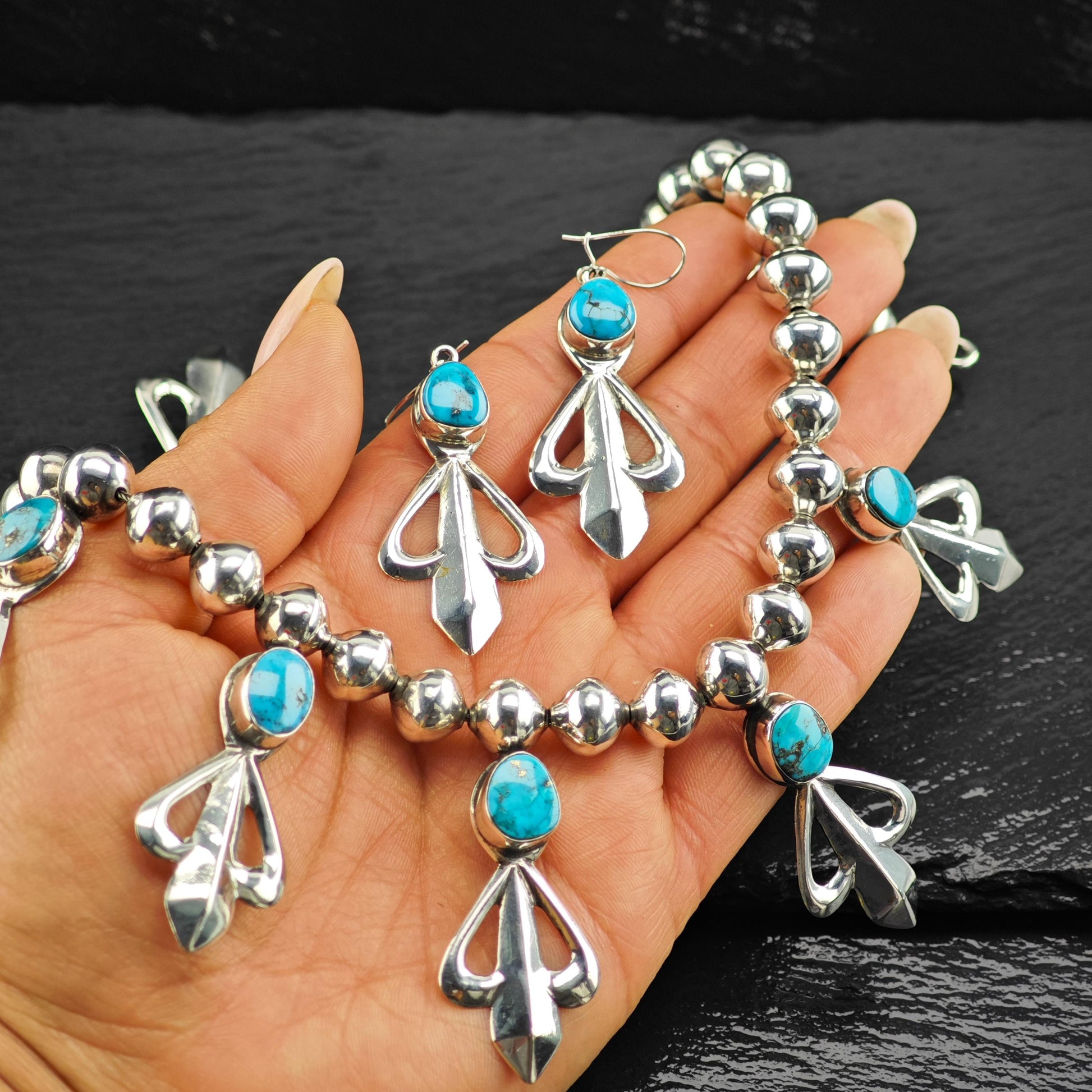 Discover the exquisite craftsmanship of this Vintage Native American Sterling Silver Necklace and Earring Set, featuring stunning blue turquoise beads. This unique jewelry set, perfect for collectors and enthusiasts alike, showcases the rich heritage of Native American artistry.