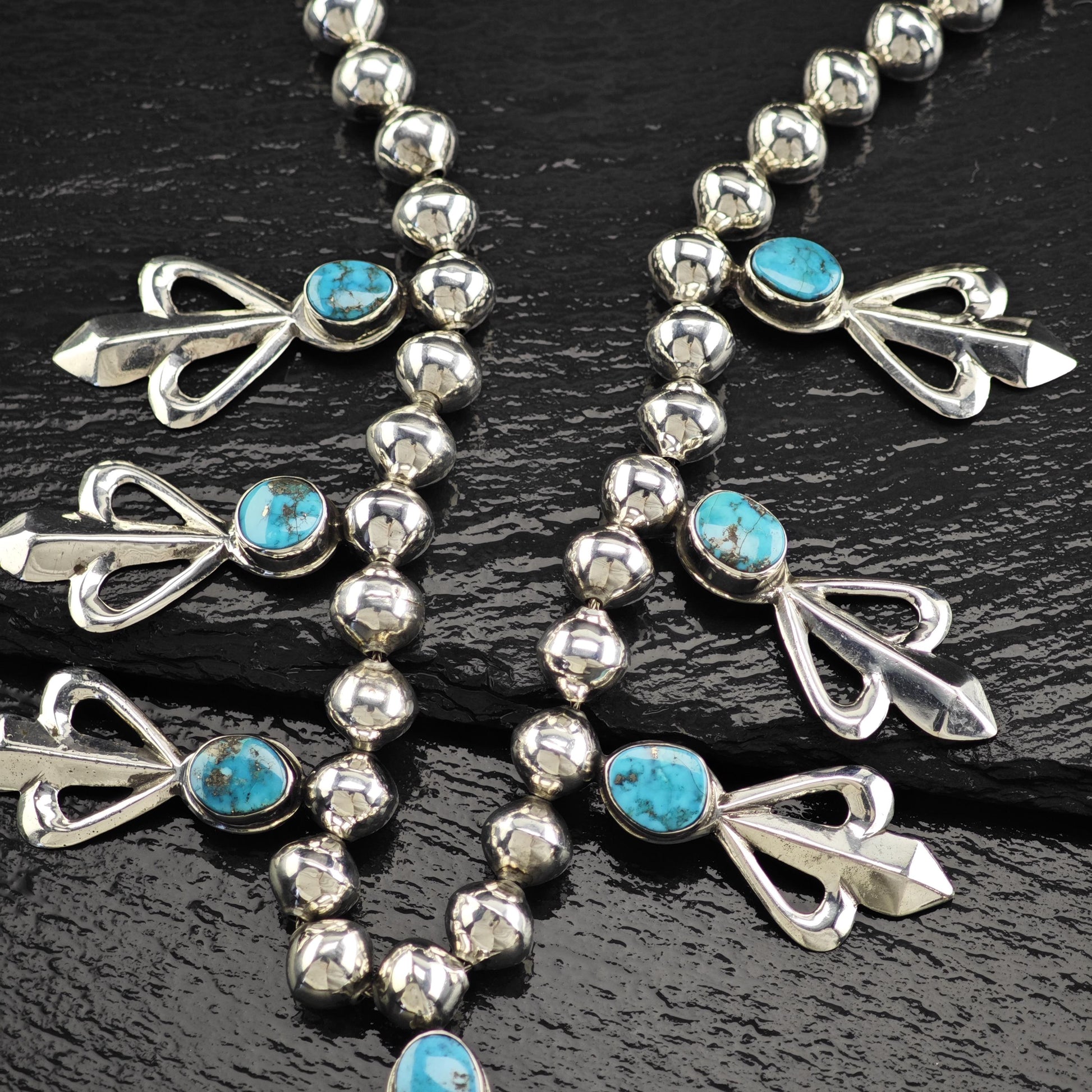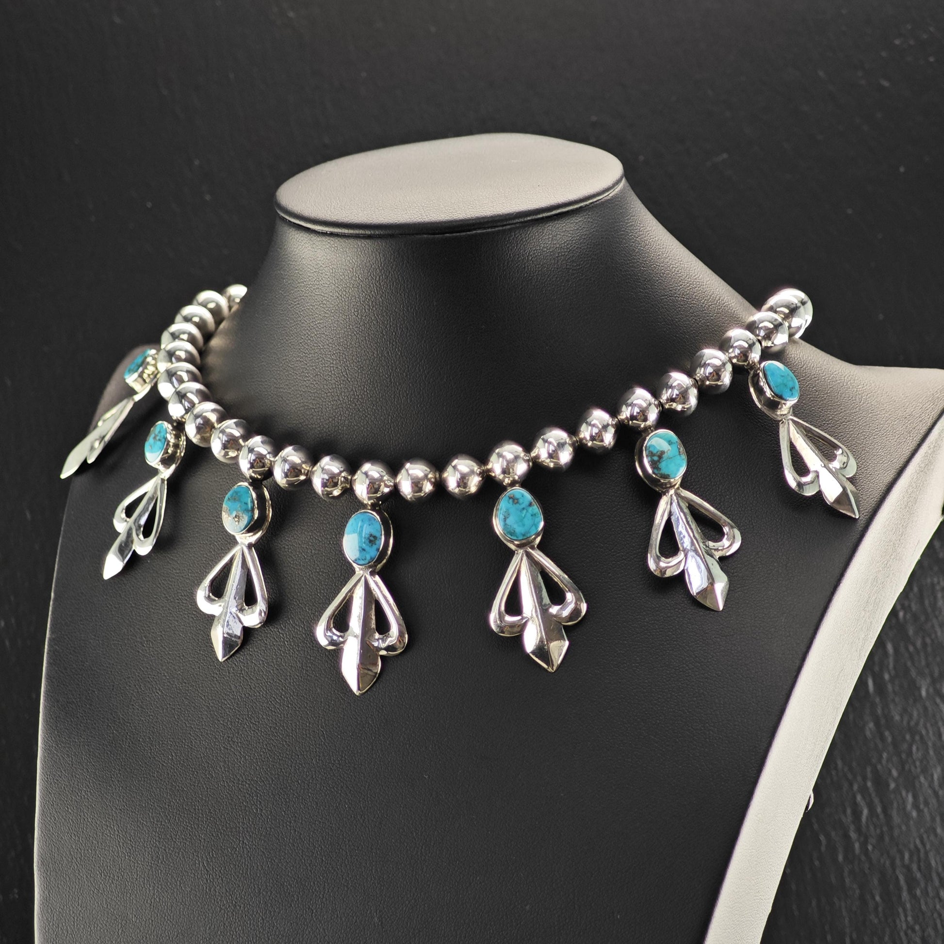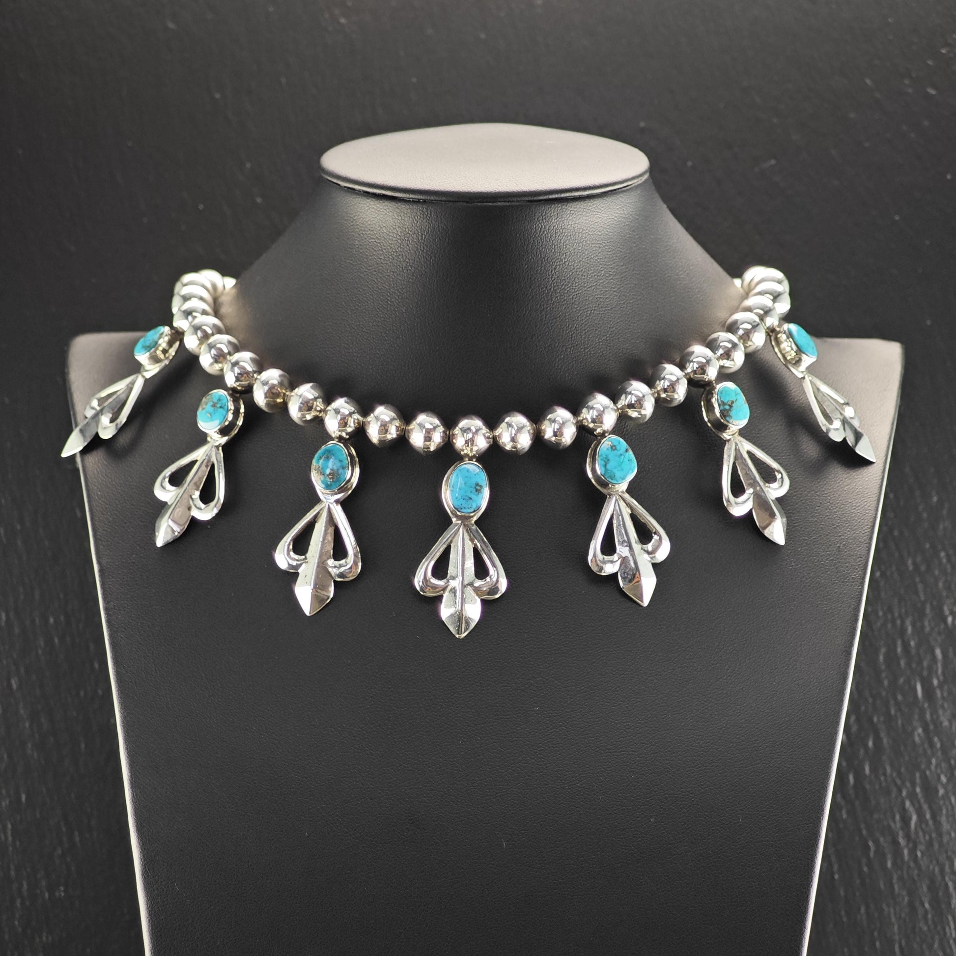 Discover the exquisite craftsmanship of this Vintage Native American Sterling Silver Necklace and Earring Set, featuring stunning blue turquoise beads. This unique jewelry set, perfect for collectors and enthusiasts alike, showcases the rich heritage of Native American artistry.